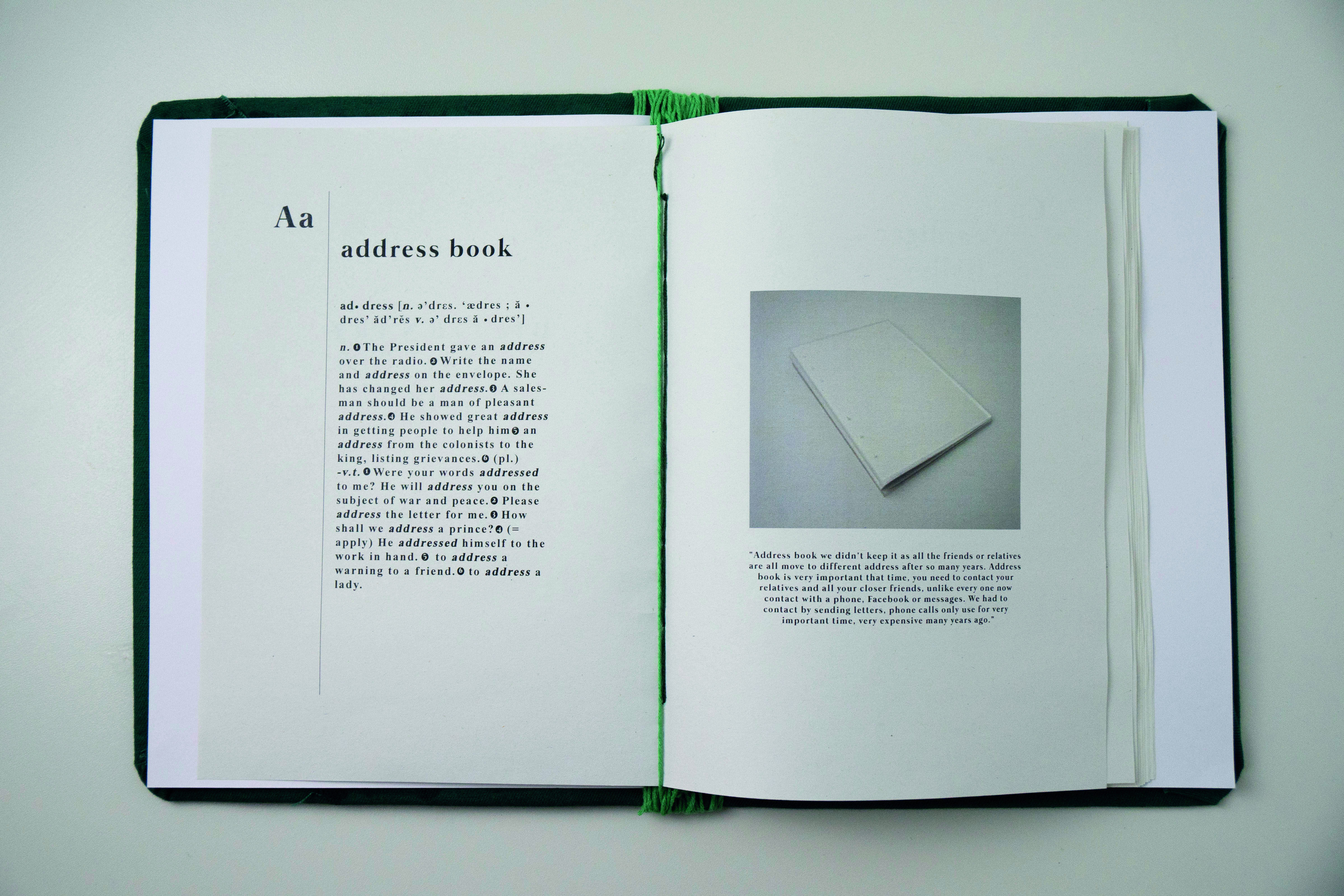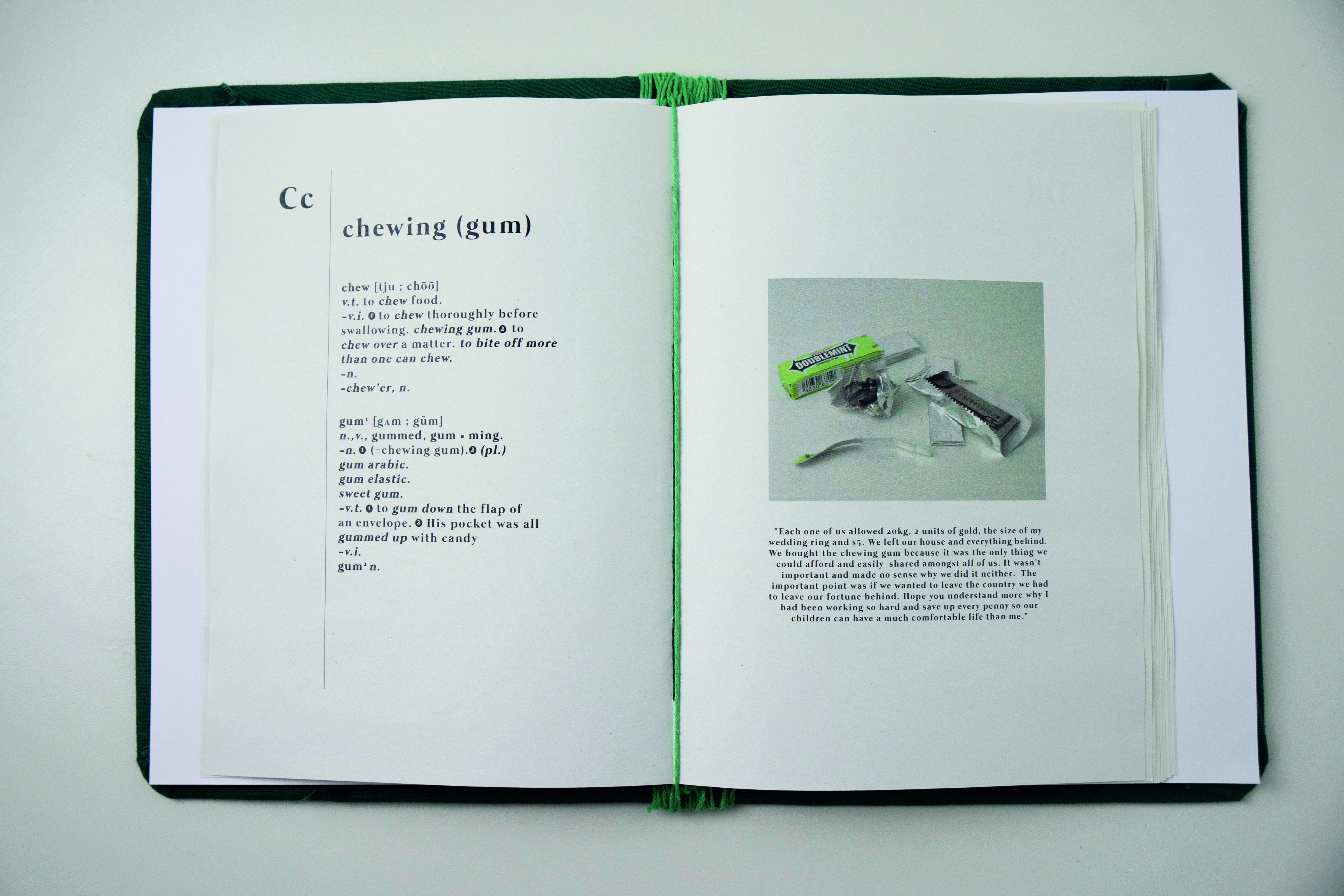 Through the dislocation of the dictionary, interpreting one language into another can often end in a mistranslation. I chose to represent the notion of what migrants choose to bring with them by collating their possessions into a dictionary of objects. Within this dictionary are the personal items my mother and her sisters chose to take with them; photos, their father’s brush pen, jewellery etc. Through this archival practice of documentation, I am portraying the strong attachment that some objects could hold.