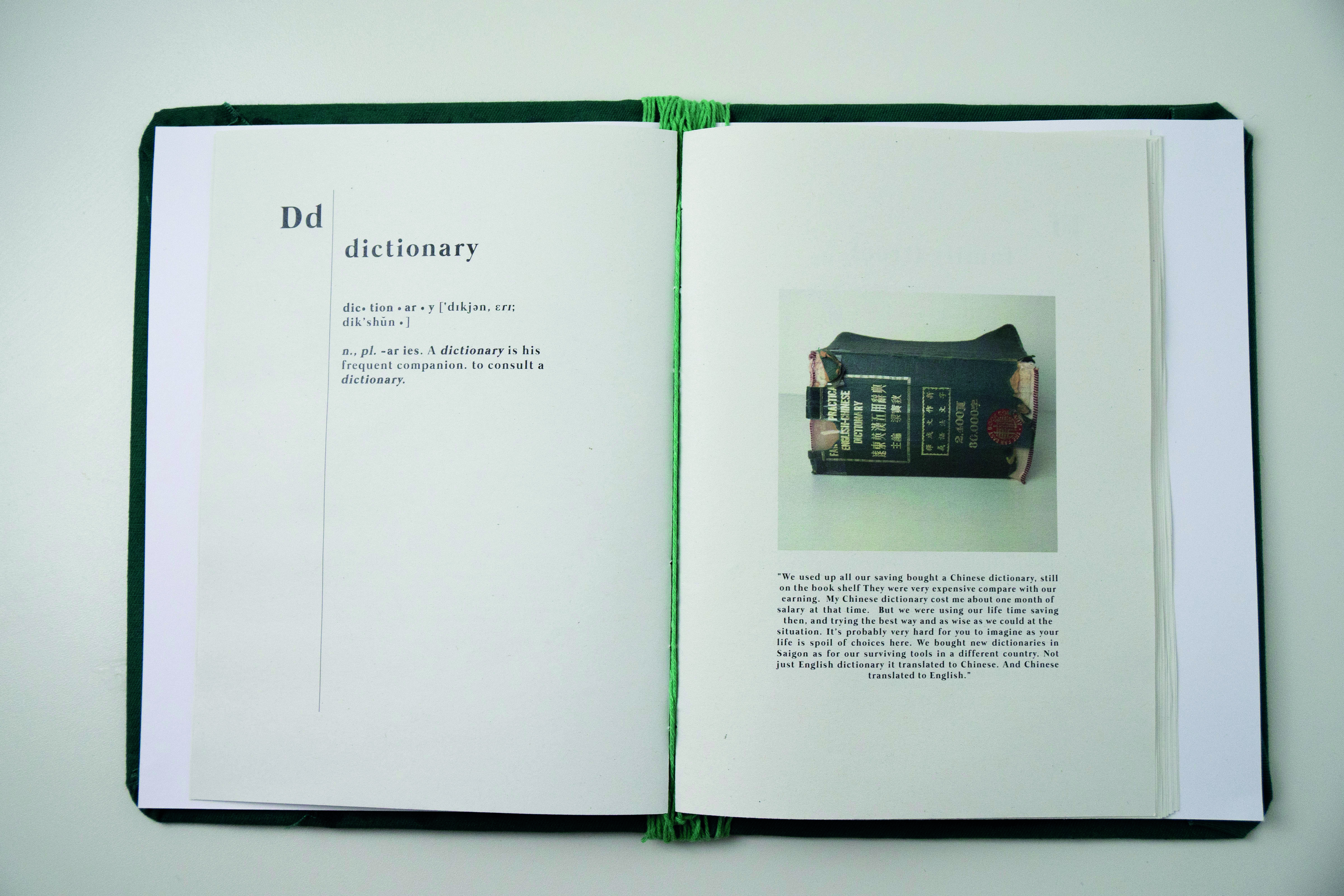 As one of the refugees, my mother was forced to migrate to the UK and had to condense everything she owned into a bag weighing just 20kg. She can recall details about each one of the possessions she chose to bring with her, even if it has a violent memory attached to it.I have chosen to focus on one of these items in particular, a dictionary from Saigon. It translates Chinese into English and vice versa. It is a tool for learning -a bridge for communication in a foreign country. Out of the 20kg, it is the only object that can be localised to that context and associated to that era. I have looked into this dictionary and analysed how some of the words were re-appropriated. Today, some phrases would seem very outdated, but perhaps telling of that particular time.