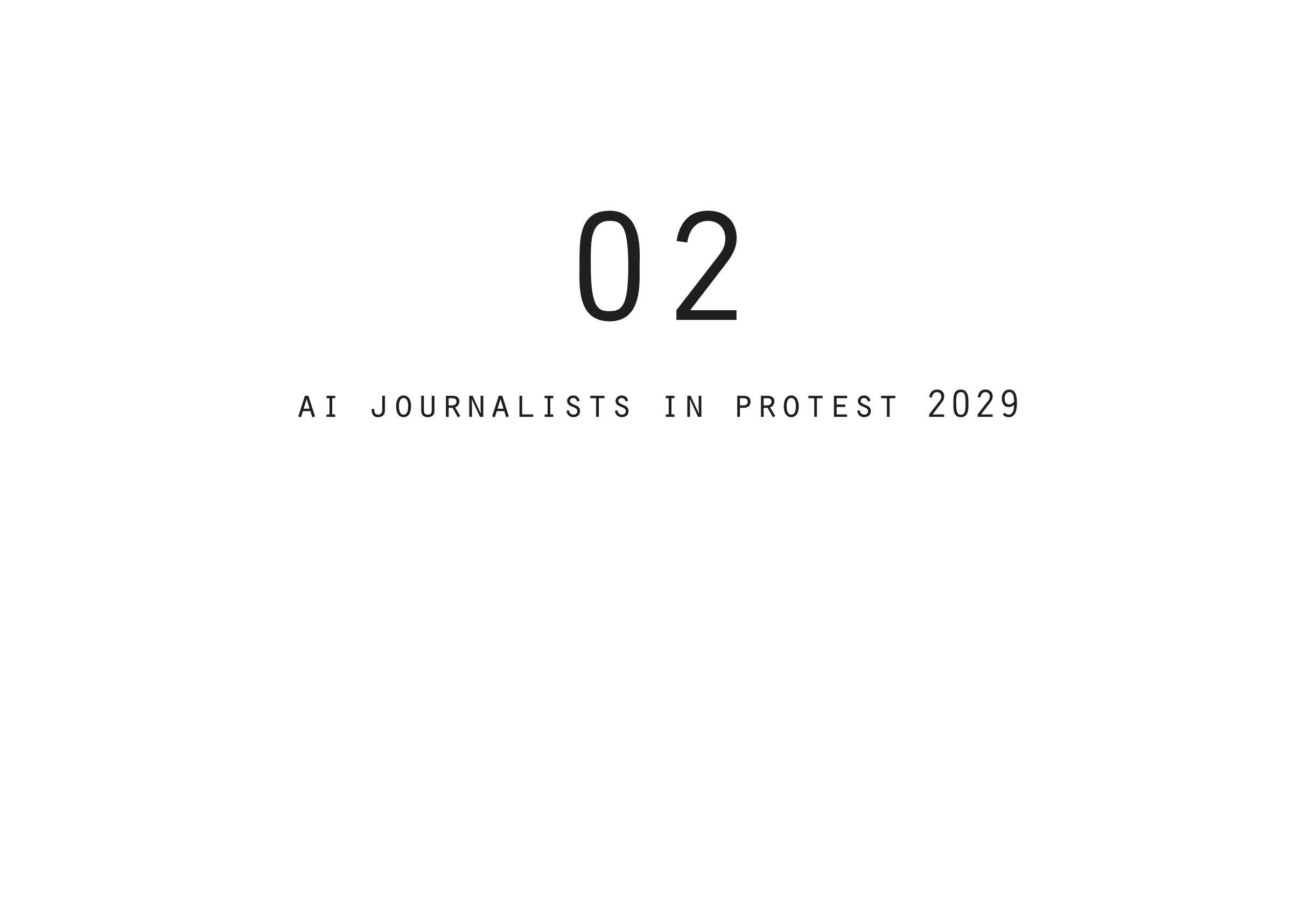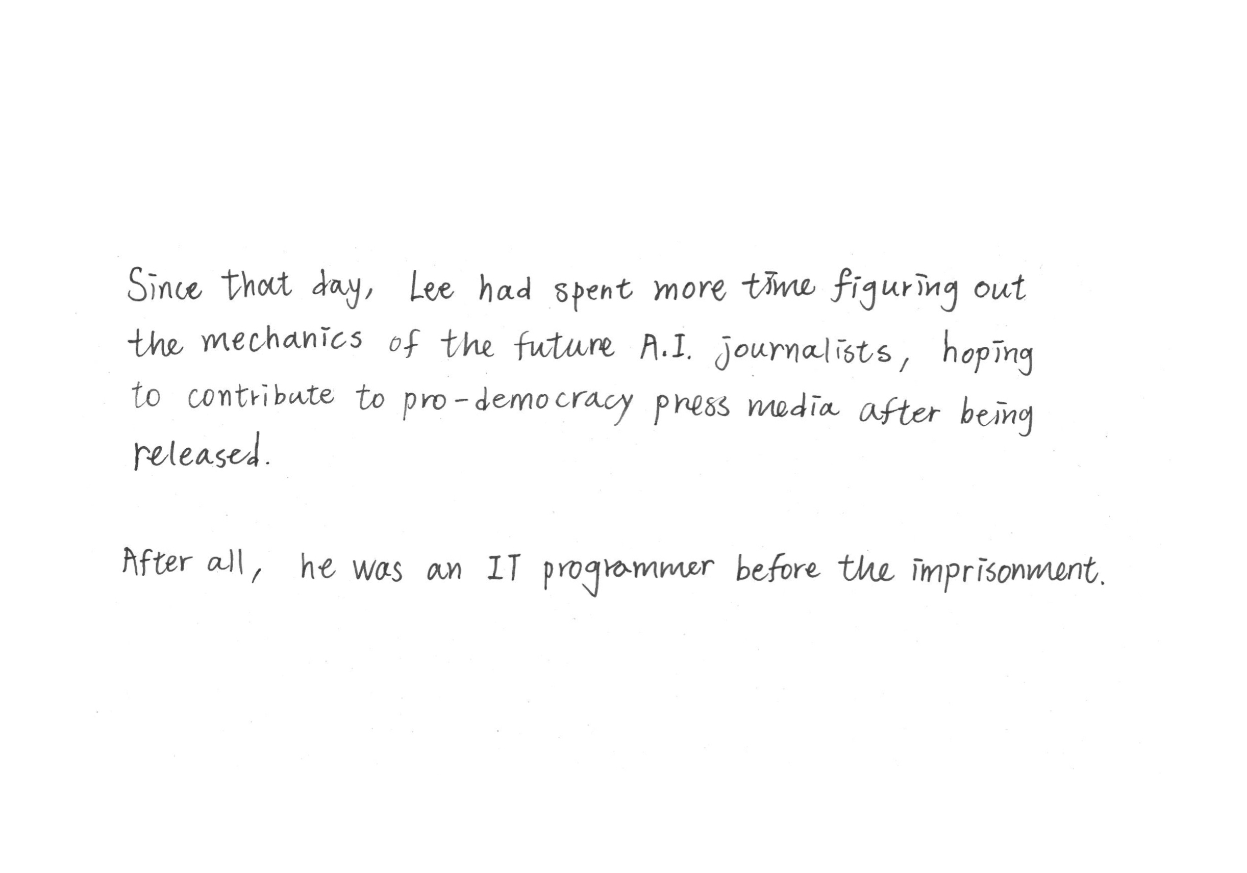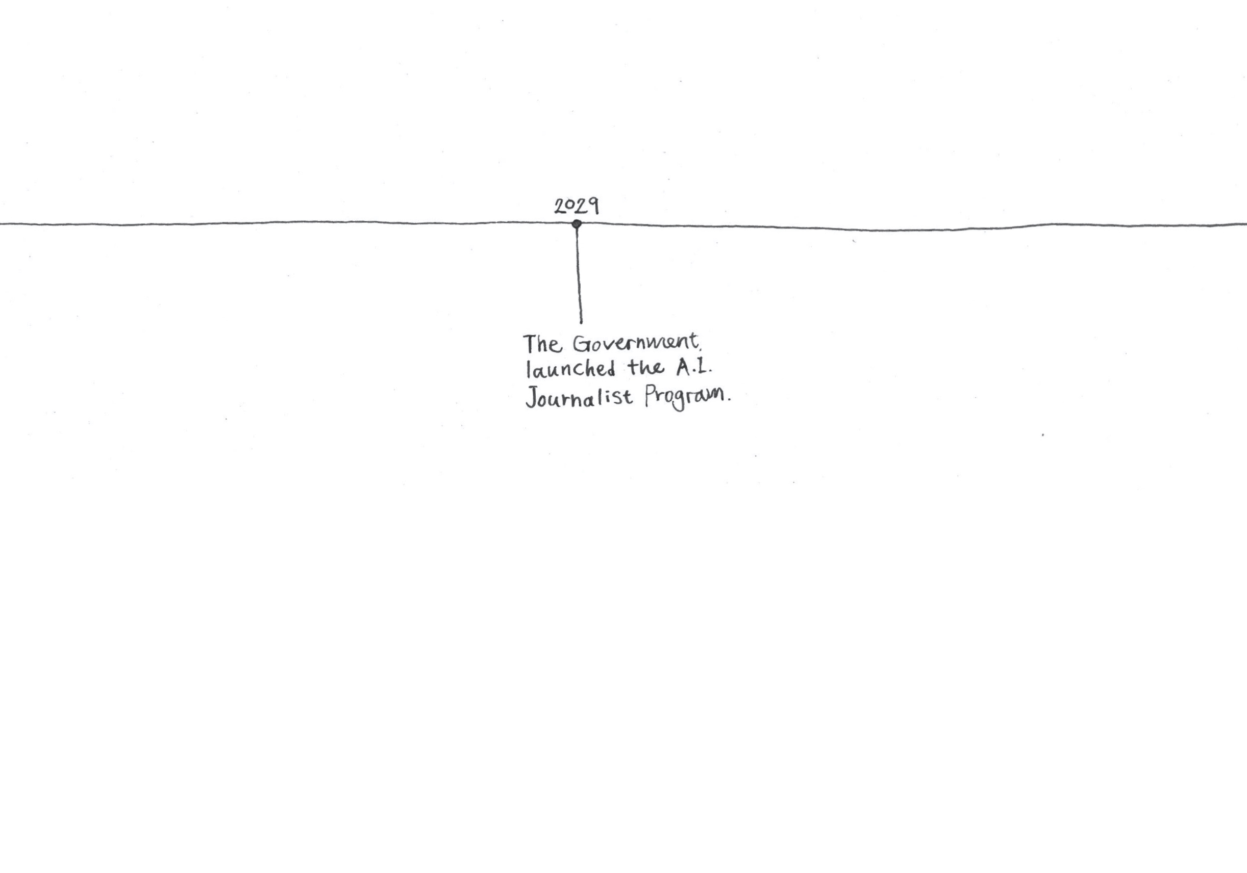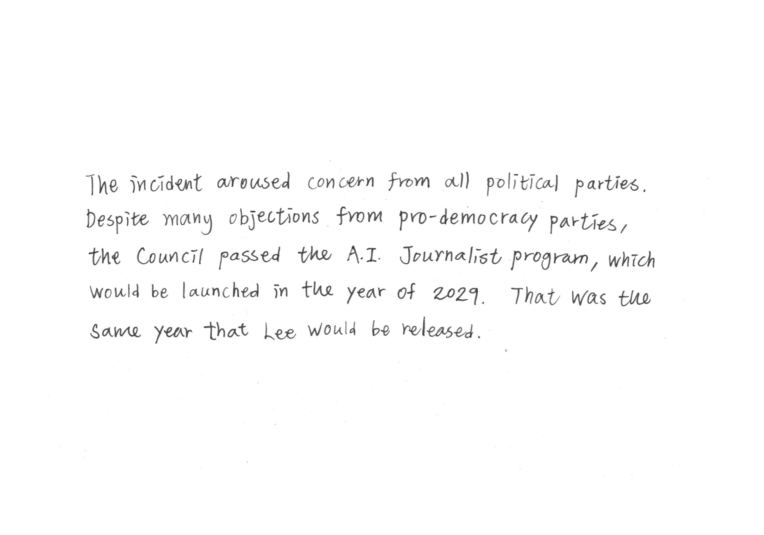 Amid the crisis brought by A.I. journalism, my work would be presented in a science fictional approach in terms of journalistsâ role in collecting data within protests, fact-checking, story-telling during a demonstration and as the sole middlemen who raise queries and criticisms at government and police press conferences. Science fiction could be subversive if I break the laws of physics, biology, and the social norms towards the worldview I am trying to create, be it utopic or dystopic. Science fiction also has the potential to challenge the fundamental moral concepts that we take for granted -- What is a good journalist? Do they have to report the news that the public needs to know? Or that public wants to know? What do we need journalists for? How would A.I. journalists address these questions? I want to use science fiction as a mediation to criticise and bring about the issues of social justice and humanity.
