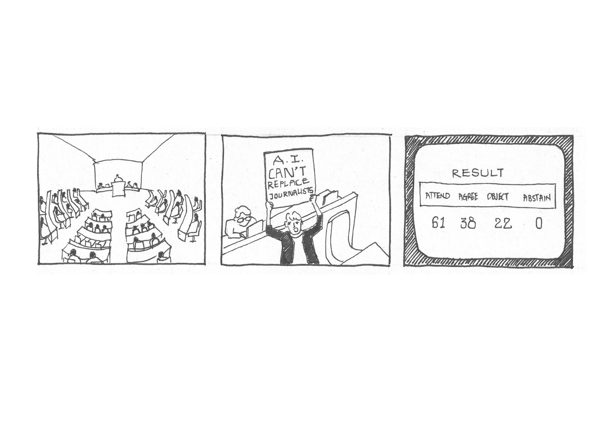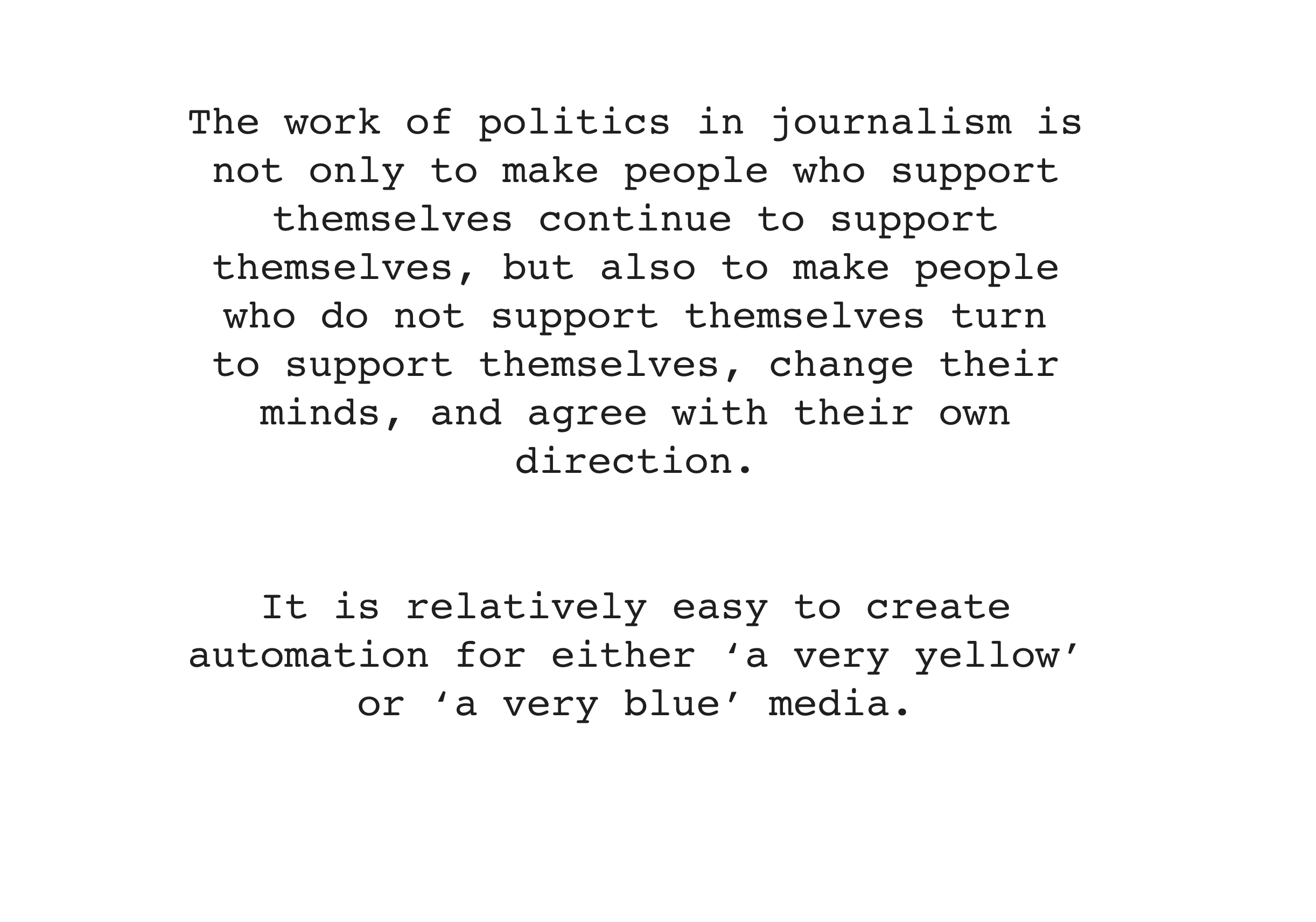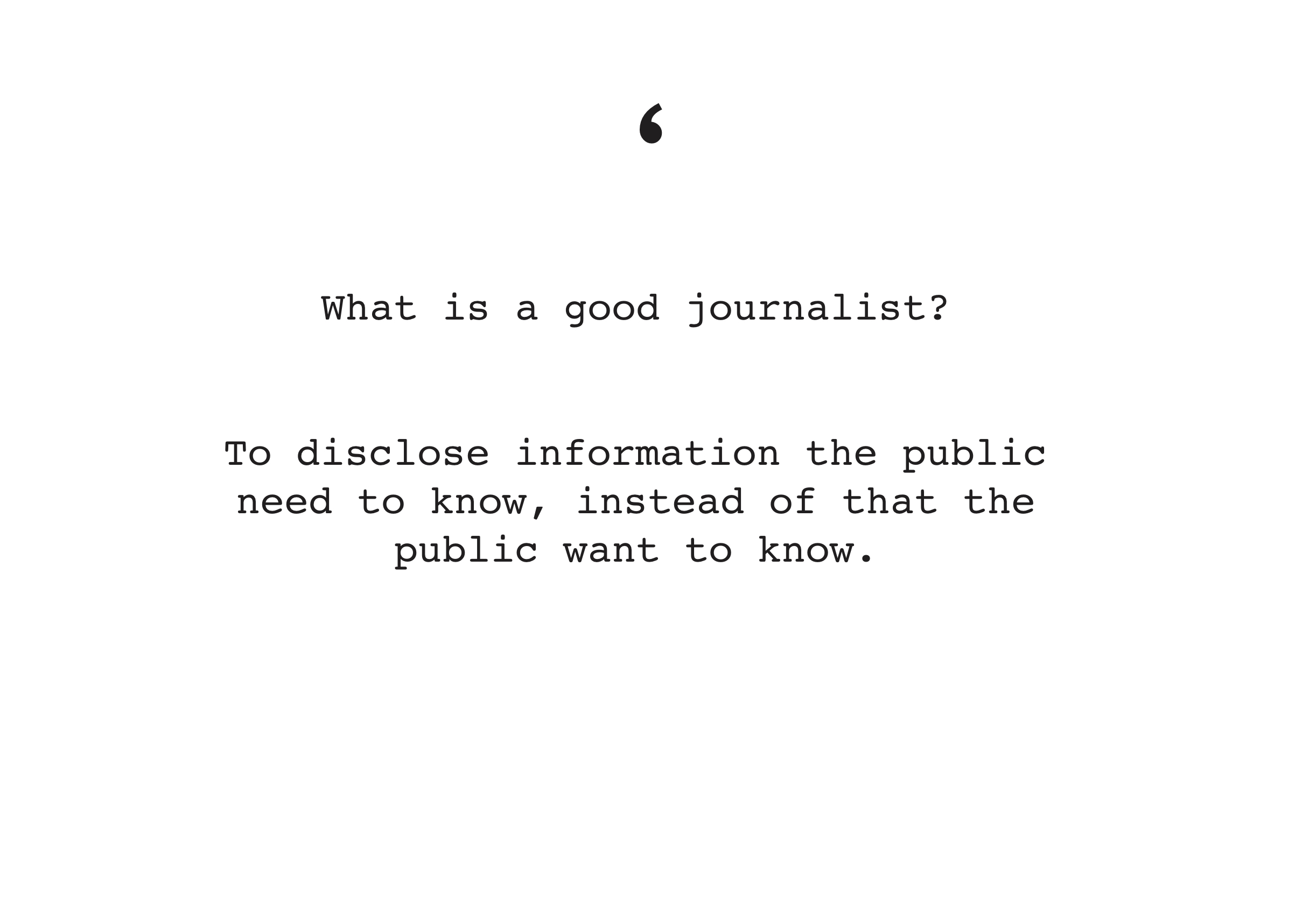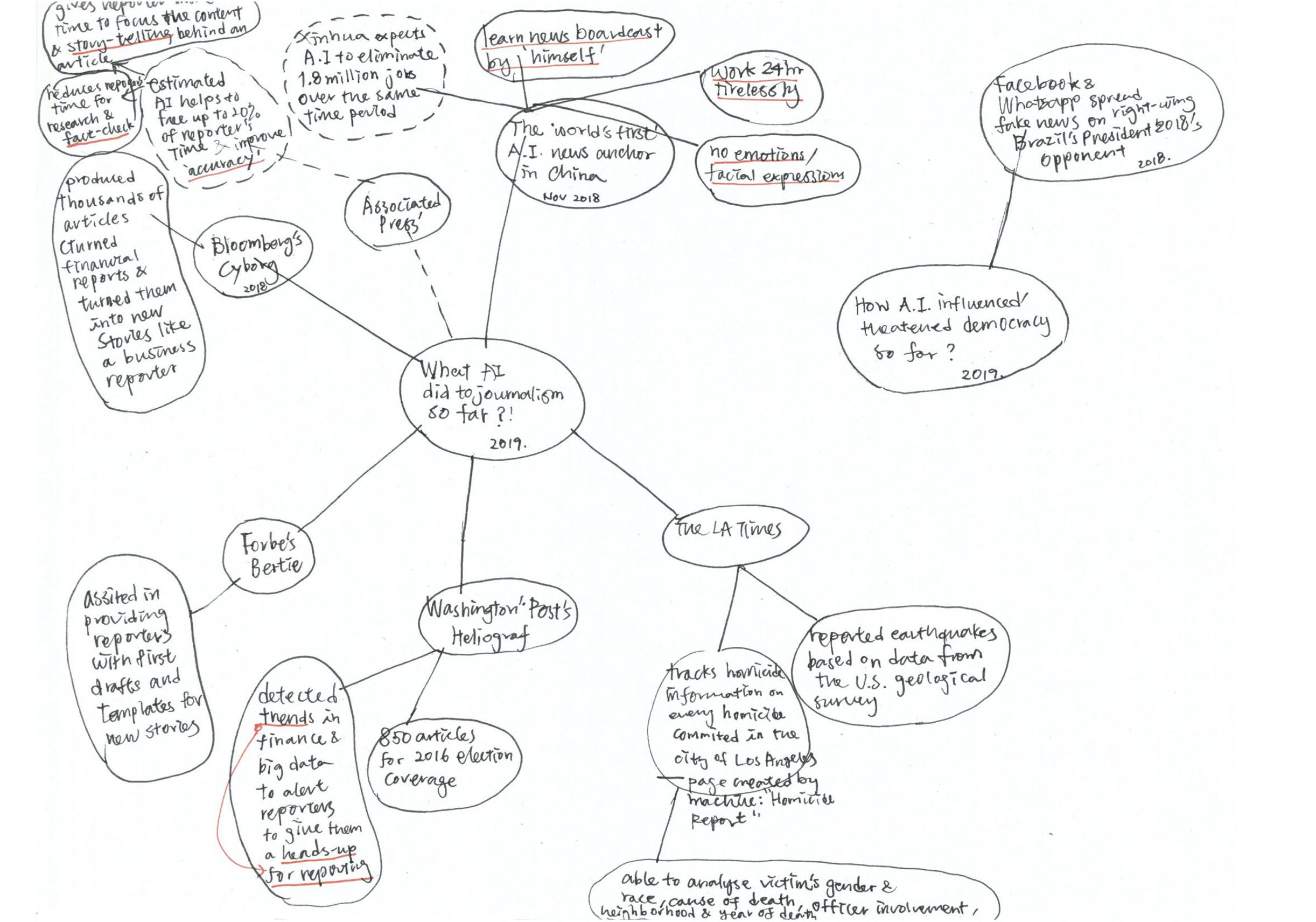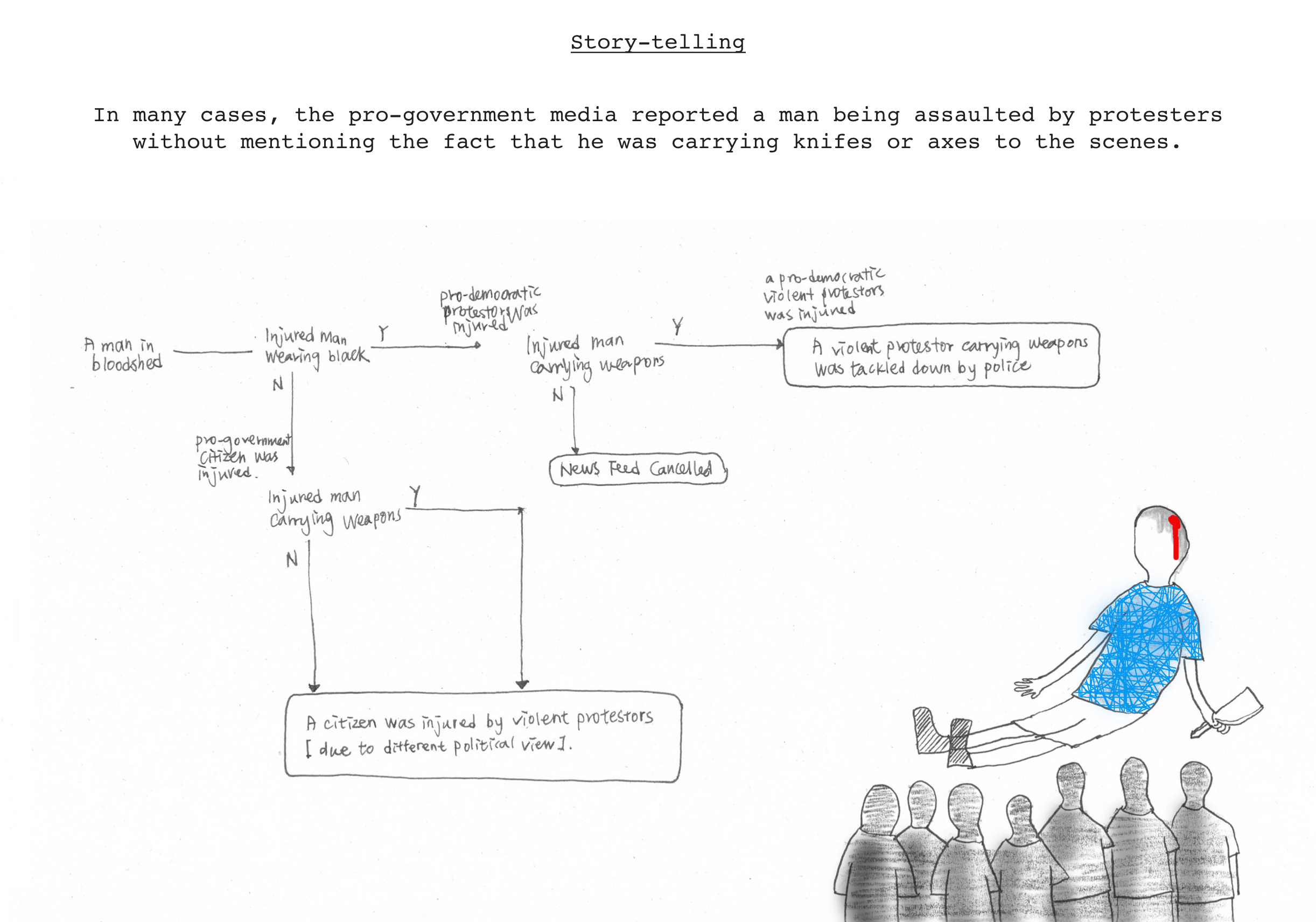 Amid the crisis brought by A.I. journalism, my work would be presented in a science fictional approach in terms of journalistsâ role in collecting data within protests, fact-checking, story-telling during a demonstration and as the sole middlemen who raise queries and criticisms at government and police press conferences. Science fiction could be subversive if I break the laws of physics, biology, and the social norms towards the worldview I am trying to create, be it utopic or dystopic. Science fiction also has the potential to challenge the fundamental moral concepts that we take for granted -- What is a good journalist? Do they have to report the news that the public needs to know? Or that public wants to know? What do we need journalists for? How would A.I. journalists address these questions? I want to use science fiction as a mediation to criticise and bring about the issues of social justice and humanity.