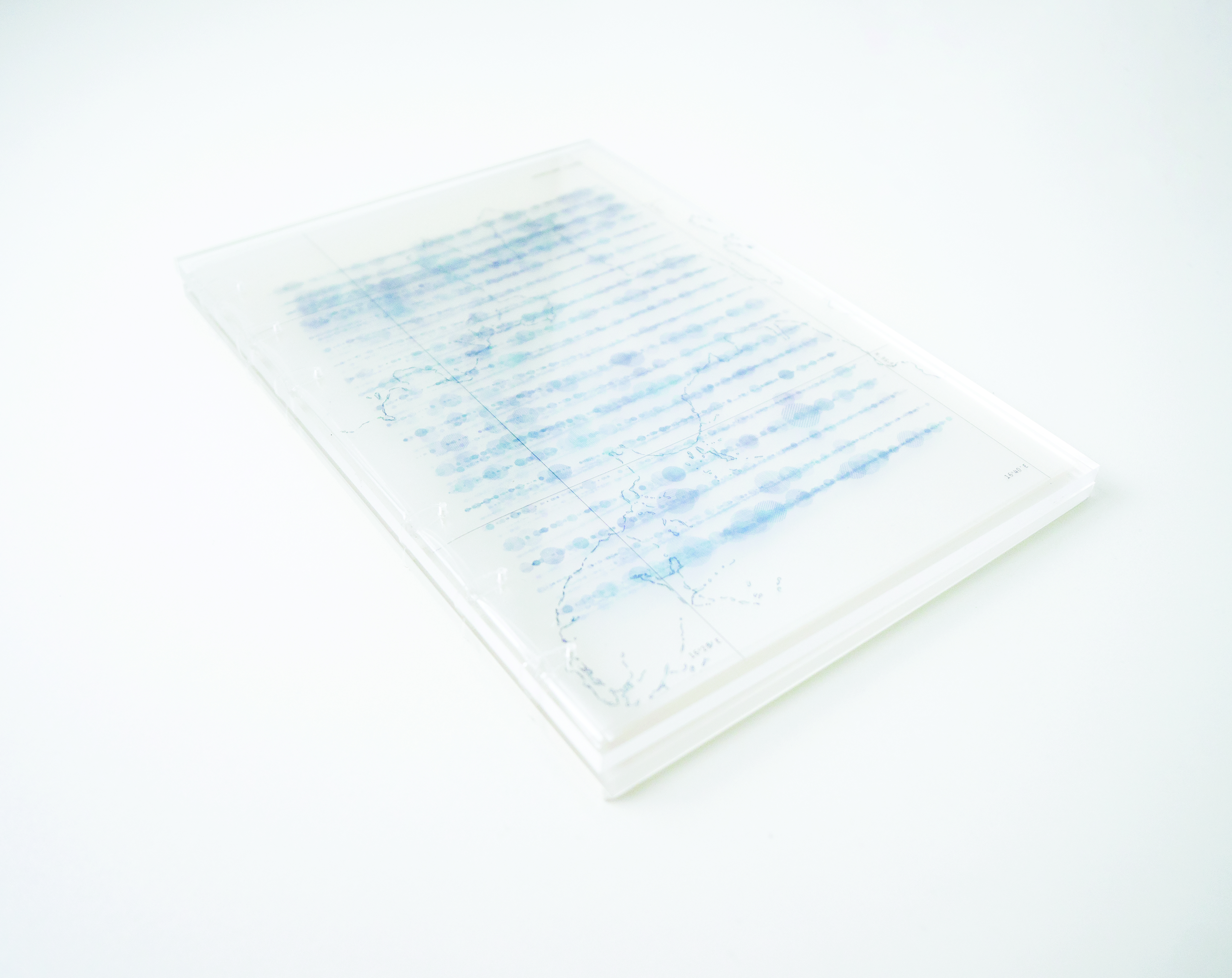 To realise this, spectrograms were extracted from recordings and reimagined using graphic representations of the acoustic 'bubbles'. These 'music sheets' are than collated into a translucent book. The graphical representation of the book itself mediates the ice aesthetically through its translucency, colours and patterns.
