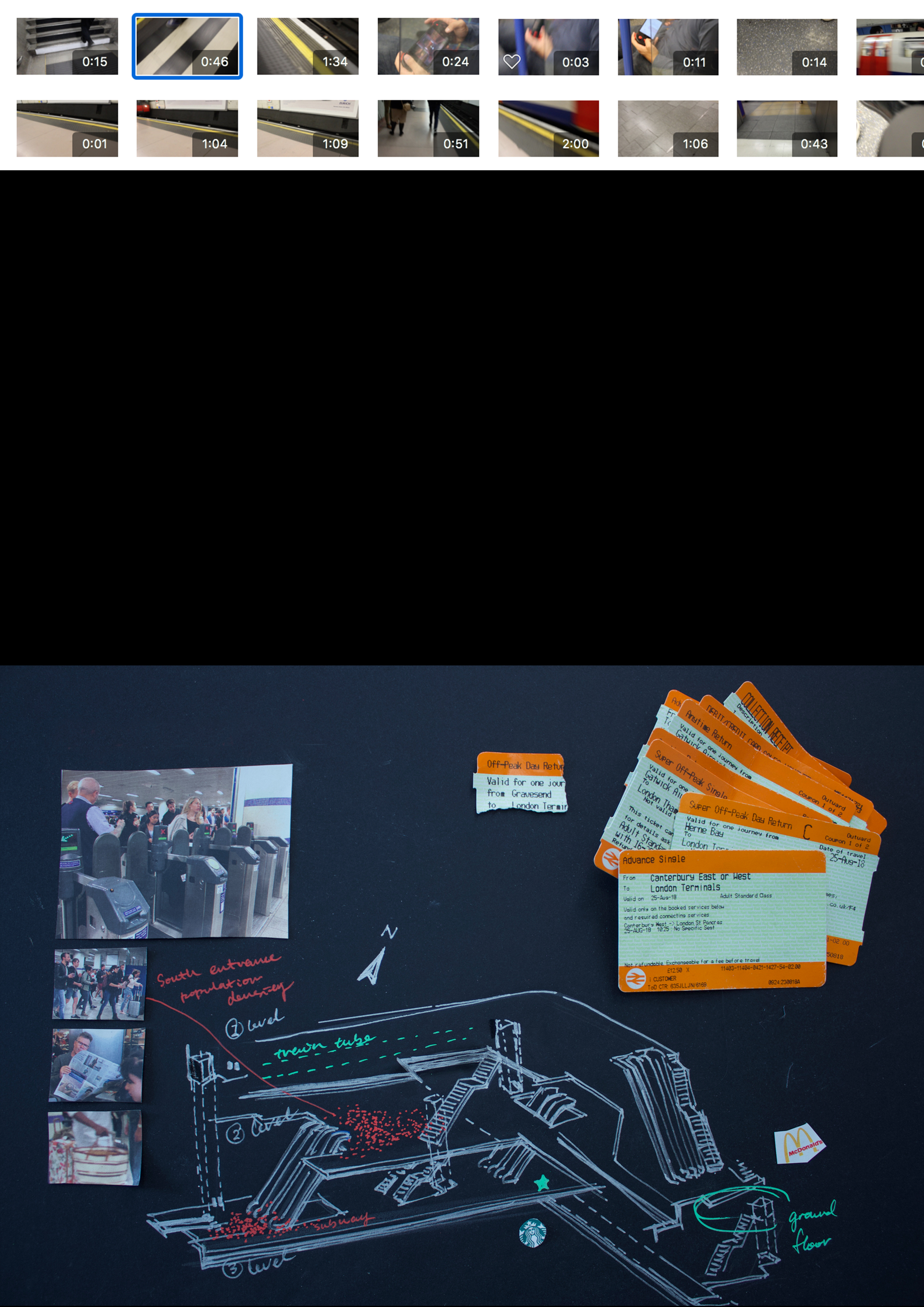 My process of mediation mainly focuses on three phrases, dream recording, evidence collection and final outcome production. I started my primary research by recording my own dreams and discovered that the London Tubes became the routine scene in my everyday dreams. Throughout the mornings of these couple months, I wrote down diaries about Tube stations appeared in my dreams. After I waked up, I traced back to the locations for information collection, formats include note taking, unconscious movement recording, object collection and video recordings.