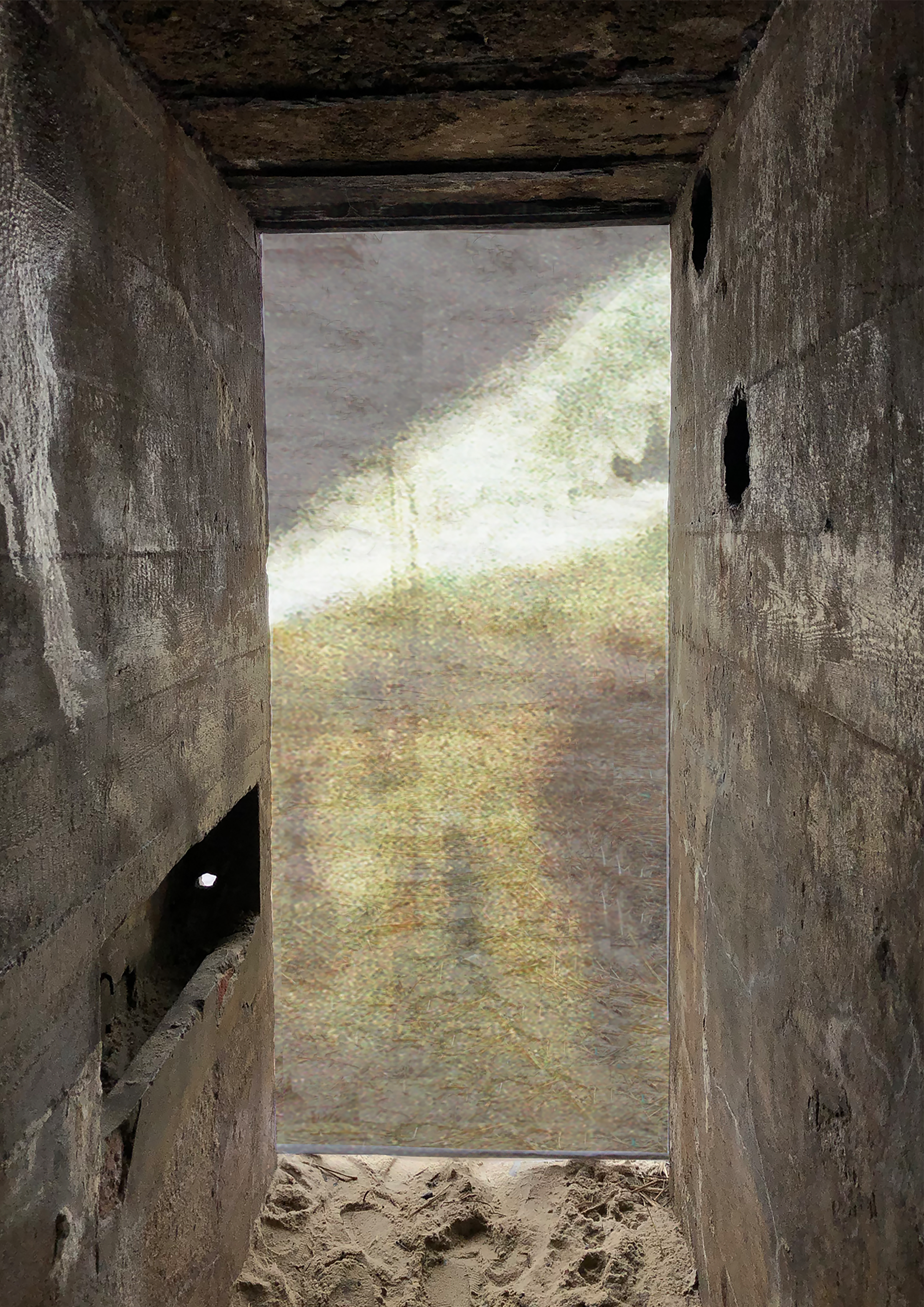 As a way of highlighting these conflicting feelings, I made a camera obscure within one of the bunkers. I then printed one of the images in 1:1 on transparent silk, which I used to recreate the bunker as a camera obscura. My aim was to make a spatial intervention that shows the contrast between the appealing aesthetics of the bunker as part of the beautiful Danish coastal landscape, and the abhorrent history that is materialised through the architecture of the bunker.