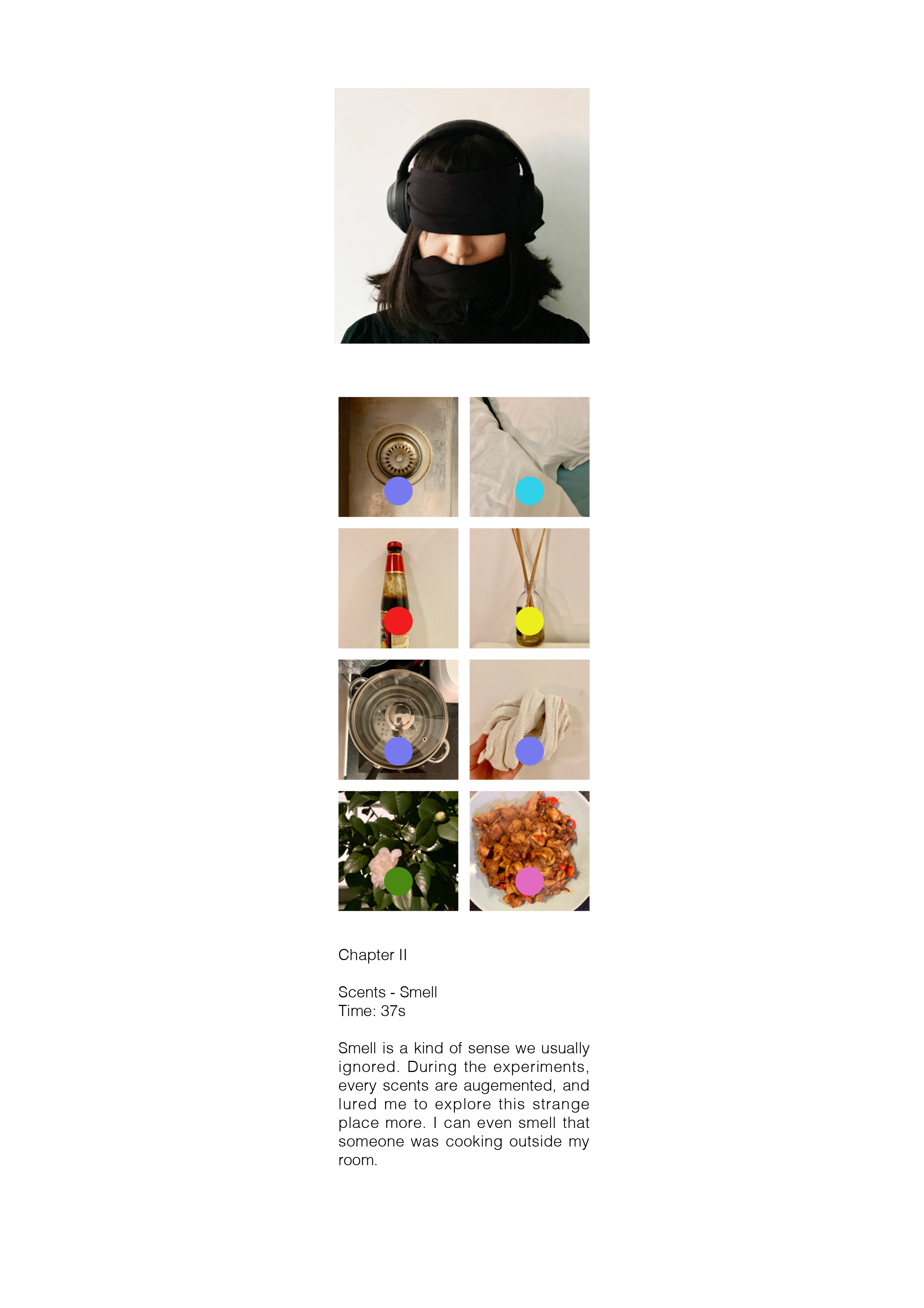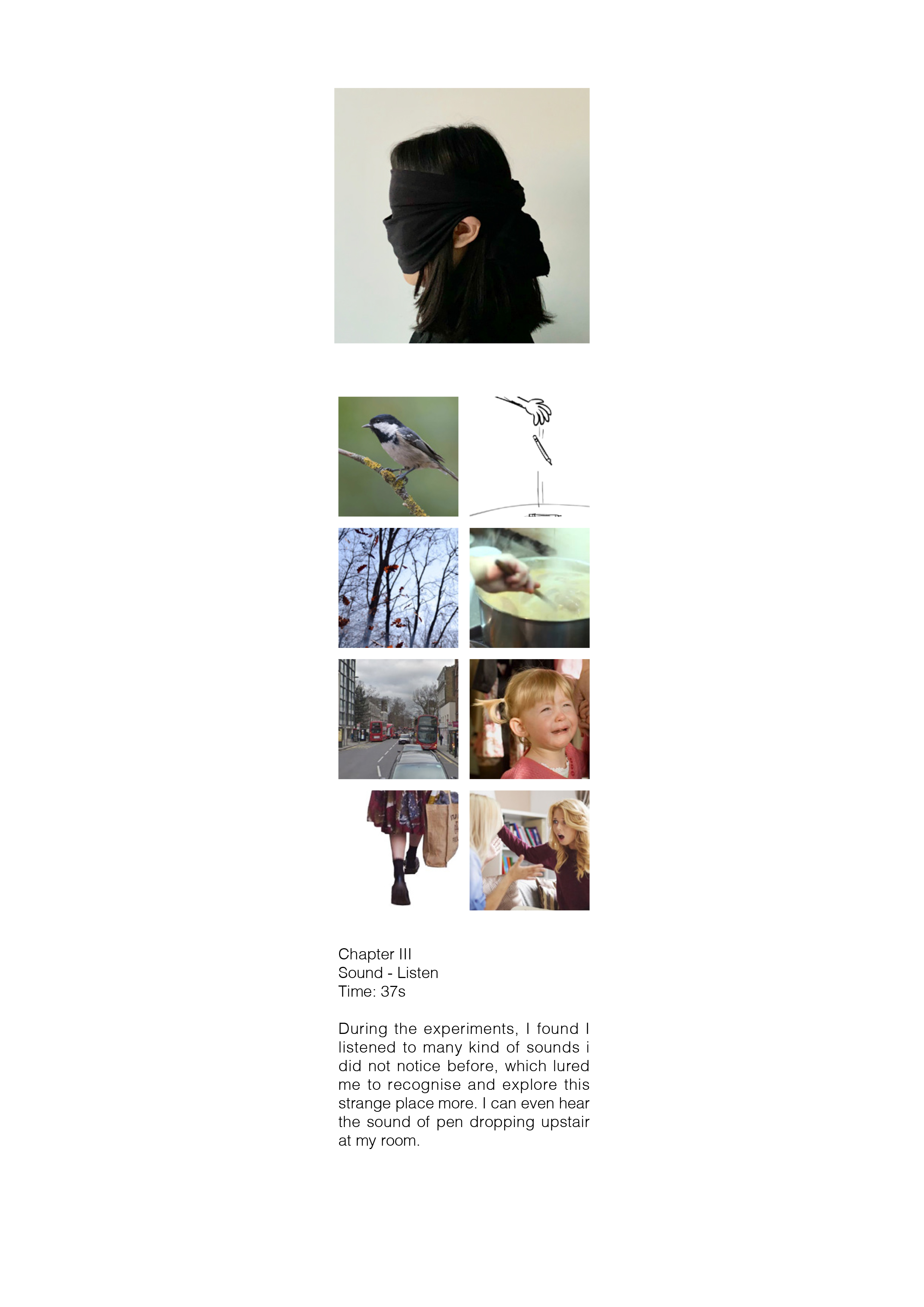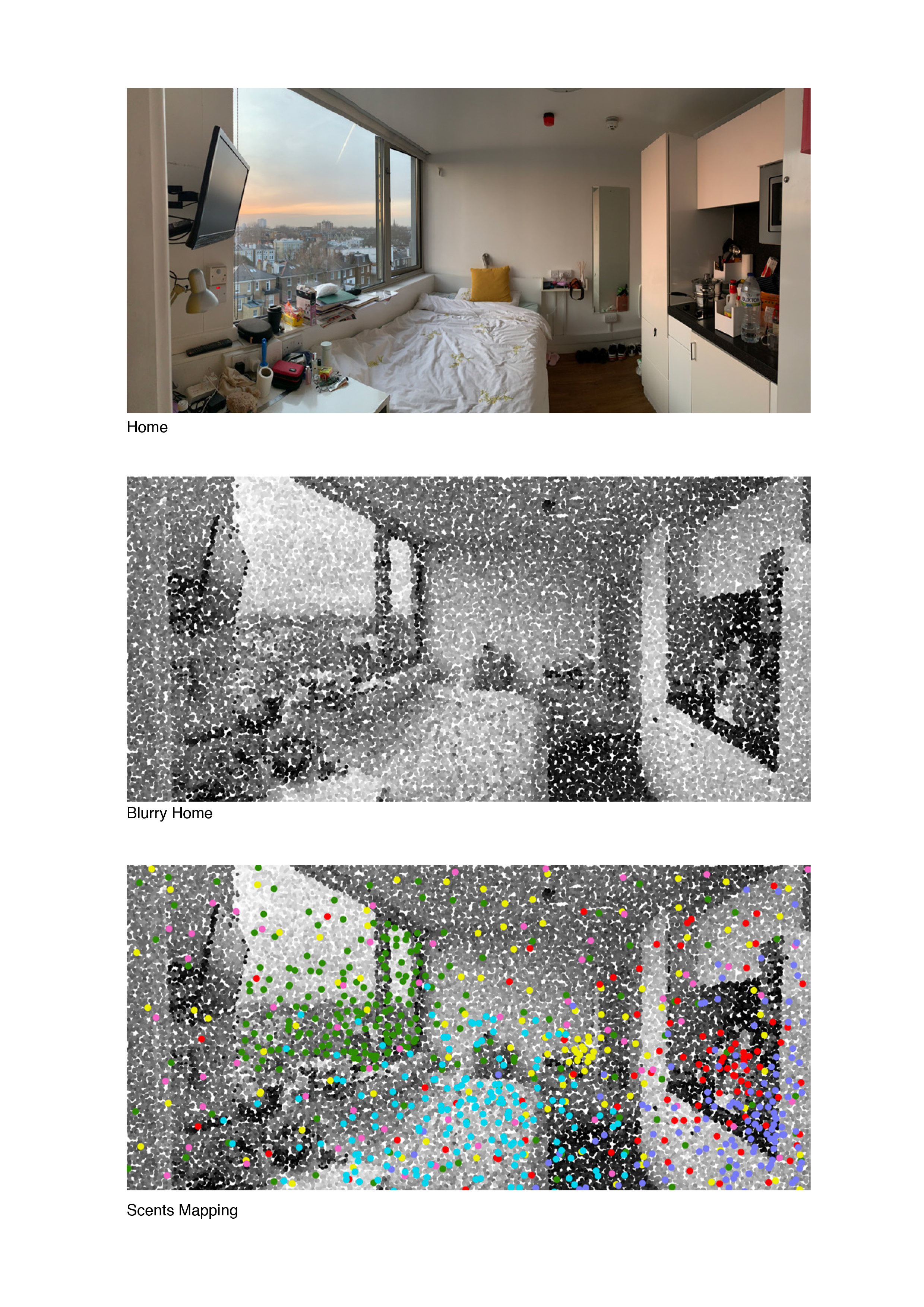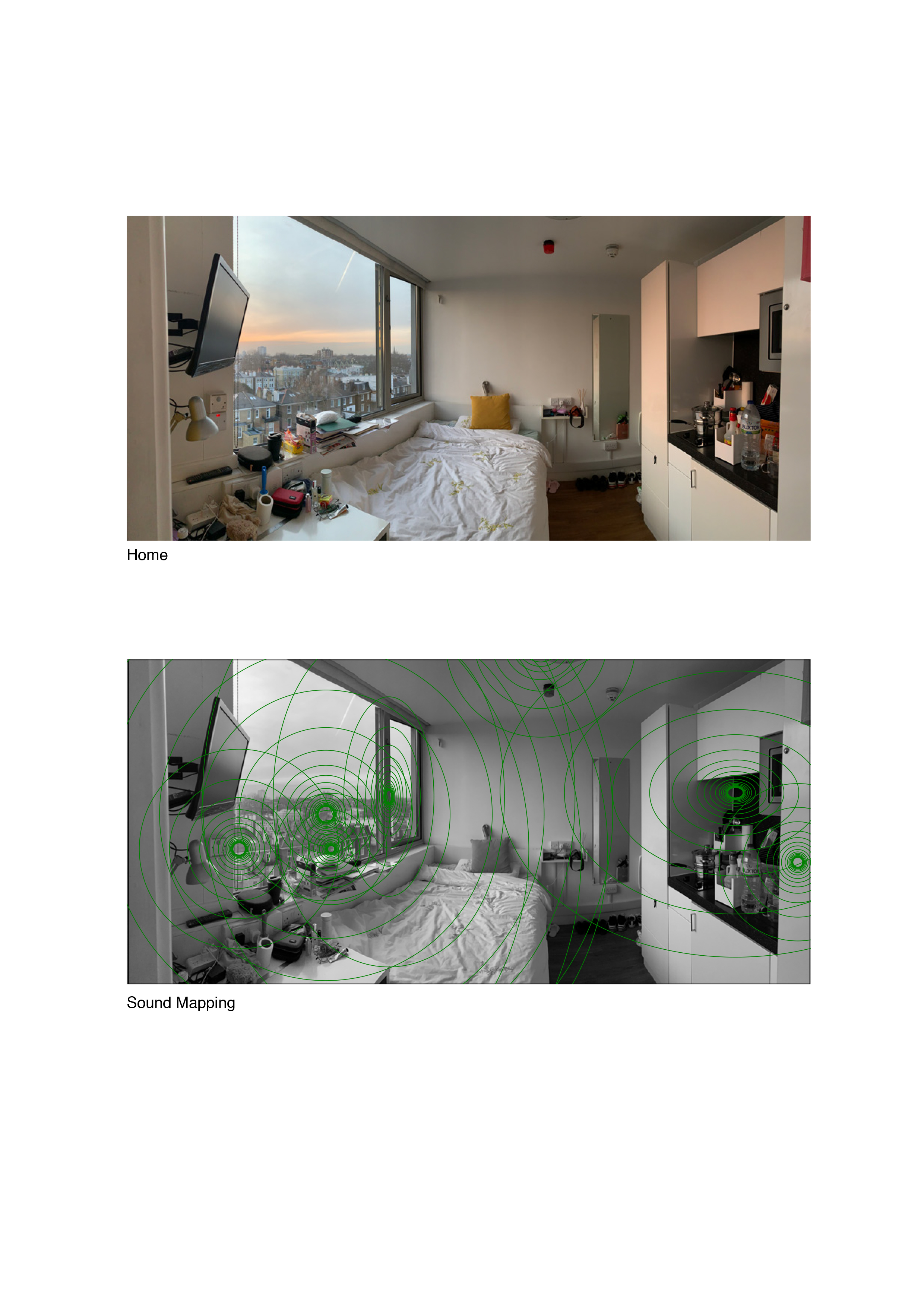Through my project I want to challenge the concept of commonly used maps by highlighting intangible boundaries, and try to visualise atmosphere as a form of intangible existence. I do this through the experience of my own home. I have recorded the process, analysed the reaction, and mapped out the influences at the time of the recording. For my video, I recorded 4 experimental processes of experiencing familiar home atmosphere in an âabnormal wayâ. In order to distinguish between my usual multi-sensory way of experiencing my home environment, I focused on one sense at a time. These separate experiences have been visualised and mapped out according to the following parameters: