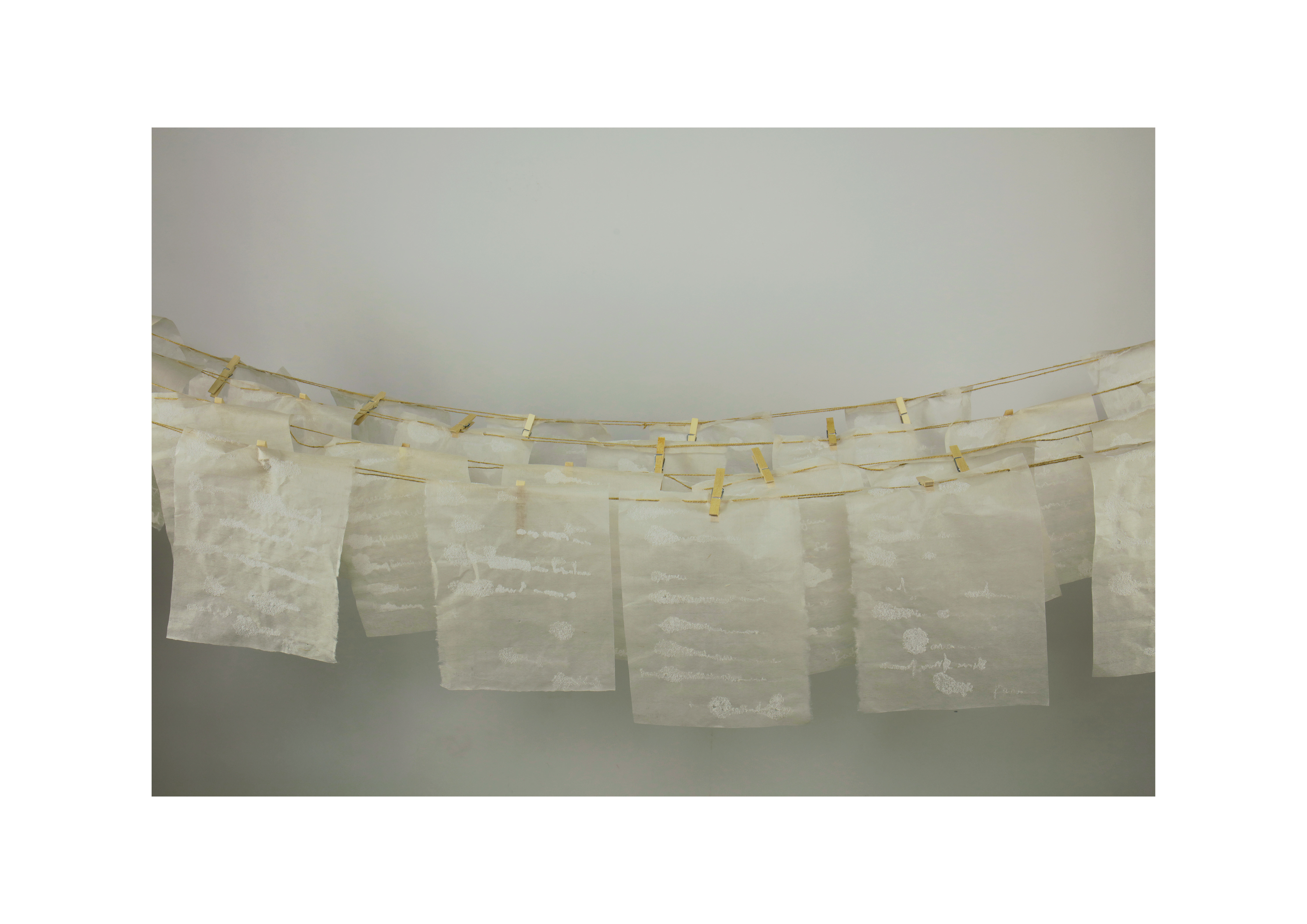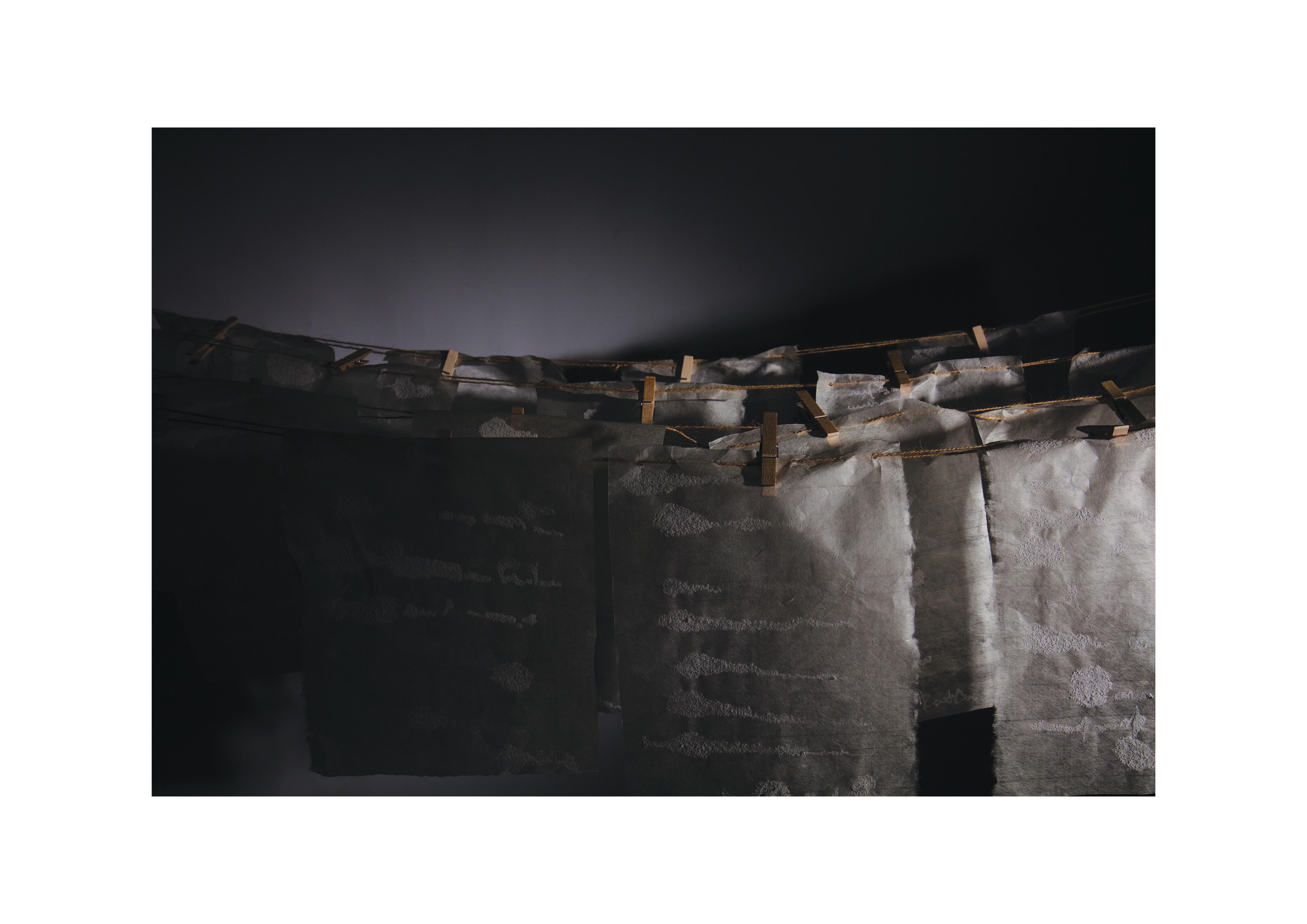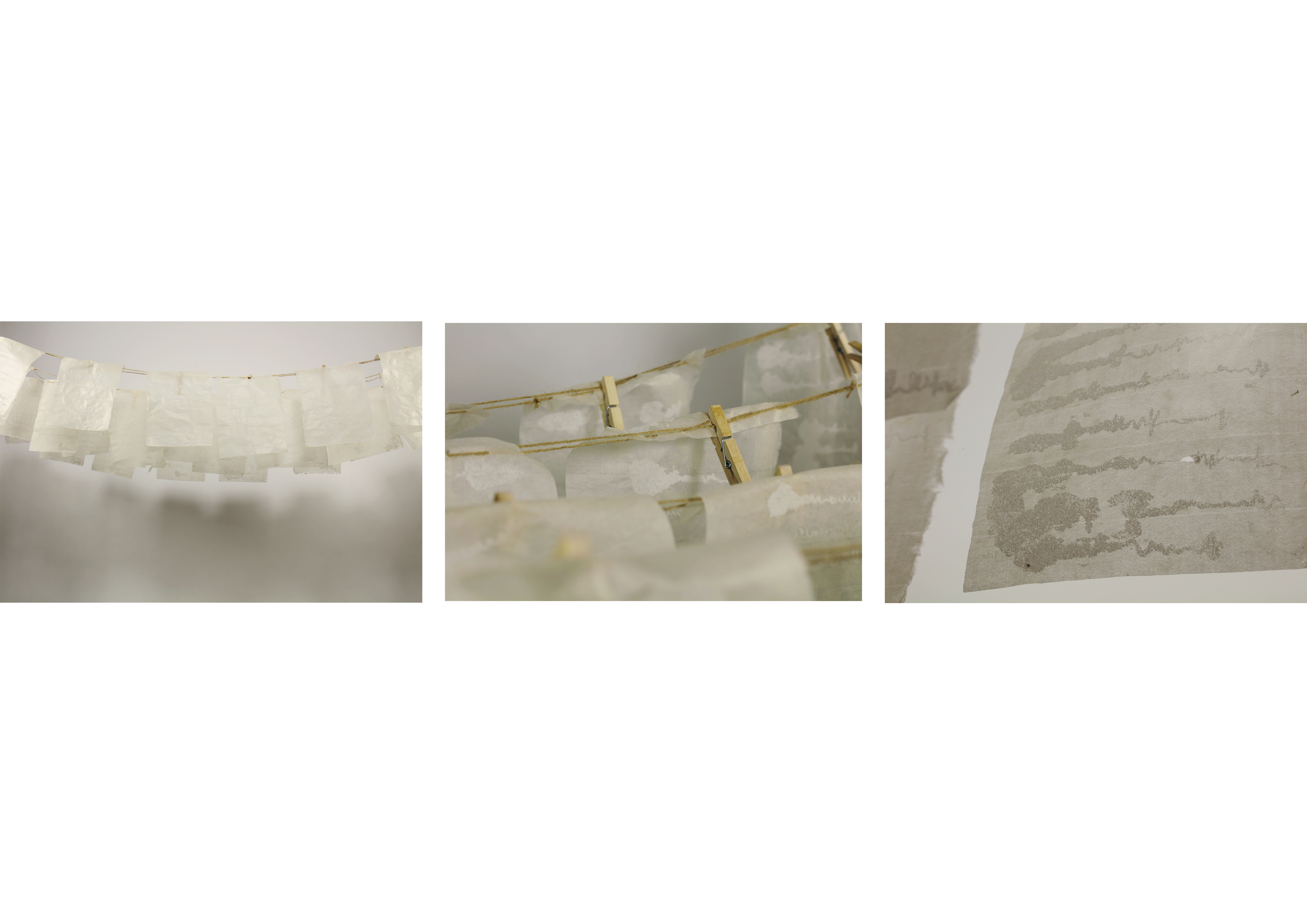 The object itself is the result of papers threaded together with Cabuya (Ecuadorian organic fiber) and displayed as a hanging clothesline. In this way, my project revisits memory transforming it into a tangible, yet abstract object.