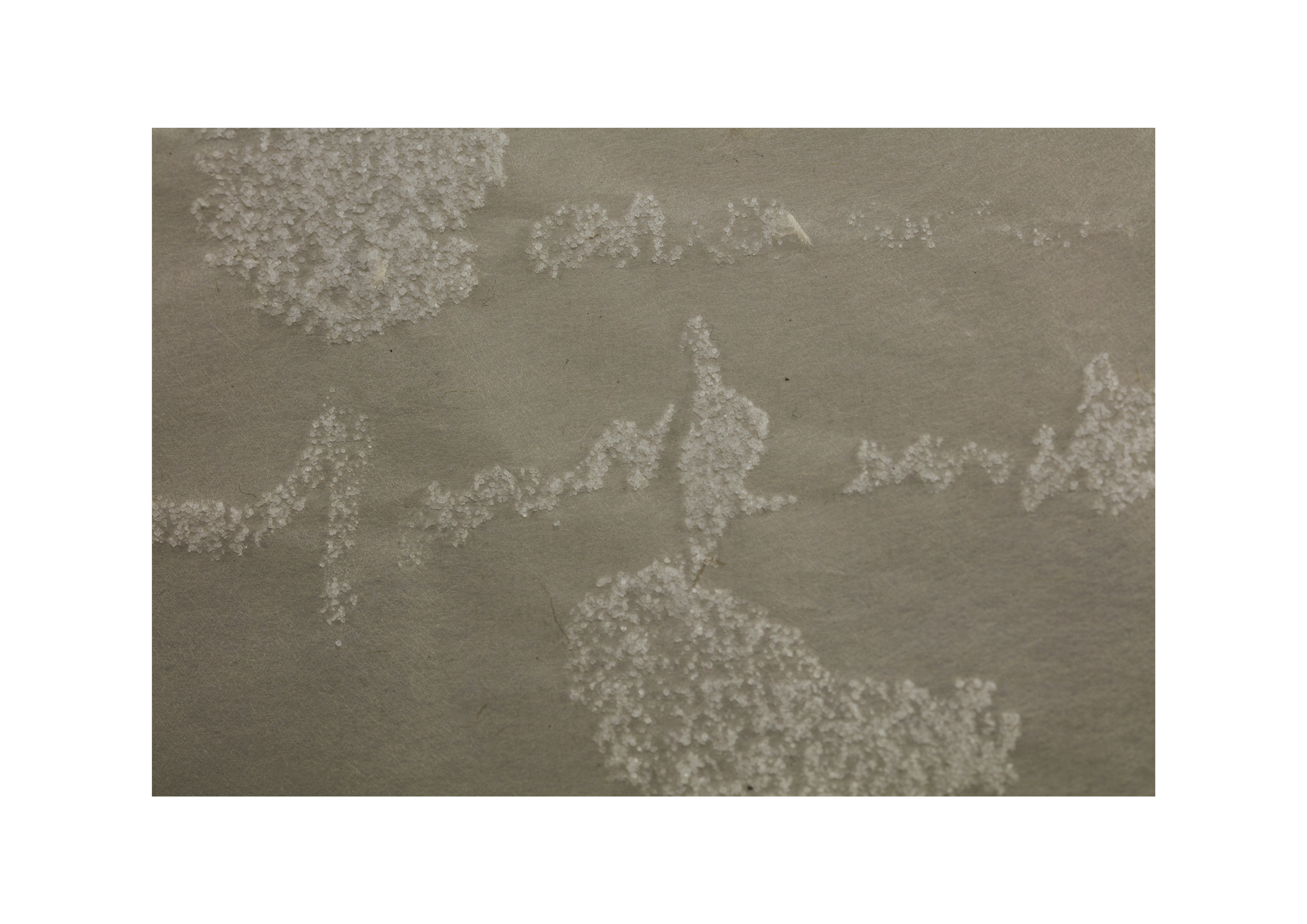 In order to reconstruct and materialise these memories, I create an object. For twenty-eight consecutive days, my intimate thoughts have been documented in the form of letters. Written with water and salt on handmade white paper, the object is meant to dry and leave behind only scratches and stains. The white paper resembles the idea of a blank slate as a representation of memory not existing before the individual. Nonetheless, the watermarks suggest the notion of distortion over time. As a result, the empty letters are meant to be a memory aid, like a blank POST-IT that can be used as a cue to help us remember.