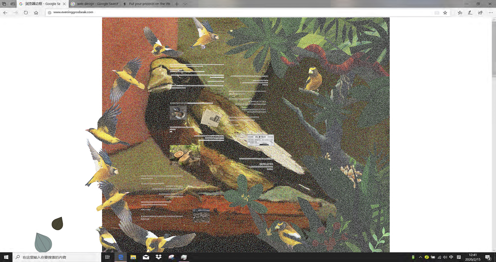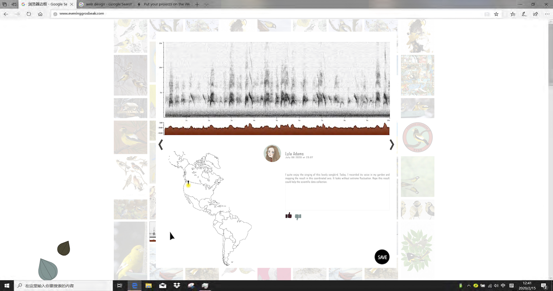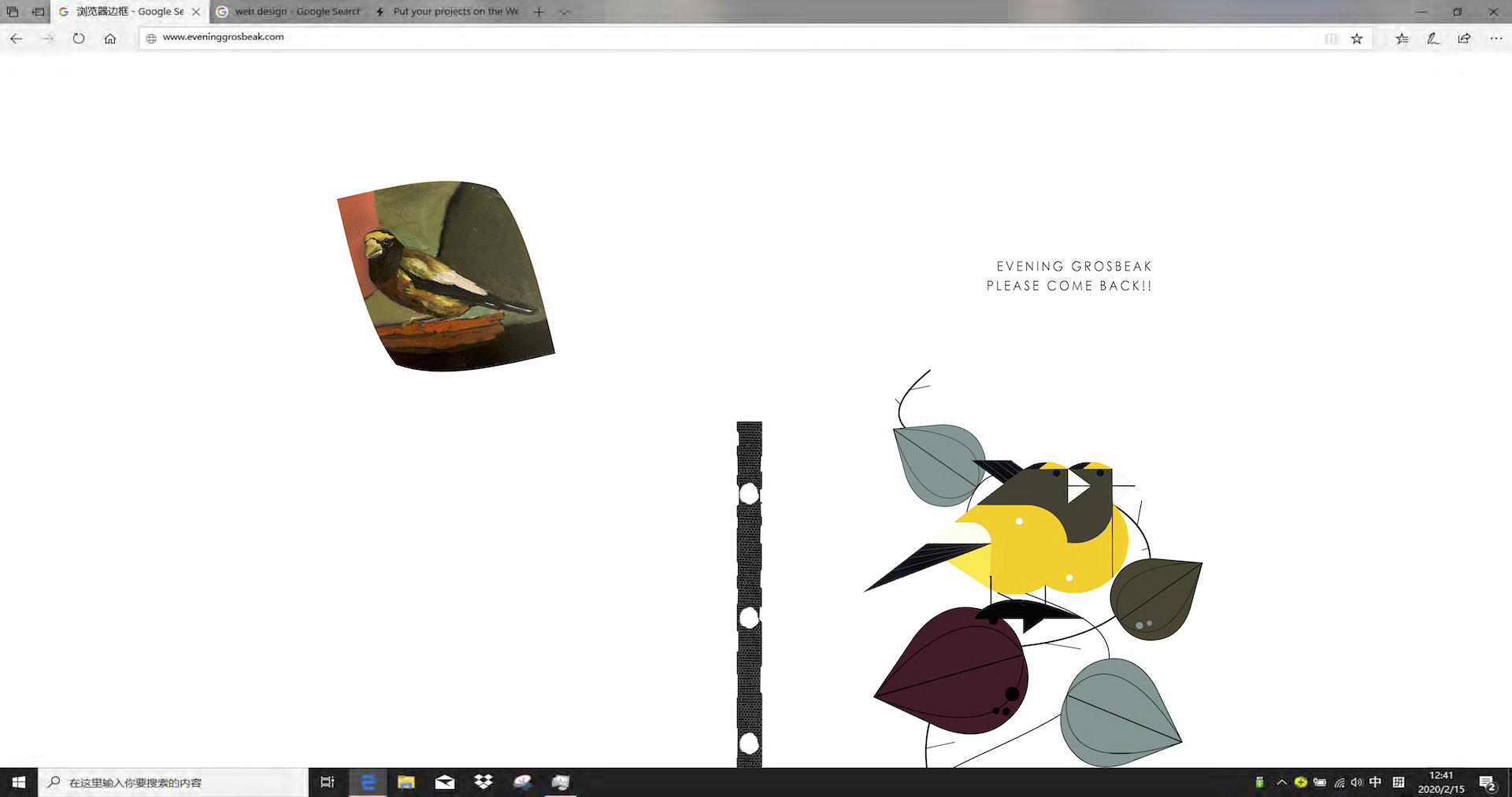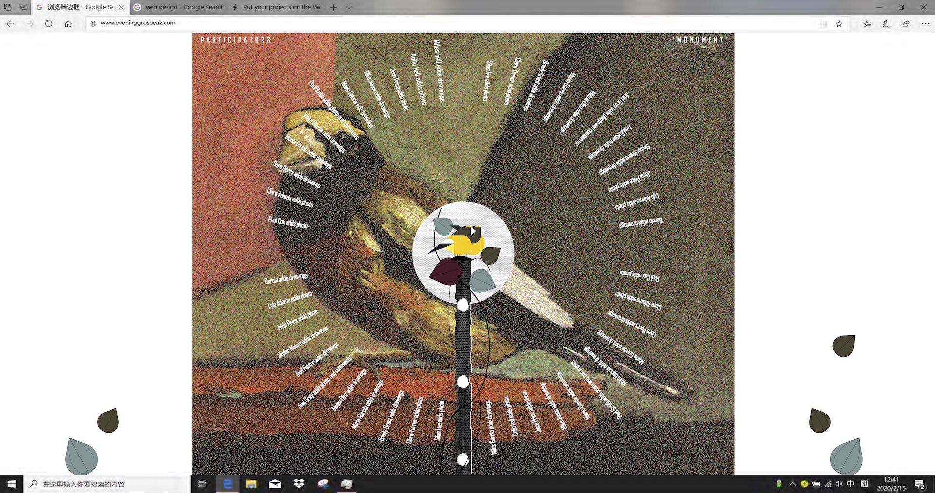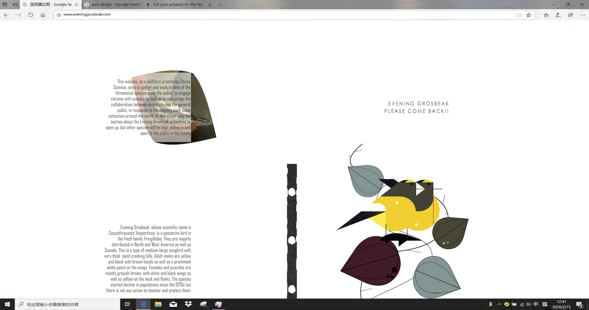 This project focuses on only one species, which is a songbird called evening Grosbeak mainly being distributed in North America with an obvious decreasing trend during this decade. But it has the potential to develop as a database for more species in the future. With this project I tried to mediate rigid scientific data to a public-friendly visual language and the transformation. It establishes the bridges between the scientist, the public and visual language to help increase conservation awareness in an active approach.