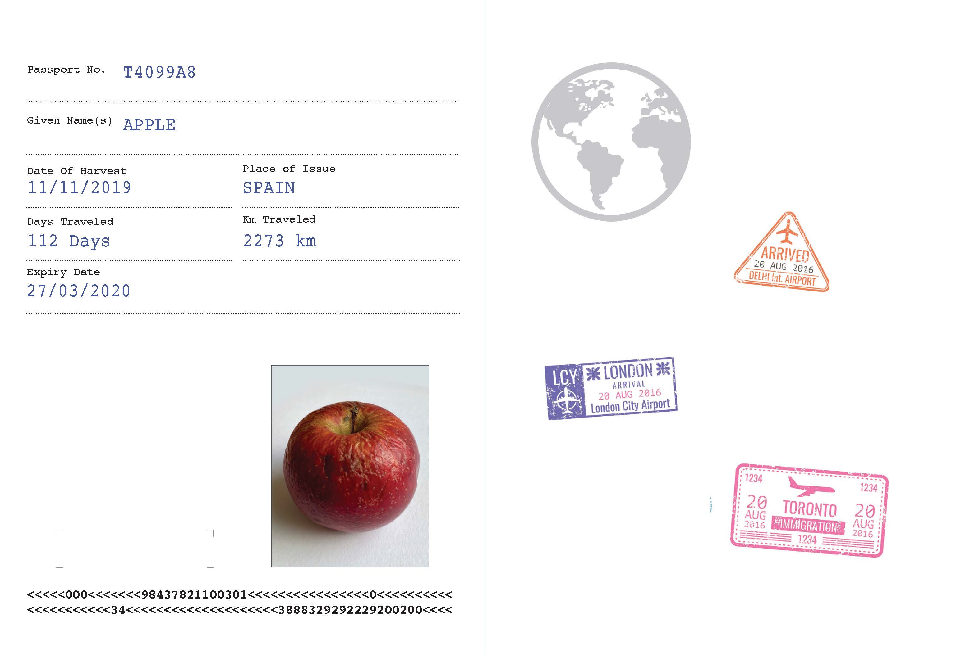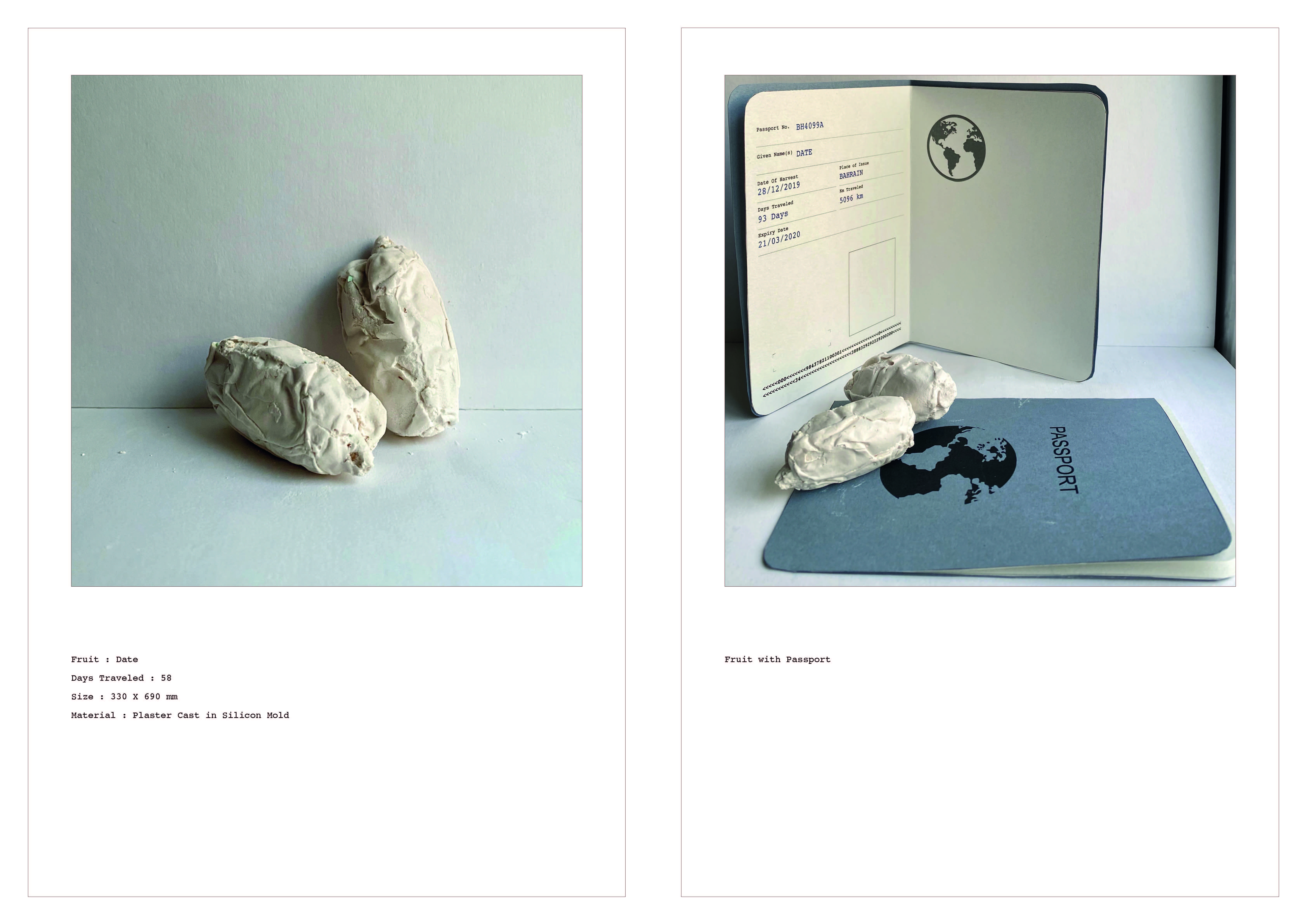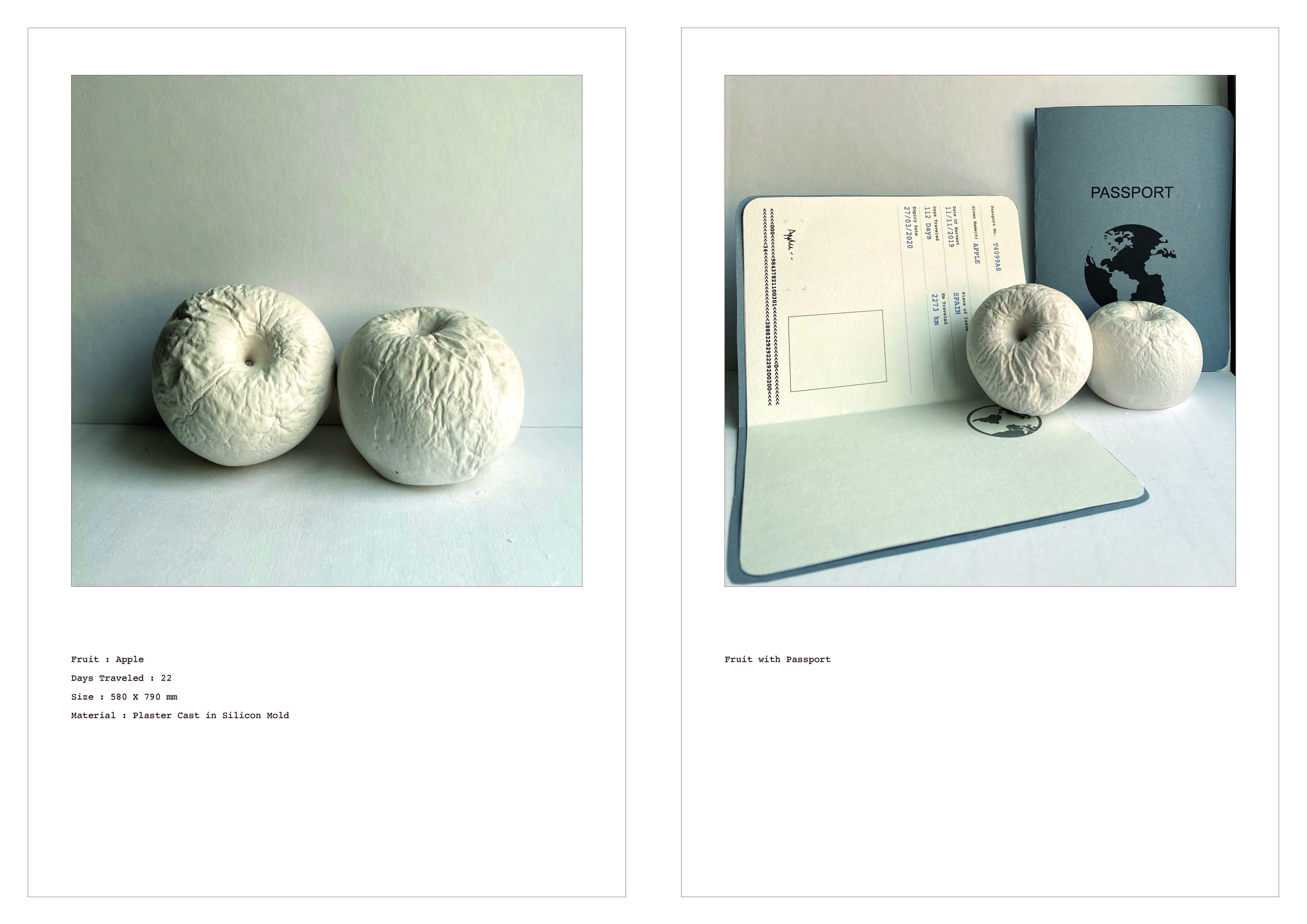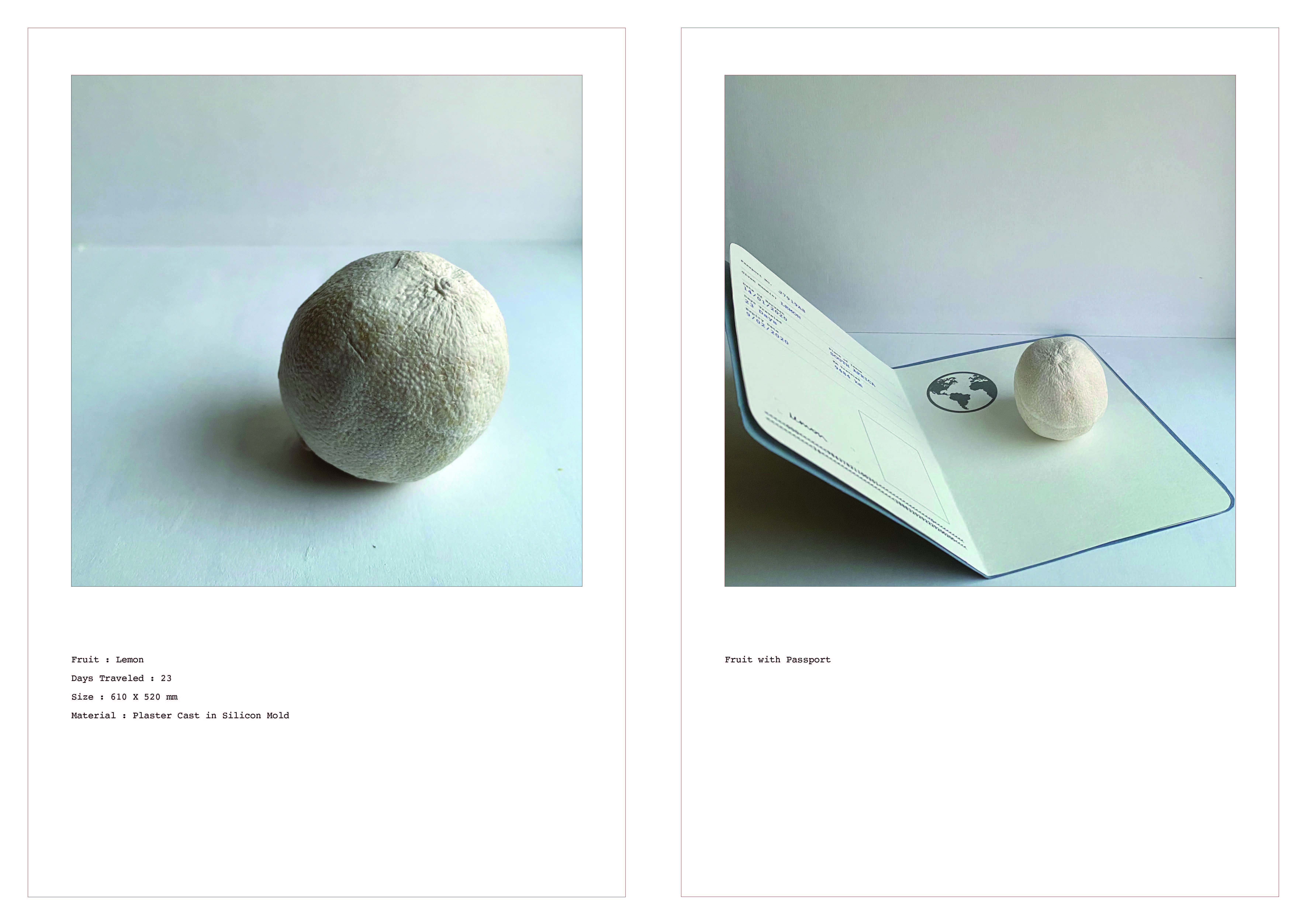 To trace the global journey of certain fruit, I created a passport for them to explore the complexity of food exportation process. The passport has a traditional booklet format with an identity number, species and place of origin. Alongside this, I conducted a series of experiments to investigate what would happen if I left fruit (without refrigeration or packaging) for the duration of its usual travel time. I made silicon moulds from the decaying fruit, and then cast it in plaster. This created decay preserved models of the fruit. This project is a comment on the temporal nature of fruit, investigating ways to make the supply chain more visible, and through this, to question the collective choices that we make in what we eat as individuals, communities and organisations.
