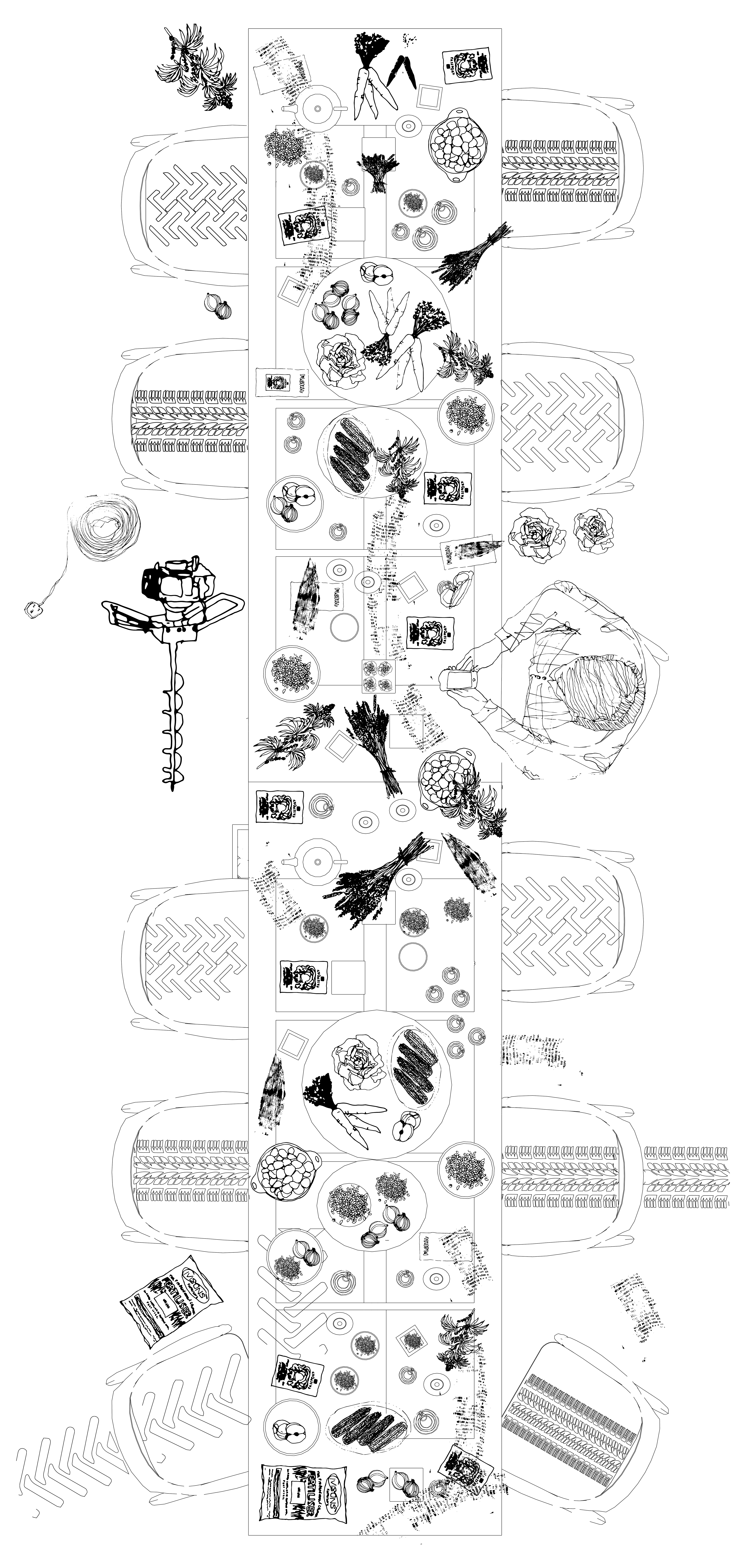 The isolated farmer sits at the table with places laid for the invisible season migrant worker. The machinery has made an appearance but couldn't stay for long. Contaminated soil is served as a starter and the chemical gravy can be added to any dish. An abundance of cereal crops scatters across the table and spills off the edge. A large amount is left to rot. The celebration is excessive and chaotic.