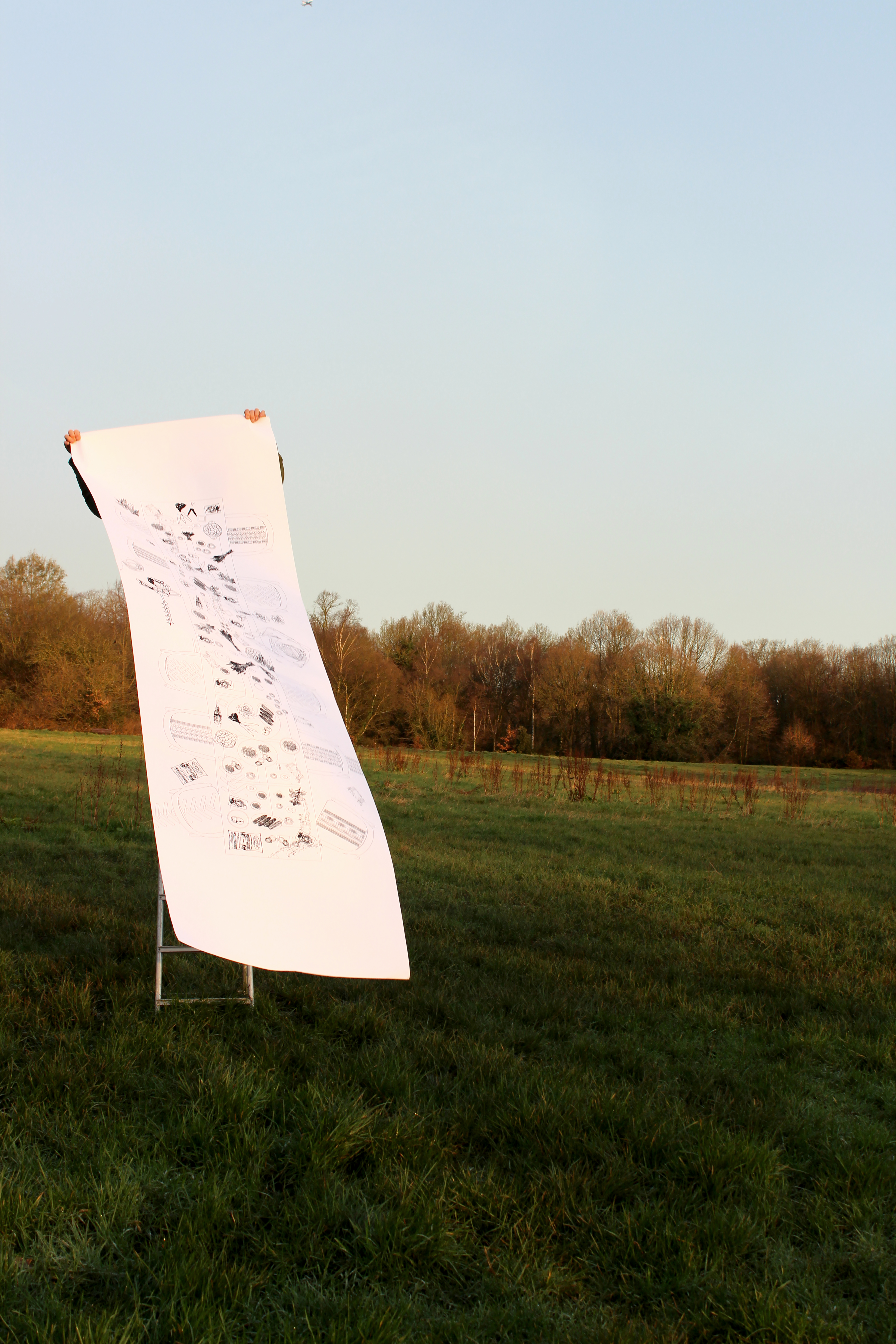 A photograph captures the farmer at dawn using the feasting table drawing as a tool to reflect on the landscape. It references harvest festival performances that once took place in the field. It acts as a mediator between the farmer, the changing physical landscape and the resulting cultures and traditions that emerge.