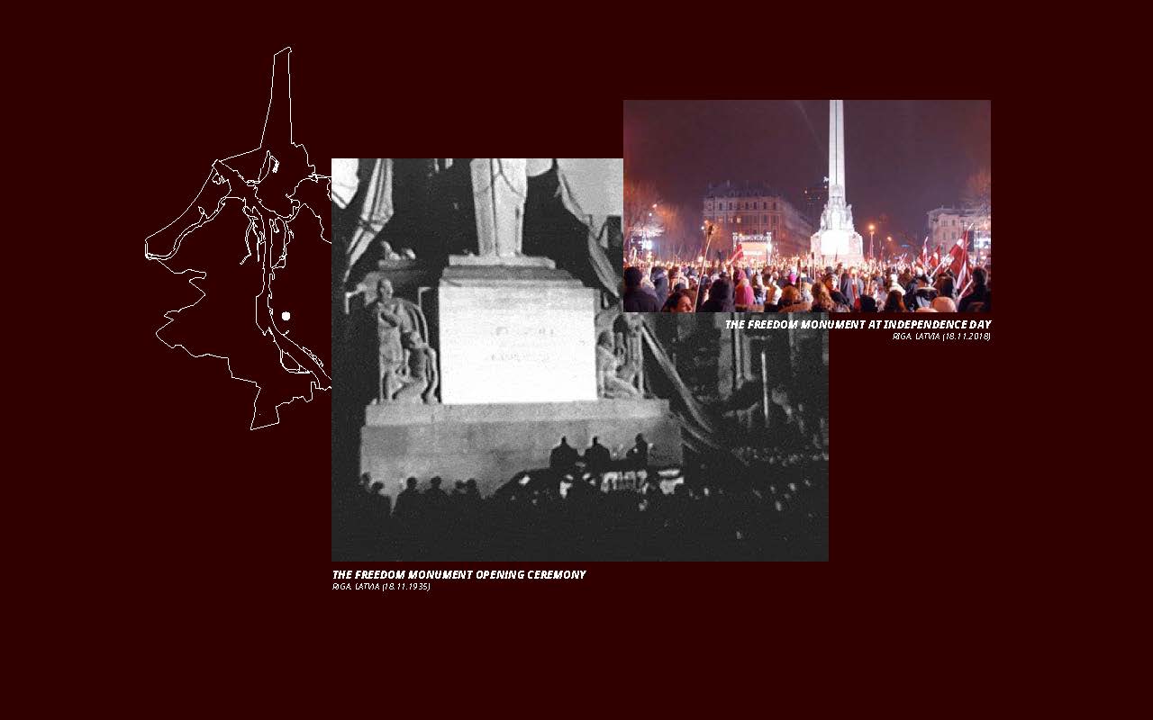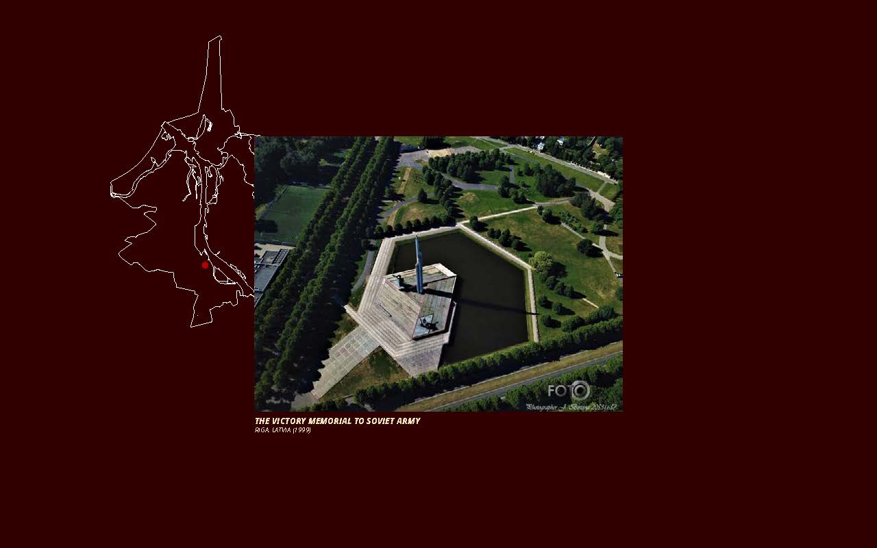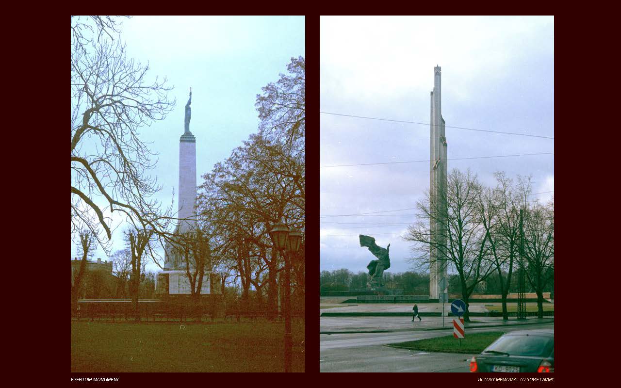 The Freedom Monument was erected in 1935 at the first period of an independent Latvia. On the opposite shore of Riga’s main river Daugava, sits the Victory Memorial to Soviet Army built in 1985 for the memory of the victorious communist USSR in the II World War. Both monuments represent soldiers and lives lost, glorifying war, bearing victorious stars and use the figure of the female as the mother country.