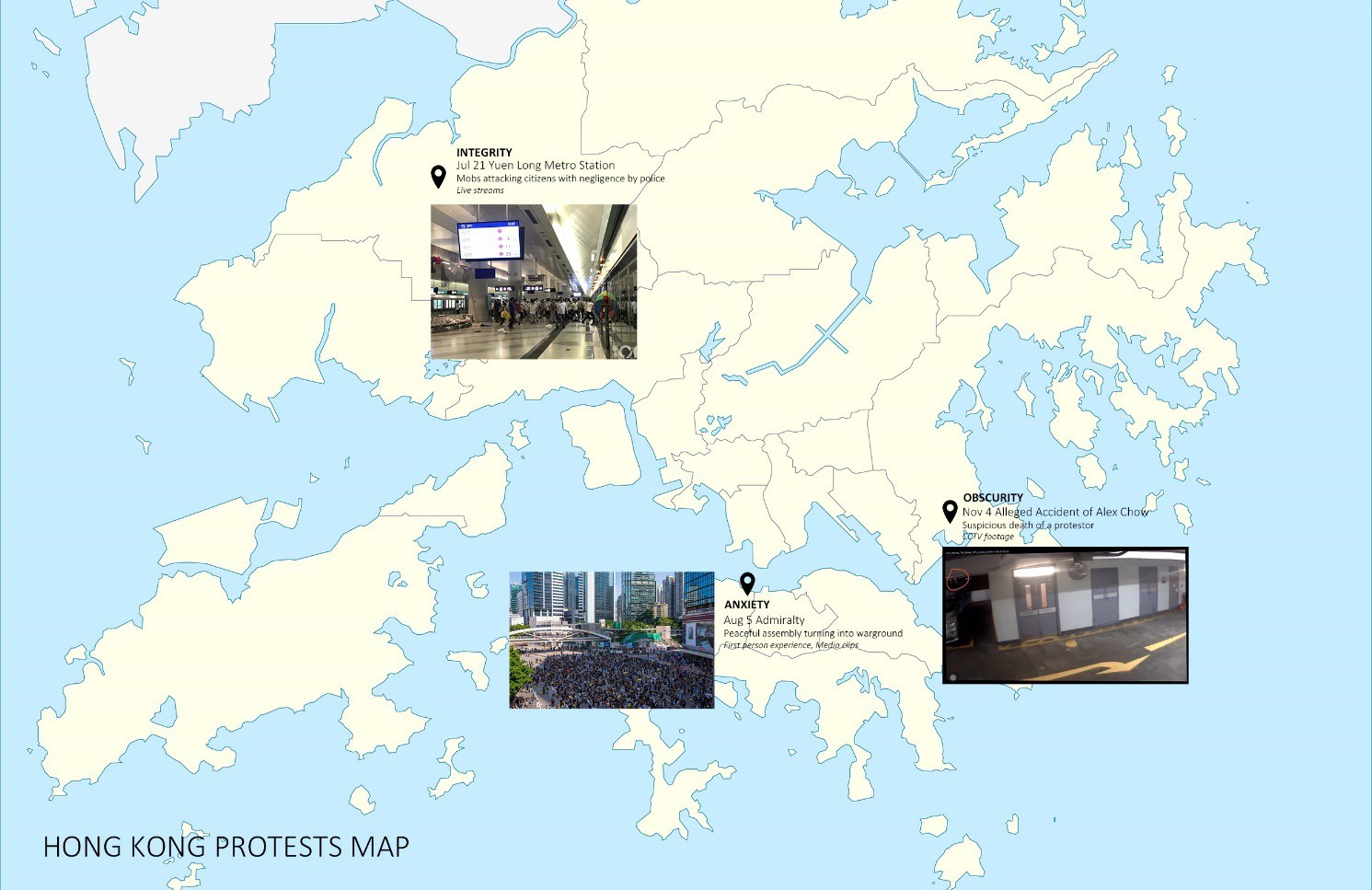 Three moments were chosen to divulge the reasons how the movement escalated to the current extent. Each case fills in each other by adding insights to the entire political environment. Each place has its significance within the entire movement and introduces different participants and their values. Through collating the spatial records and human movement from images, texts and videos, and rearranging them to reveal the larger play of events, the project aims to reveal a different perspective of Hong Kong in 2019.
