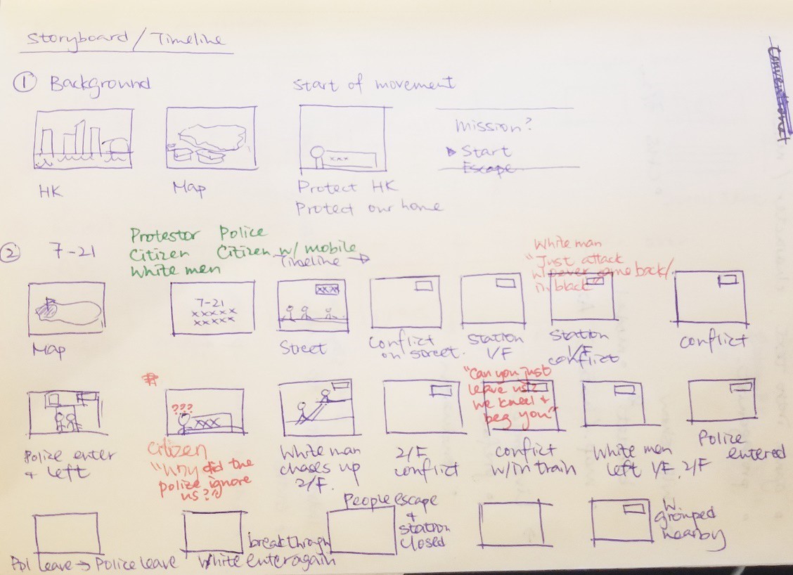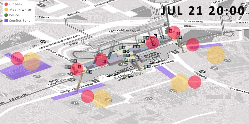 Different spatial scenarios in the city acted like a stage for the interplay of different actors such as protestors, citizens, government, police, triads, reporters etc. The appearances, clashes and motions among all the actors are there to build up the conflicts.