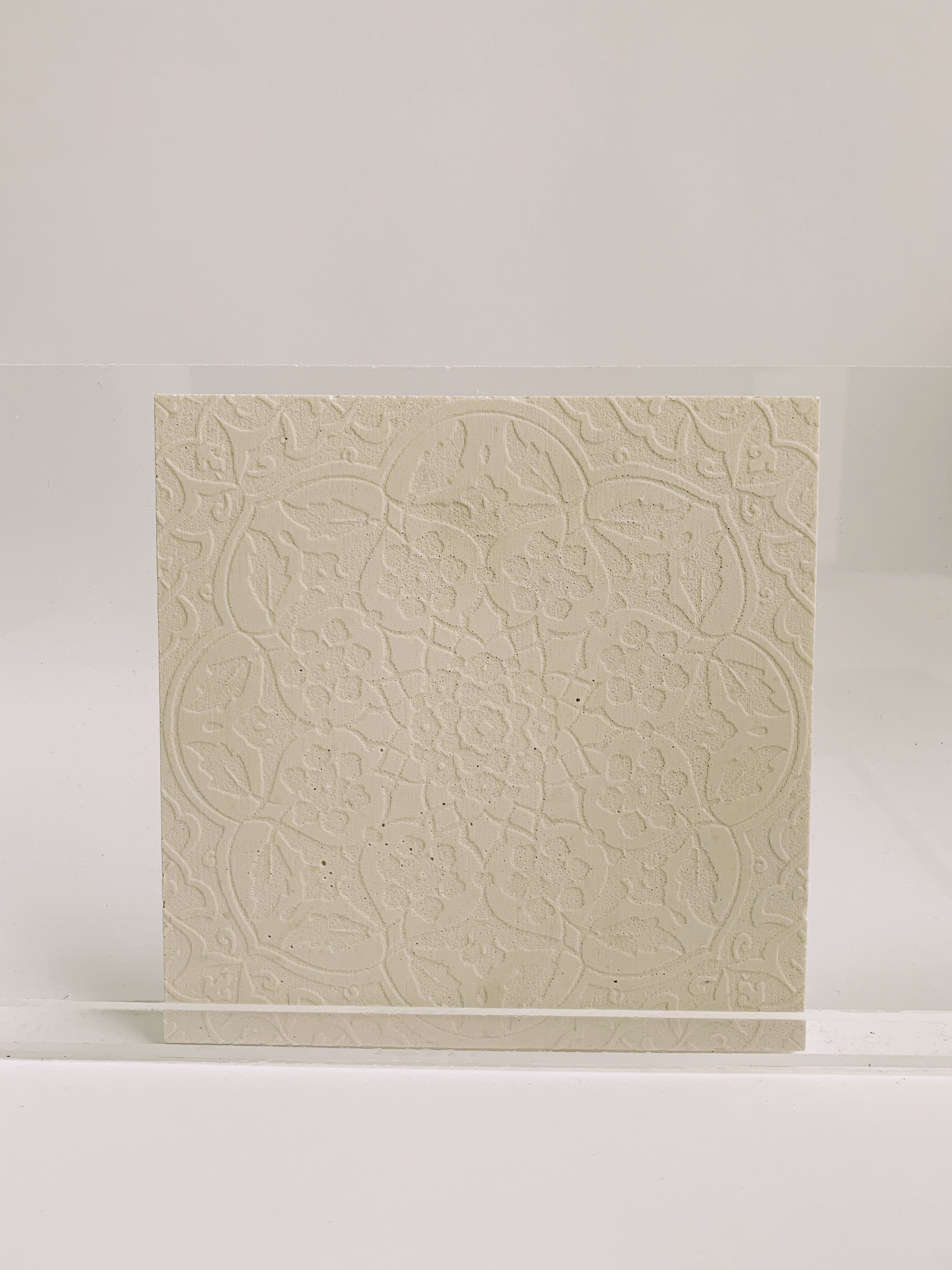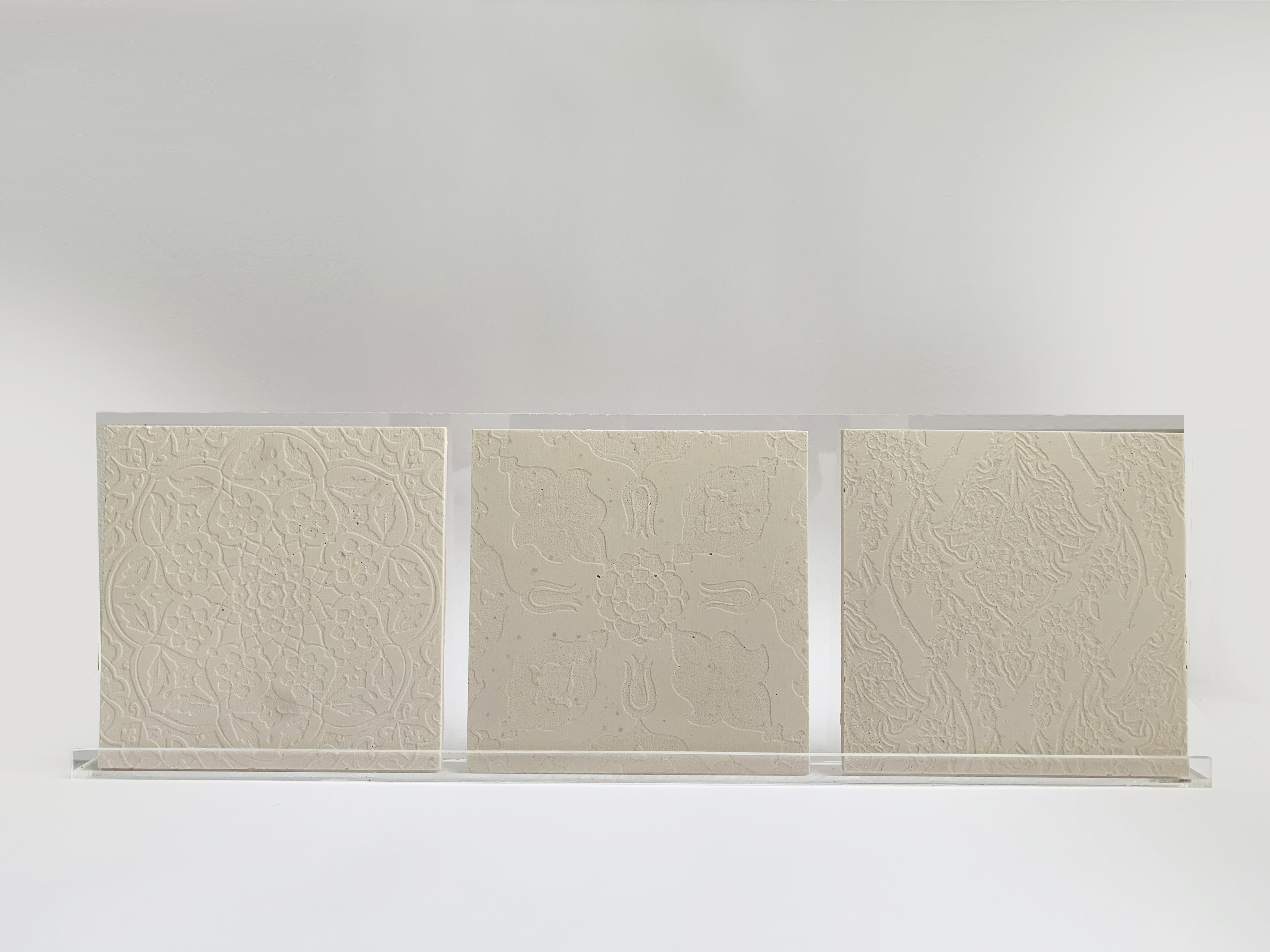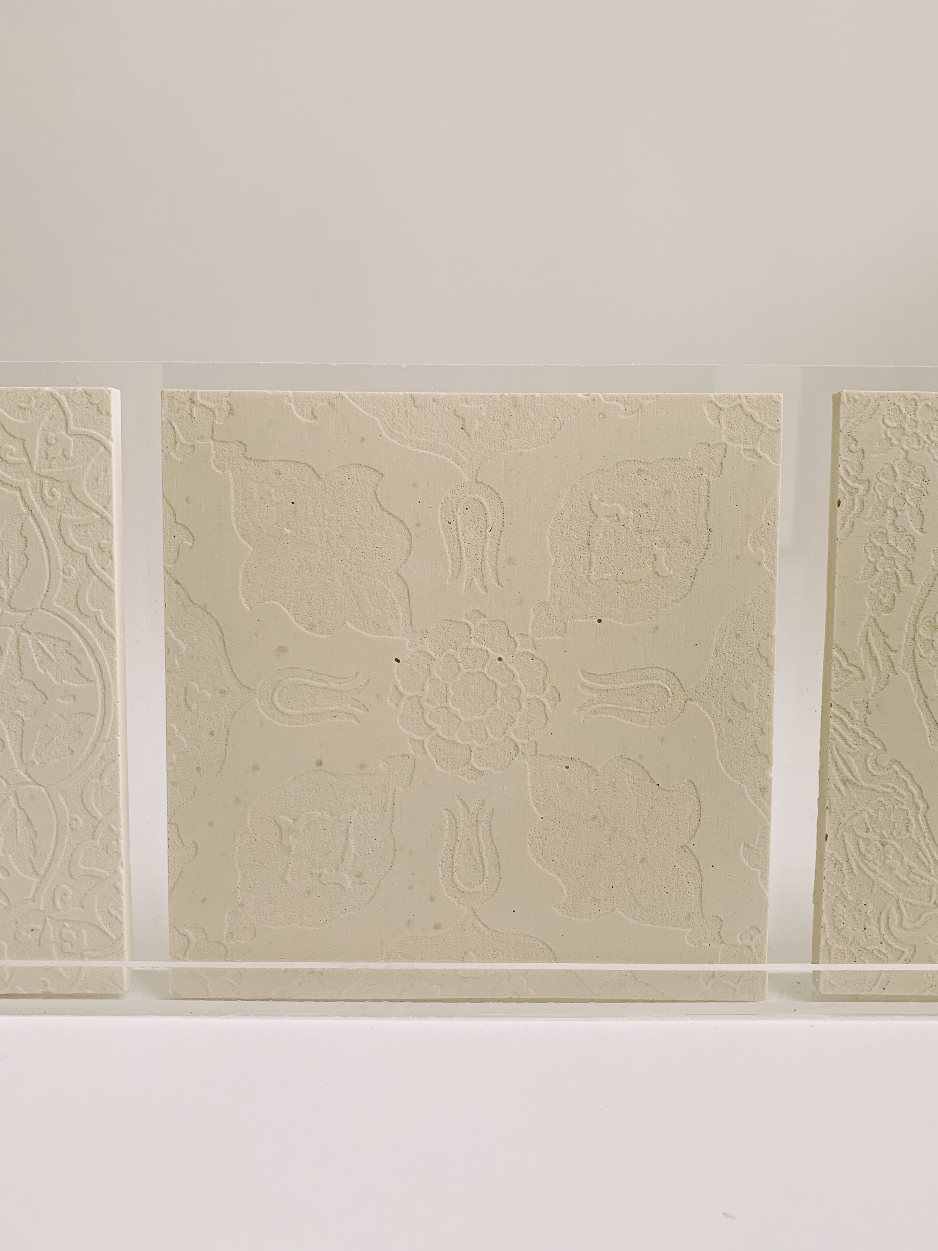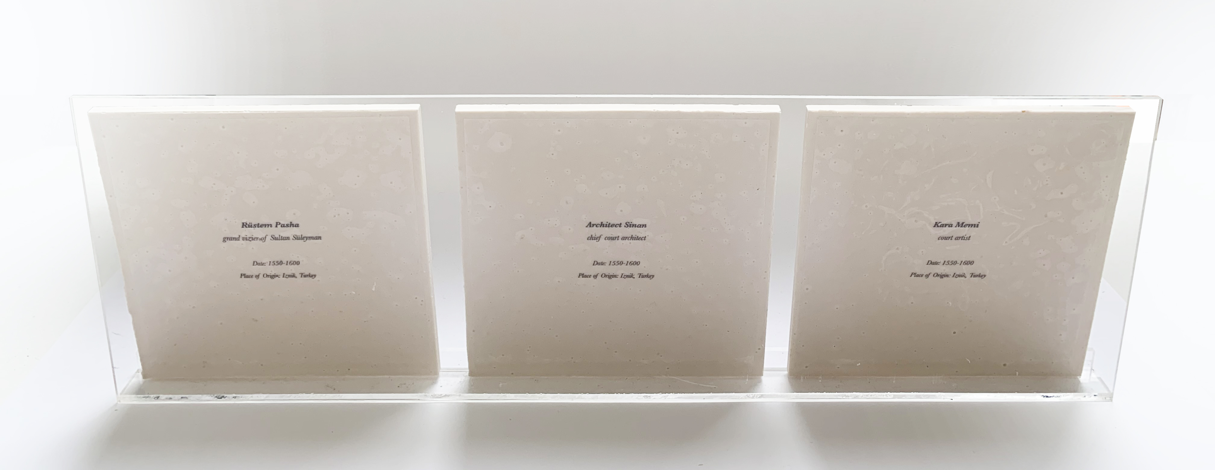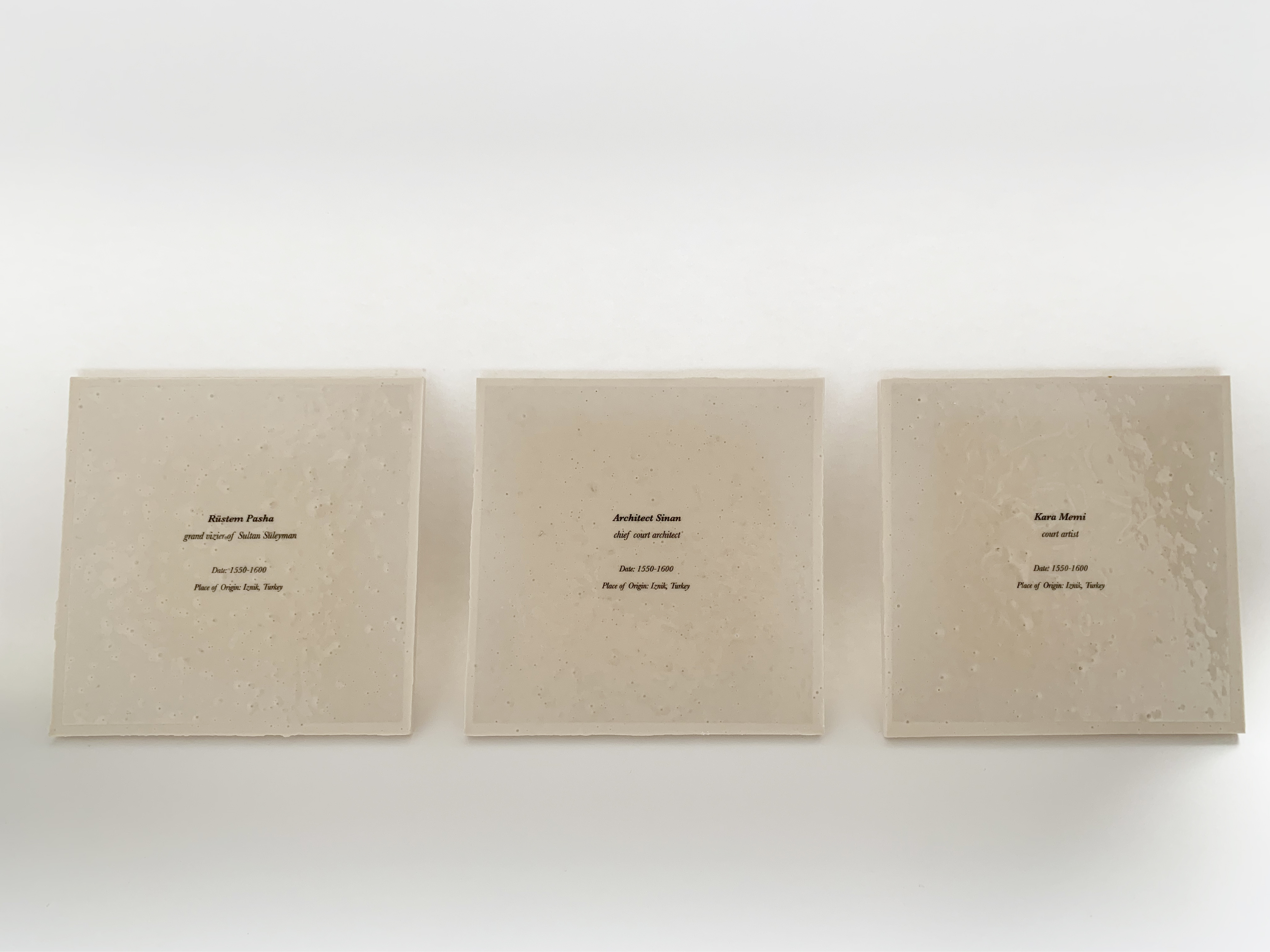 Three Iznik tiles are recreated without colour. By removing the colour -the element that allures the viewer the most- more attention is drawn to the technique, material, surface, form and geometry. The acrylic display, unlike the usual mounting, invites the viewer to see the back of the tile where usually the signature of the artist and origin is recorded but gets lost when mounted on a wall. At the back of the tiles three of the most important individuals are represented; Kara Memi, Architect Sinan and RĂĽstem Pasha. In doing so, my project criticises how Iznik tiles are normalised in the West because of a fantasy but their meaning and specialty are lost.
