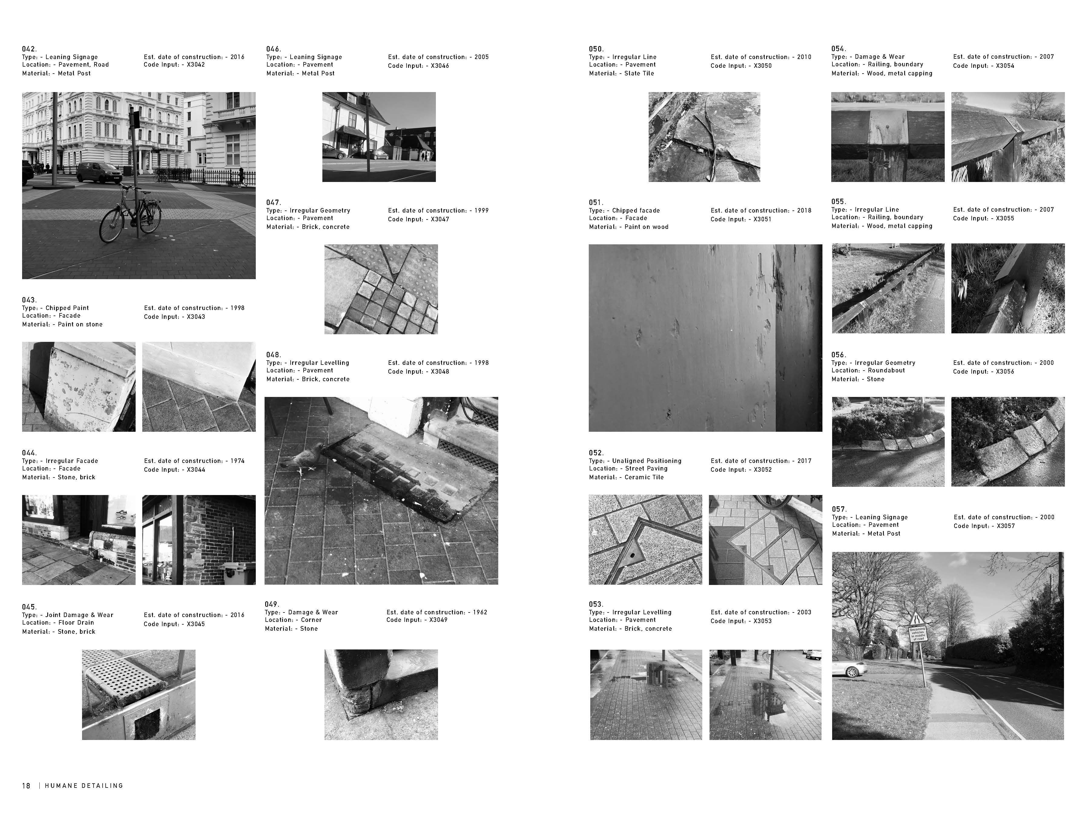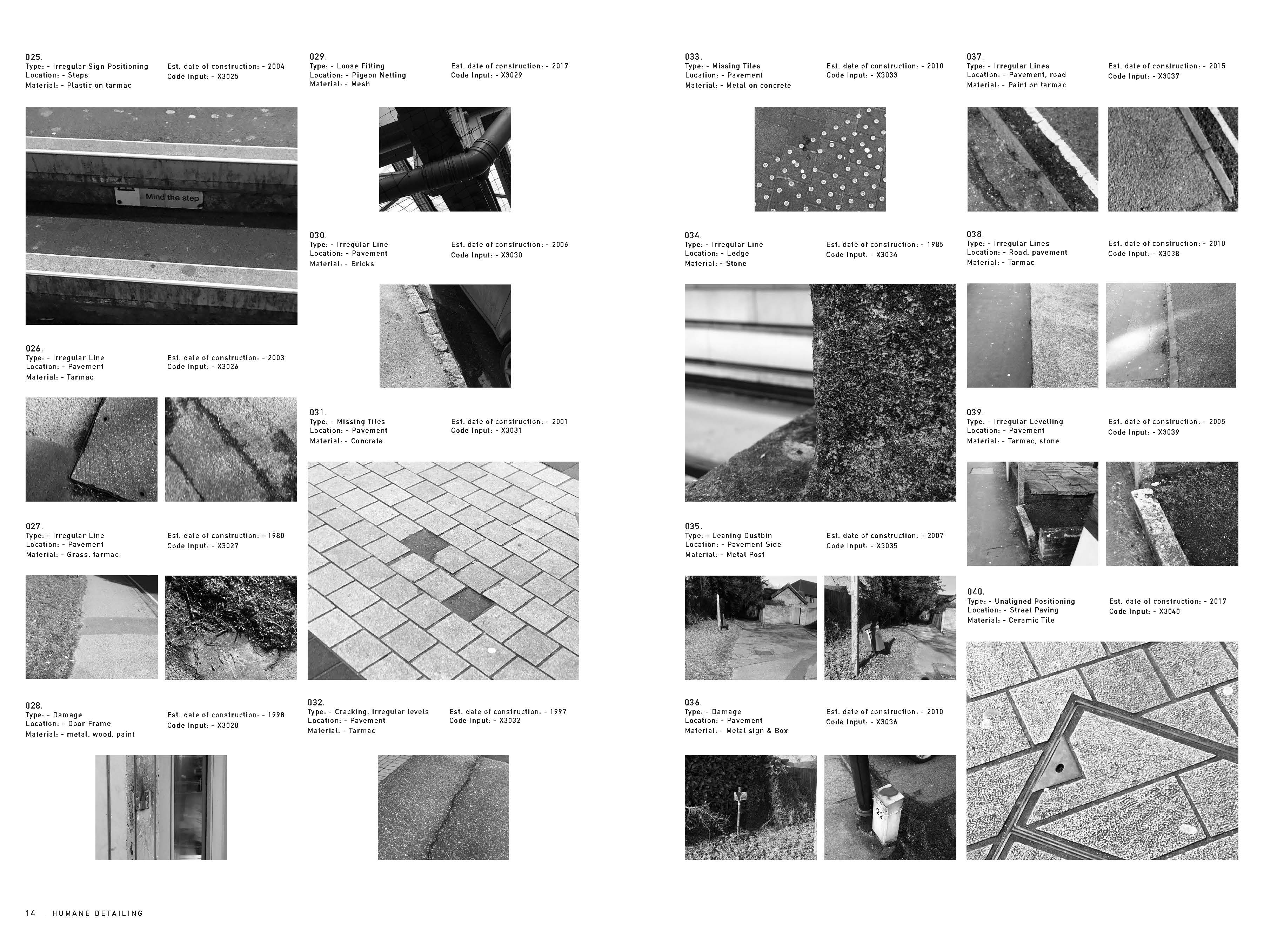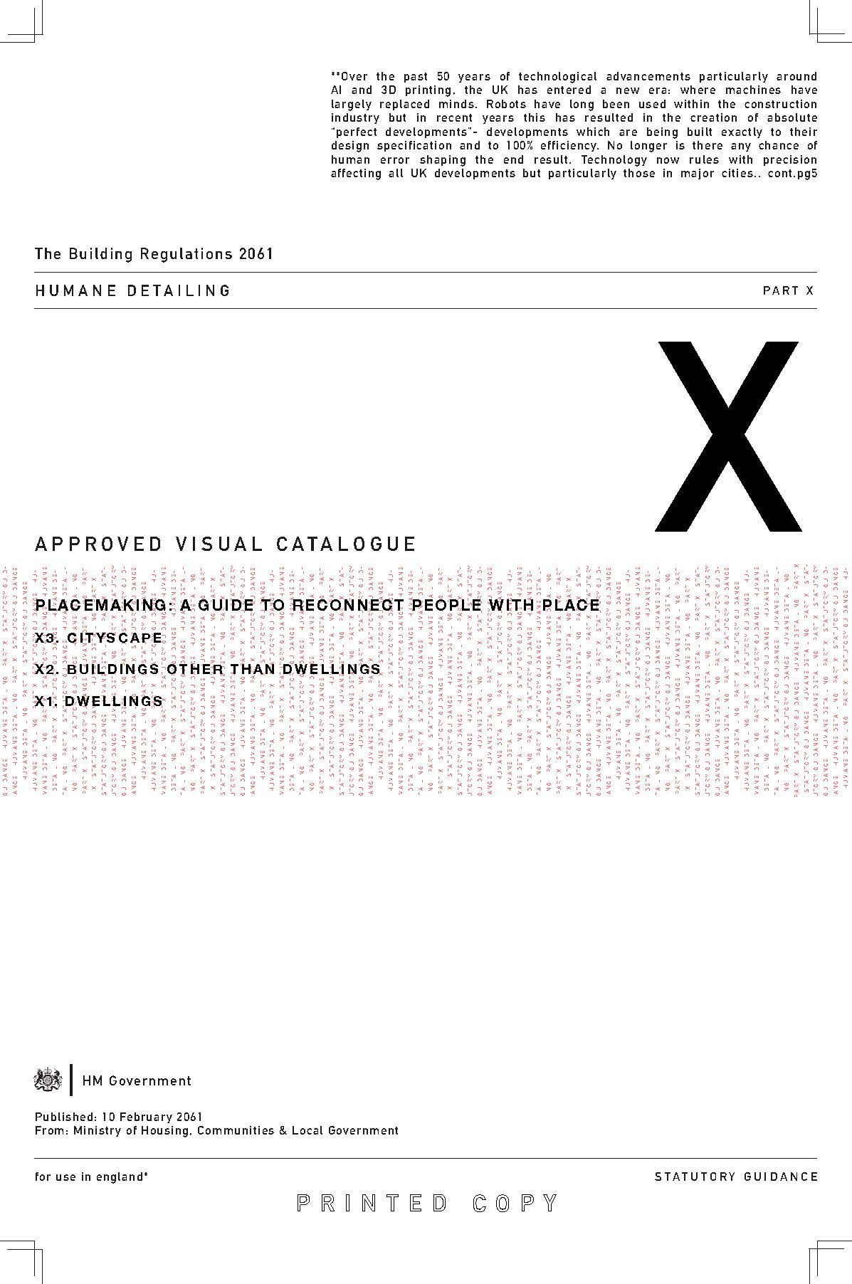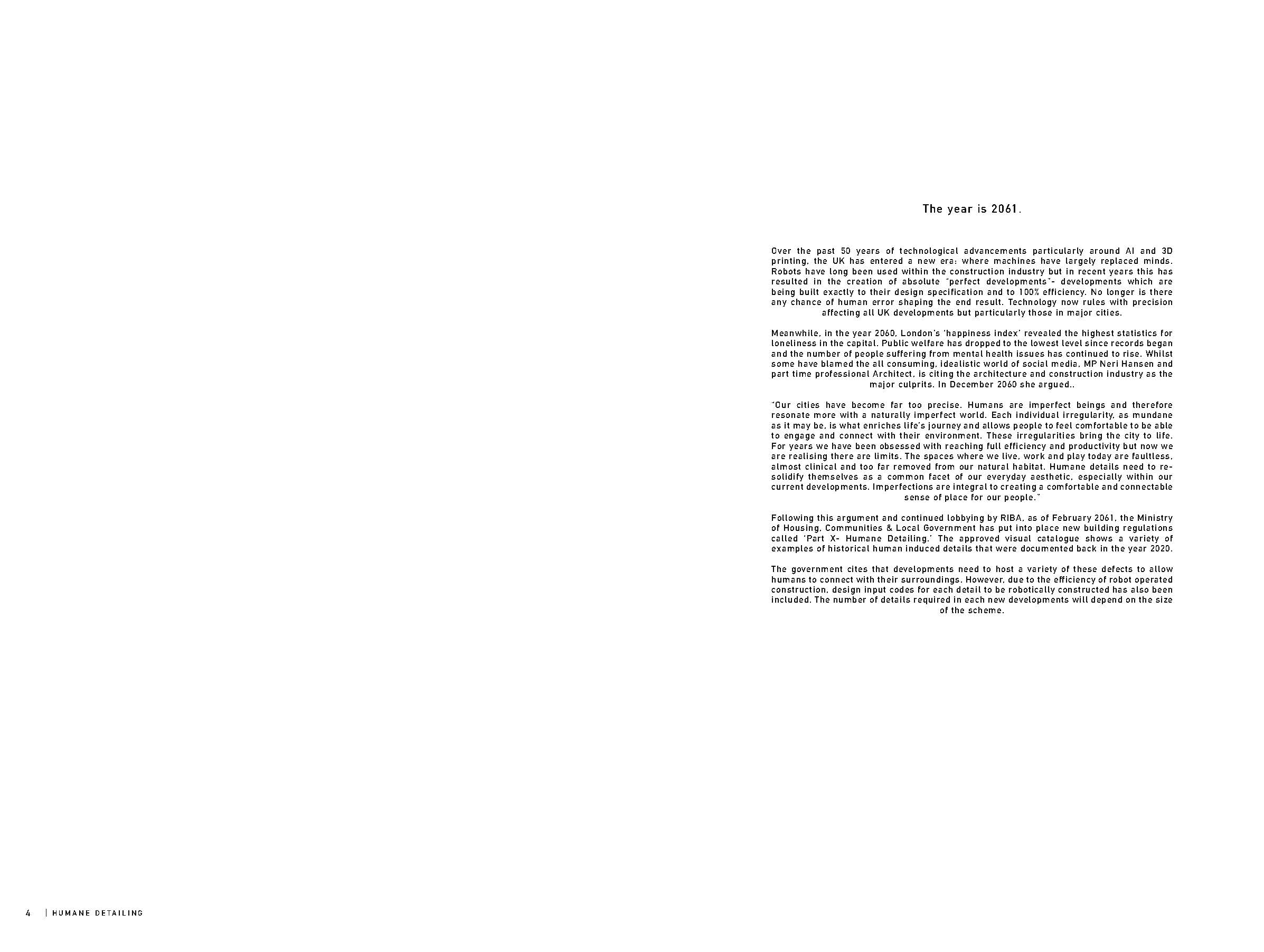 My project is set 40 years in the future mimicking the form of a building regulations document titled ‘Part X: Humane Detailing’. It cites that future developments need to host a variety of these defects to allow humans to connect with their surroundings. The photographs shown throughout the visual catalogue are taken during my daily commute and at my family home, to emphasise how common these irregularities and defects are part of our day to day lives.