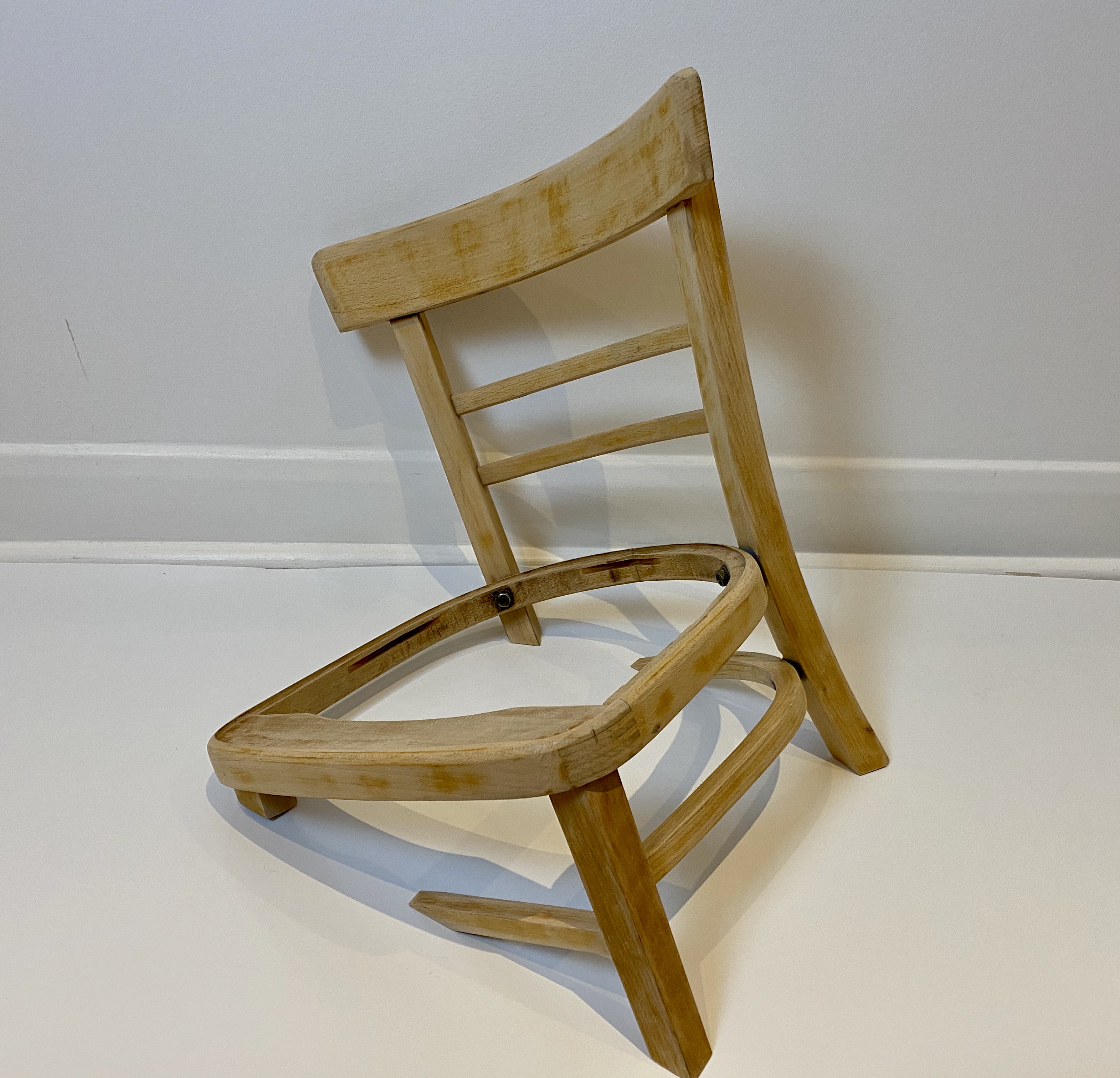 Finally, I removed some of the chair legs. When the chair is on the ground, the chair would be tilted. This represents the scene when the chair is immersed in water, as if the chair is sinking. This also implies the consequences and harms of climate change brought about by sea level rise. I hope that this device will awaken people's attention to climate change as a rising sea level, and to continue to warn myself.