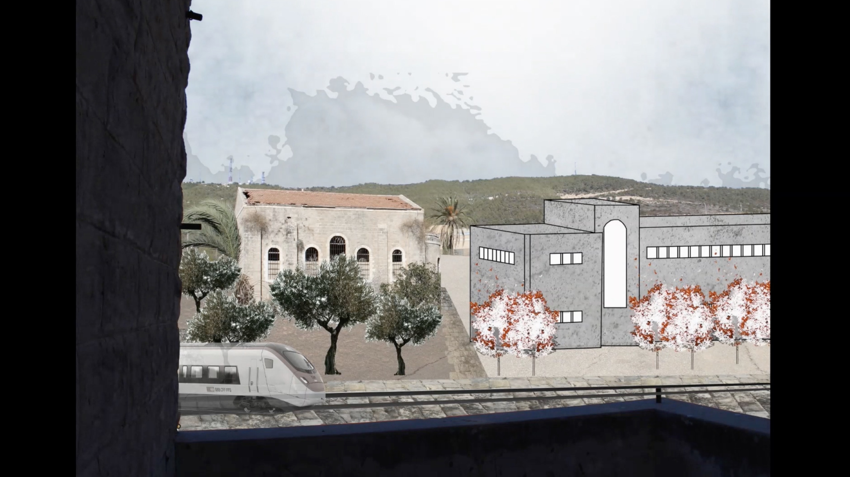 Whilst most of the houses and buildings were made from clay and stone, typical materials for that period, the architect of the college decided to use concrete as a statement of modernity. Research shows that the bombardment that destroyed the village, paused the past and interrupted the future. The project presents a political statement using the image of the un-built college to spatialize and declare its existence as an inseparable part of the village and the everlasting culture that was destroyed.