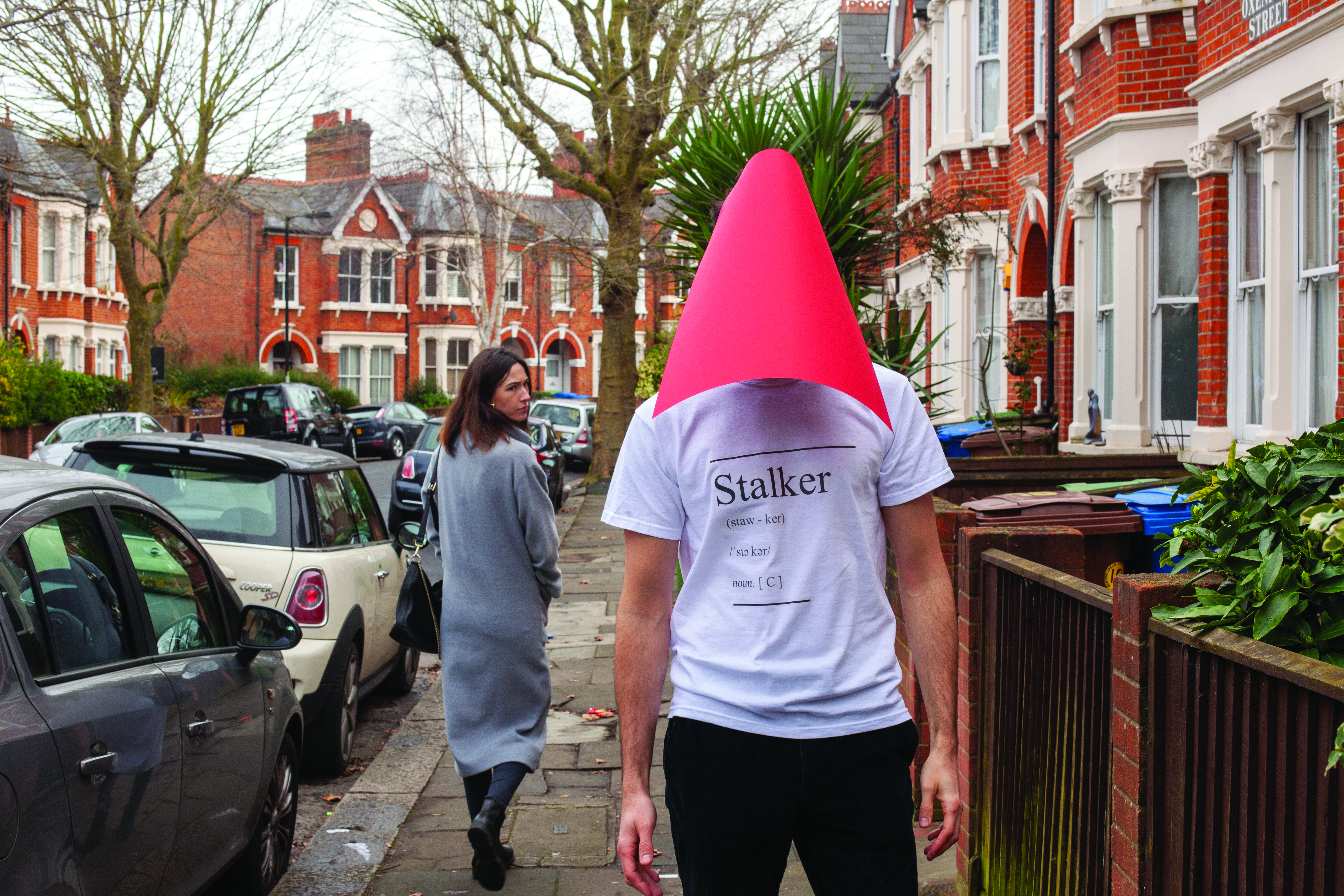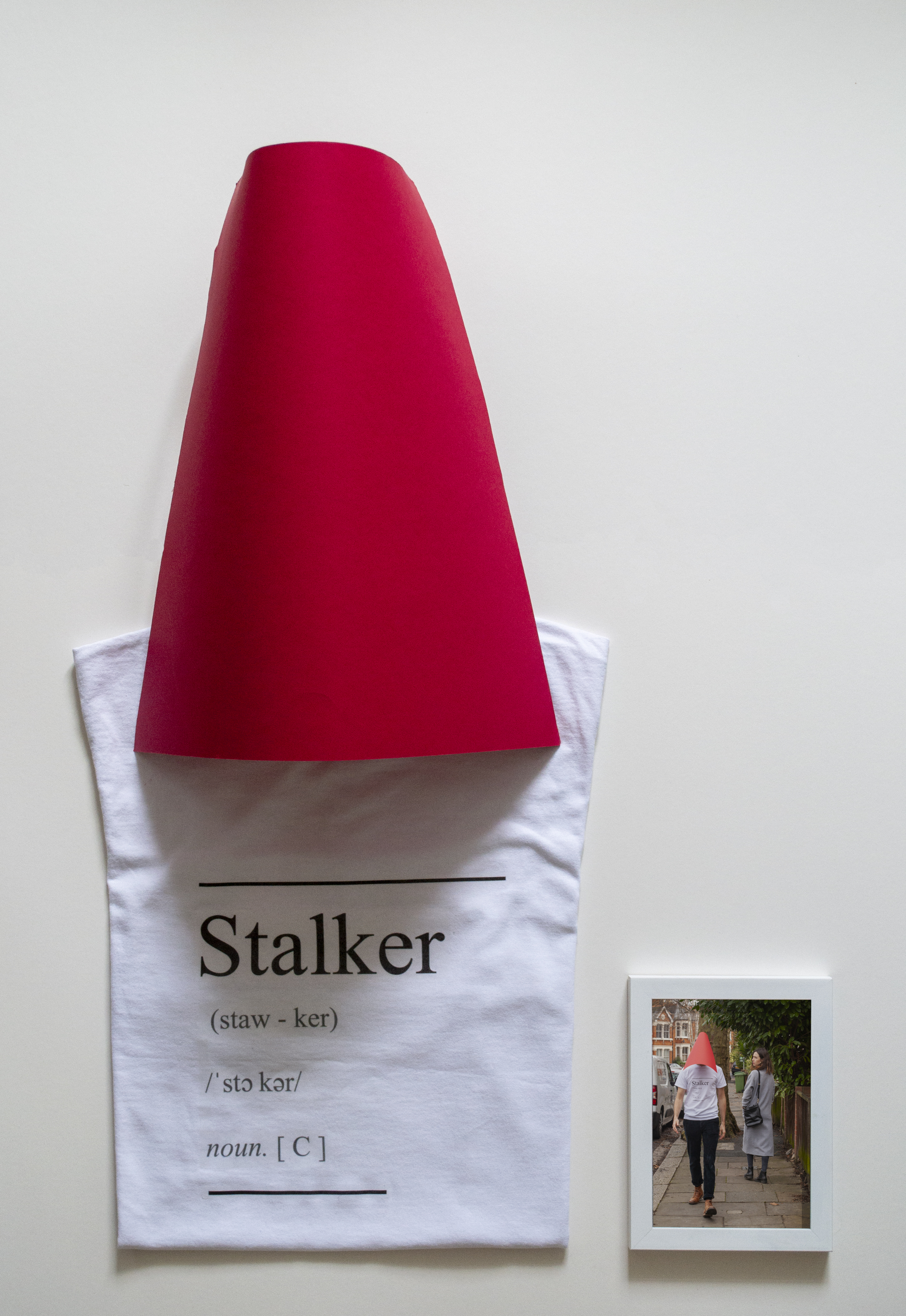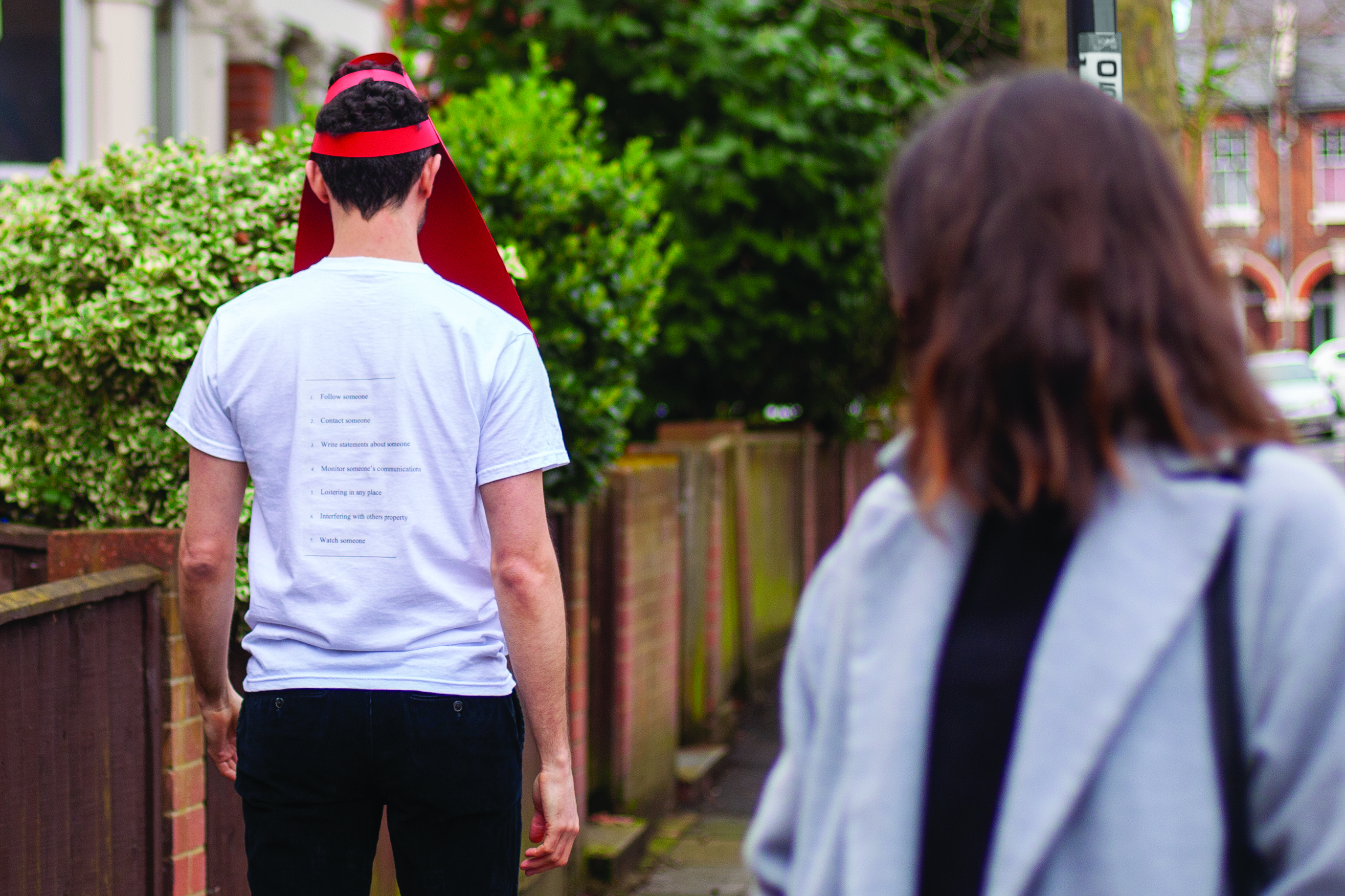 The mediation took place through a home-made self-guarding and restricted-viewing device. In addition, there is an accompanying text in wearable form, which states the legislative terms, aimed at engaging others in a conversation around this legal terminology. The aim is to mediate the relationship between the stalker and the one apparently being stalked, producing a deliberately ambiguous notion of who’s who. While the individual clearly identifies as a stalker, it is the passer-by who most accurately fits the defined terms.
