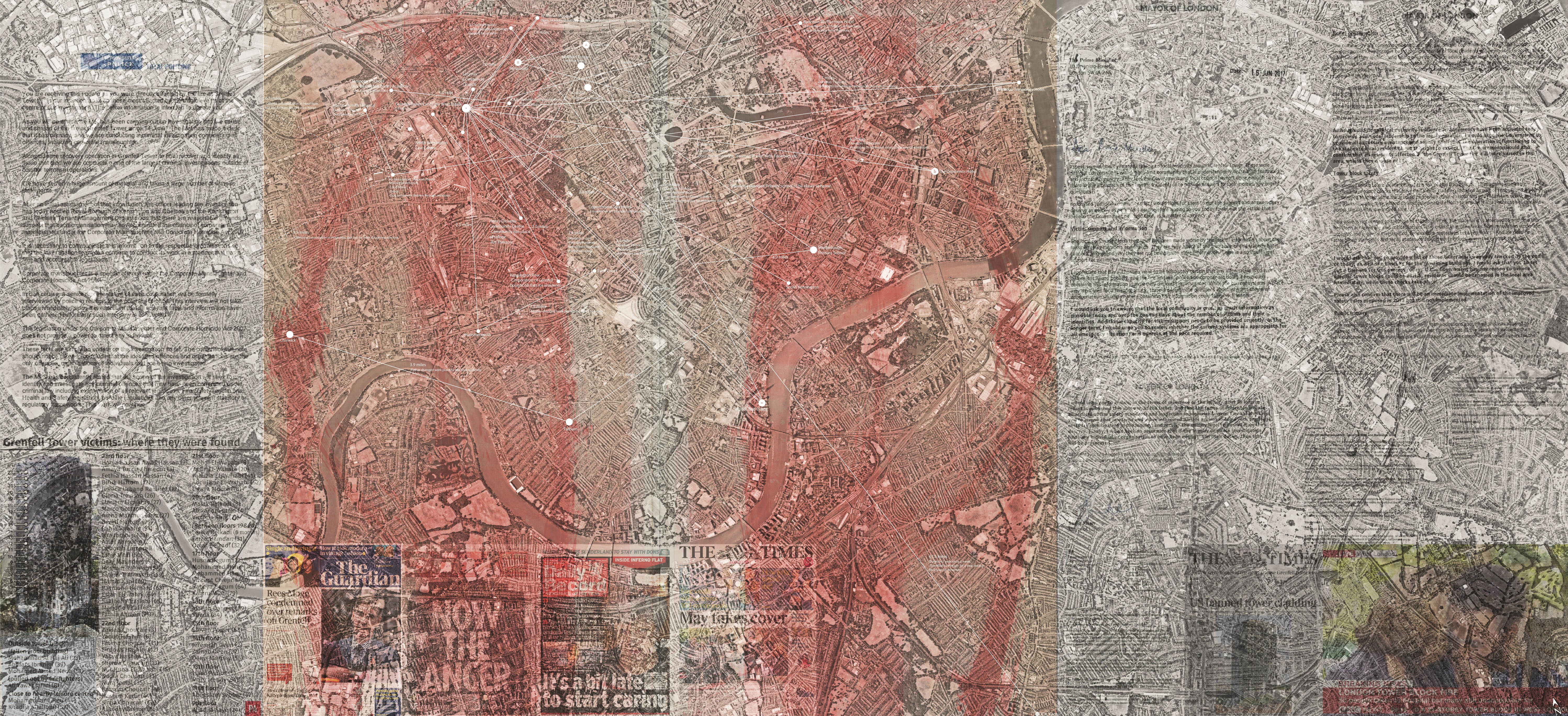 Overlaid on top of this cartography is an art piece created by the person whose movements I traced. The print recalls memories, trauma, fear and anxiety manifesting them into the practical realisation of the project.