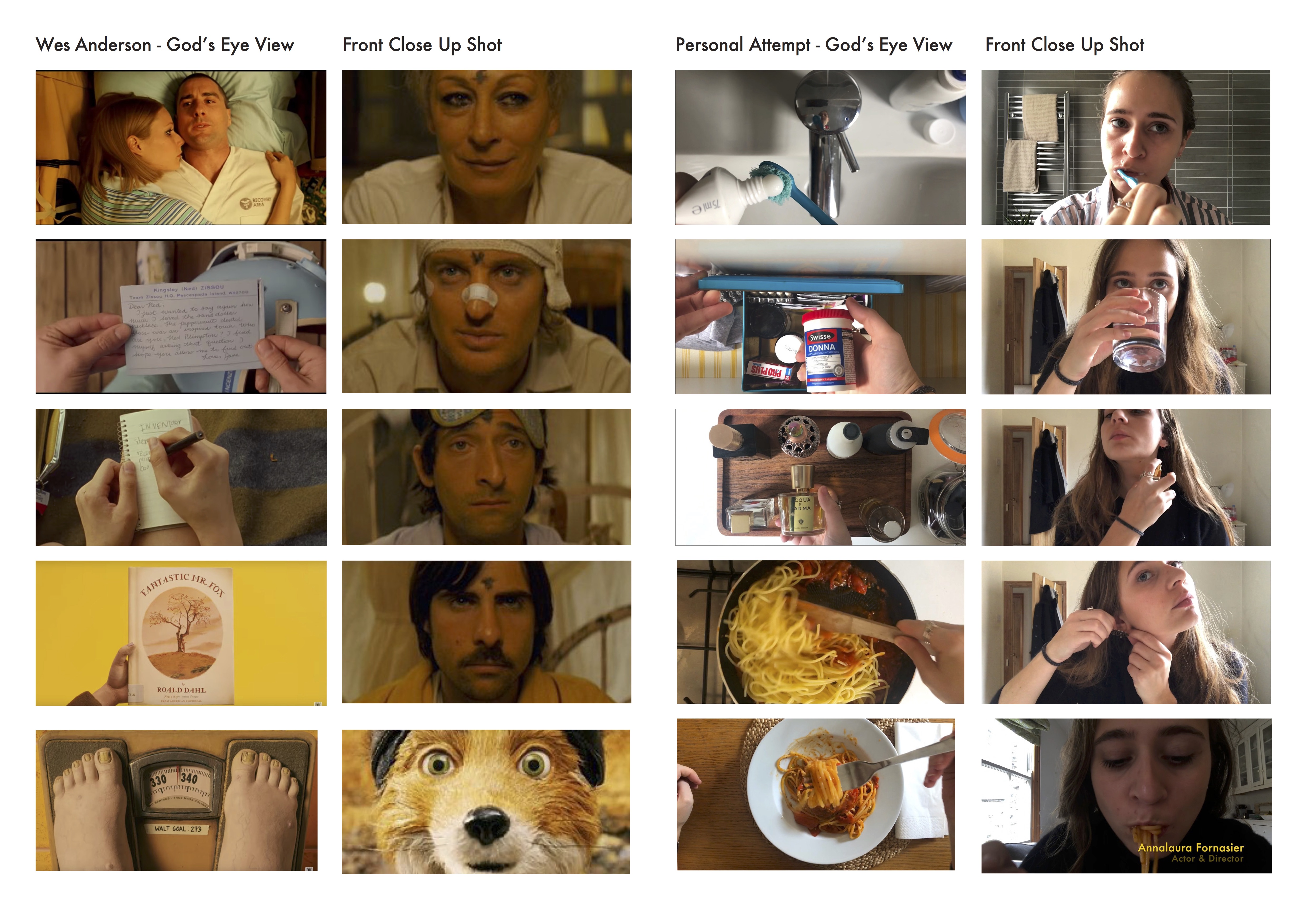 The interest for Wes Anderson’s recurring use of two camera perspectives to enhance intimacy in his cinematography - the god’s eye view from above, used for objects and actions, and the frontal close up shot to show characters’ emotions – led towards a process of documentation of such views present in his films. The process of cataloging these views becomes the first act of mediation within the research.