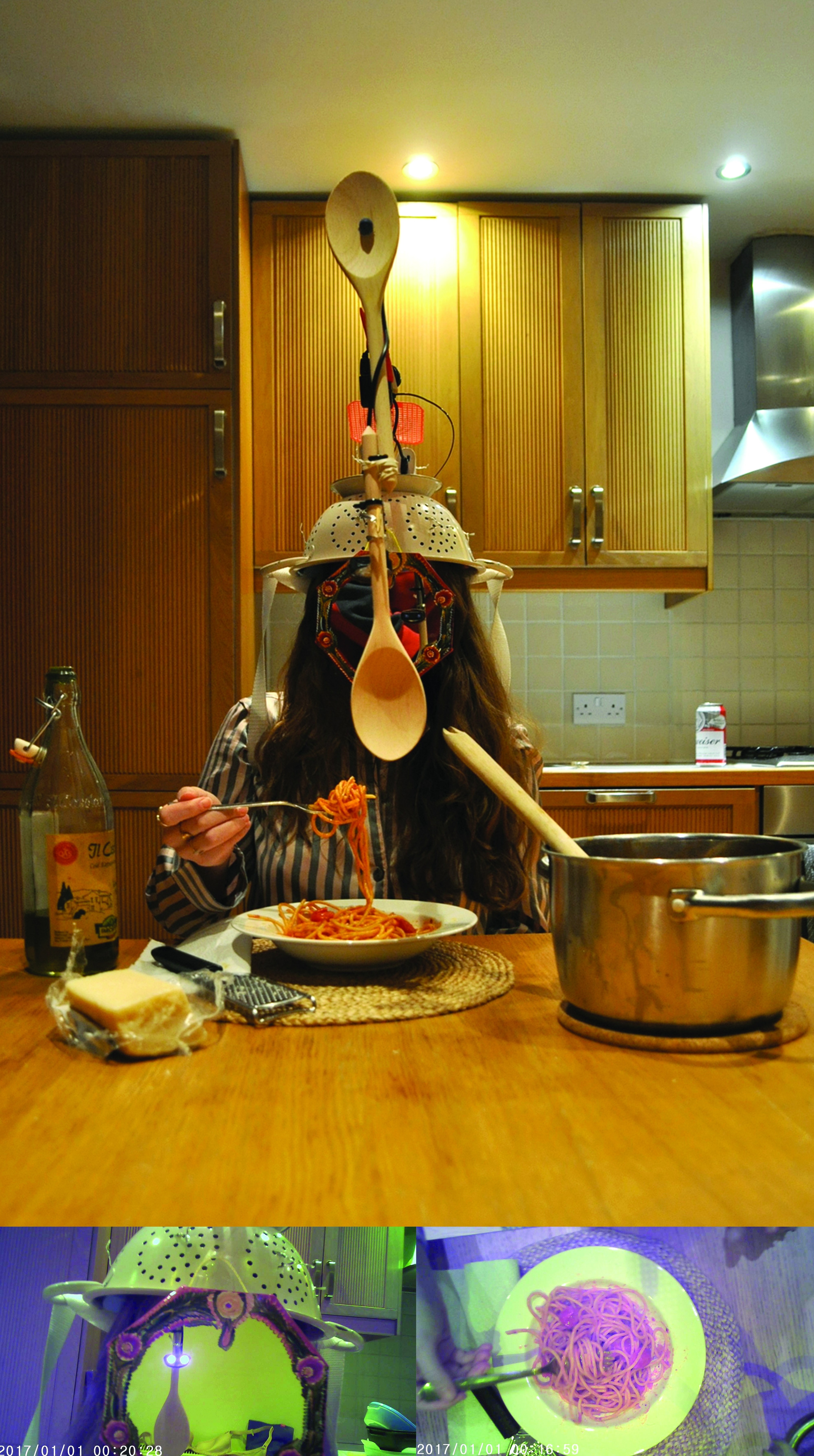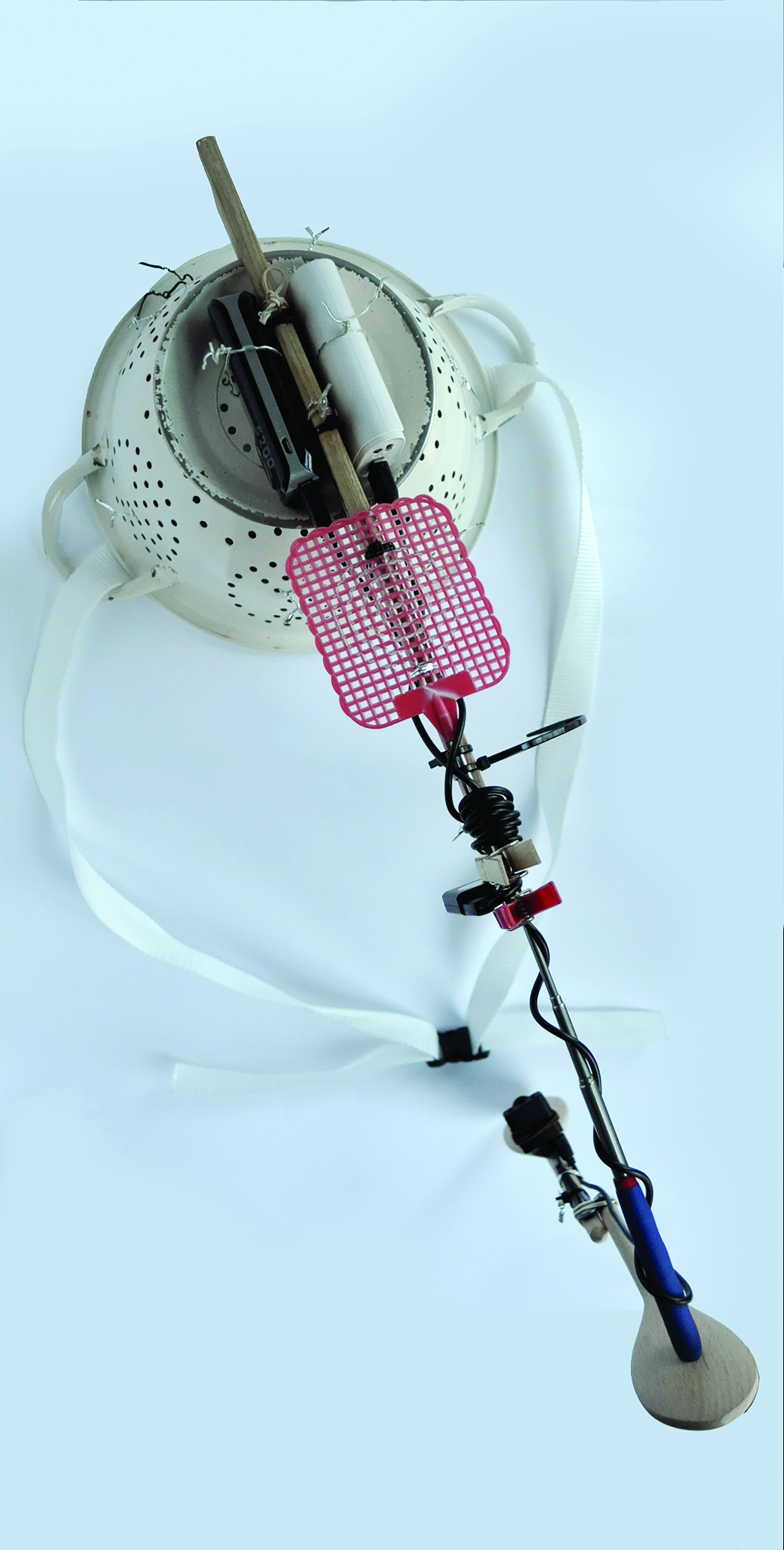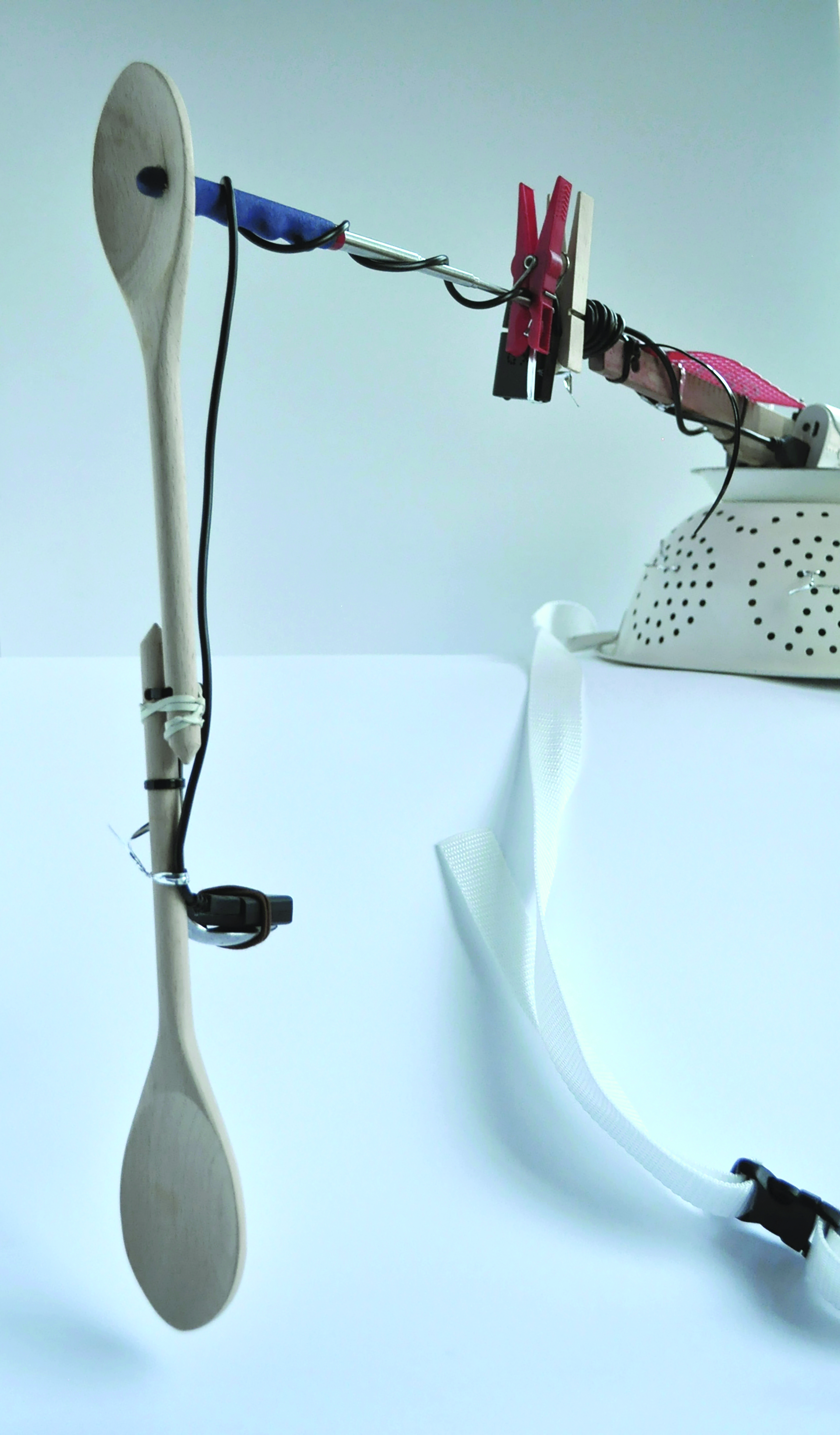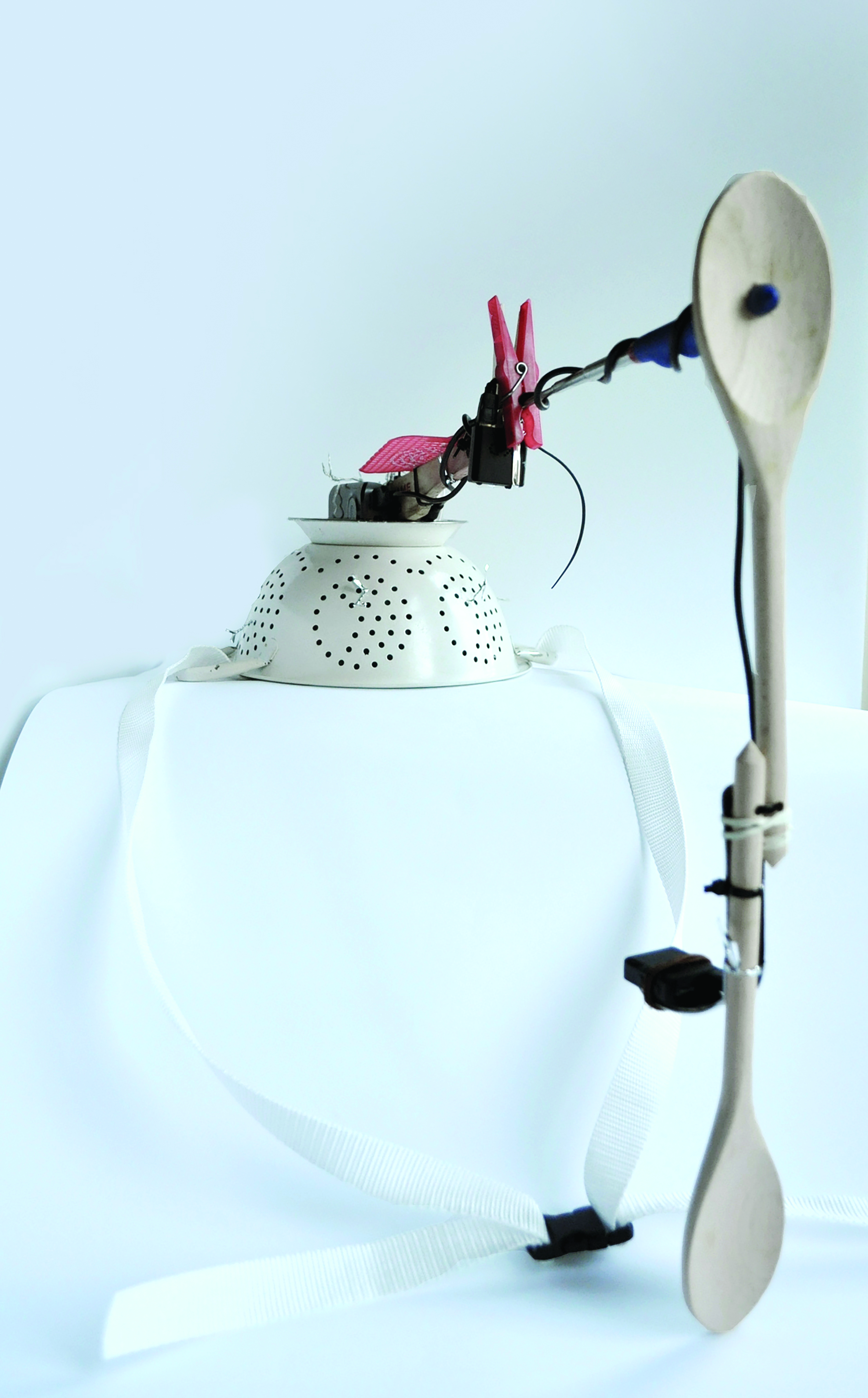 The two views (god’s eye view and front close up) are explored within the domestic realm, through the use of mini surveillance cameras. The filming style then undertakes a transformation: from cinematic to surveilling. The views are mediated through a prosthetic element, purposely built to enable the cameras to capture and observe an individual’s activities and objects encounters within the home. Made using utensils such as a colander, ladles, spoons, a swatter, pegs, sponges and power banks, the prosthetic ultimately becomes the embodiment of the language of domesticity, a representation of one’s domestic environment.
