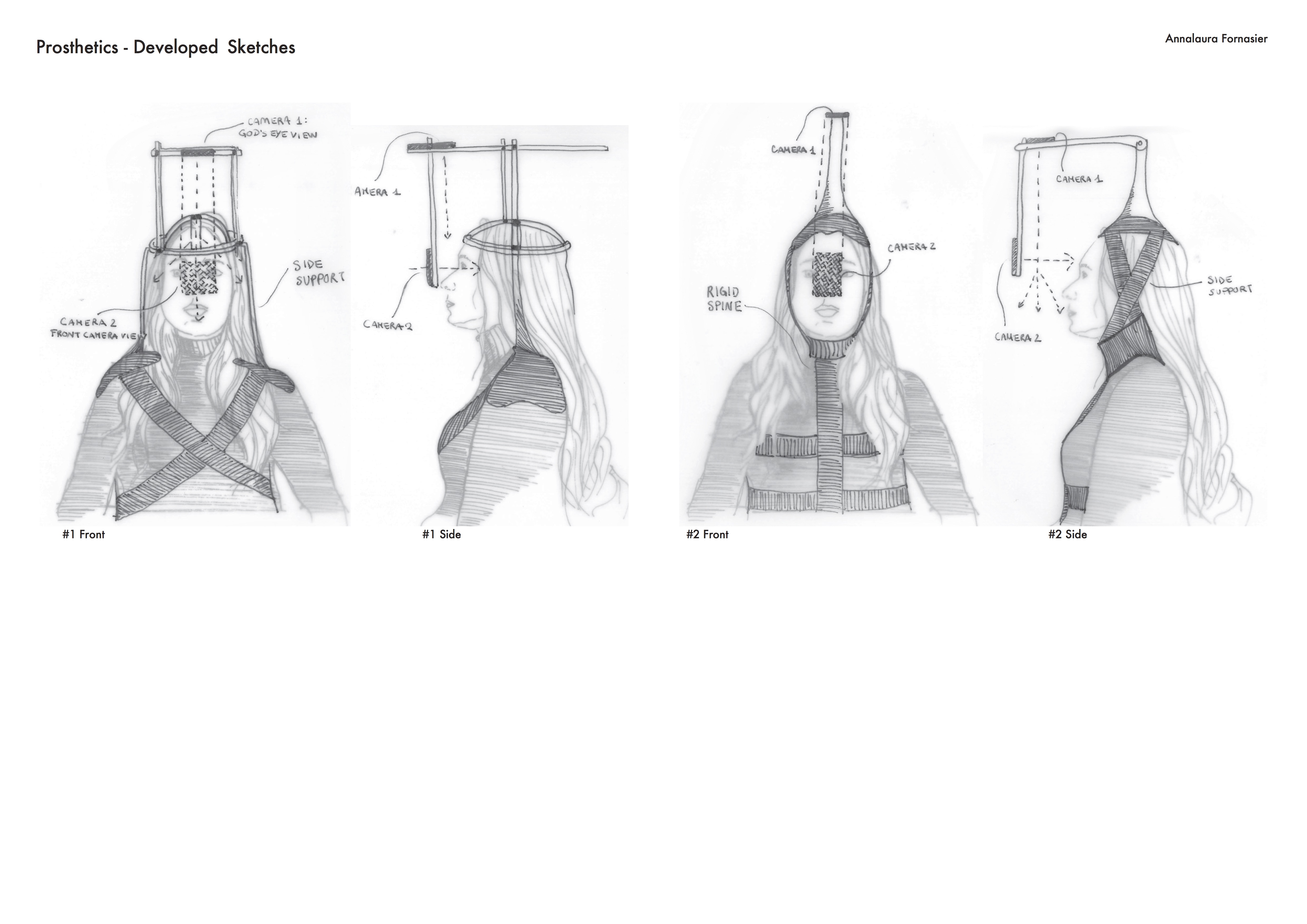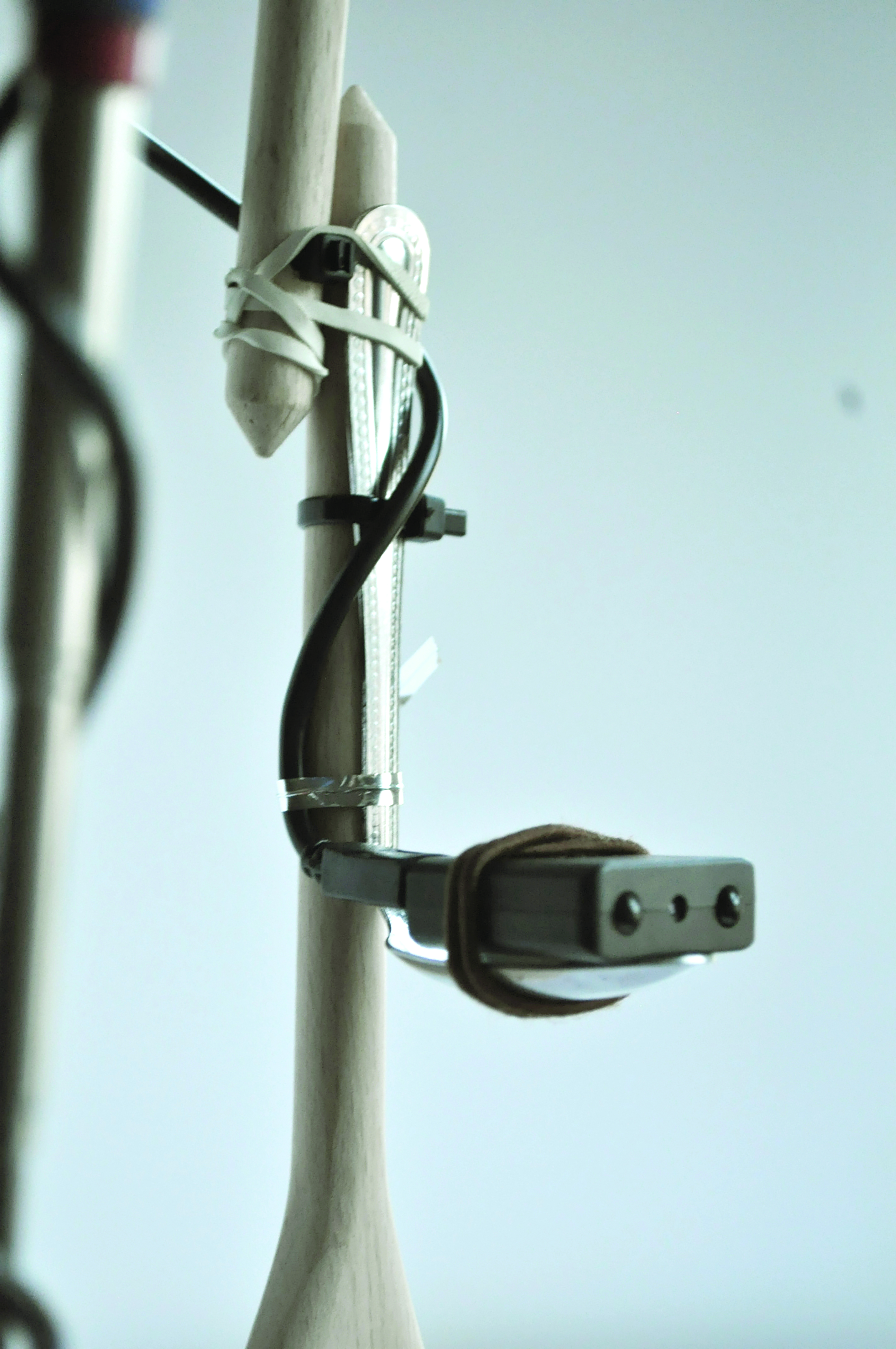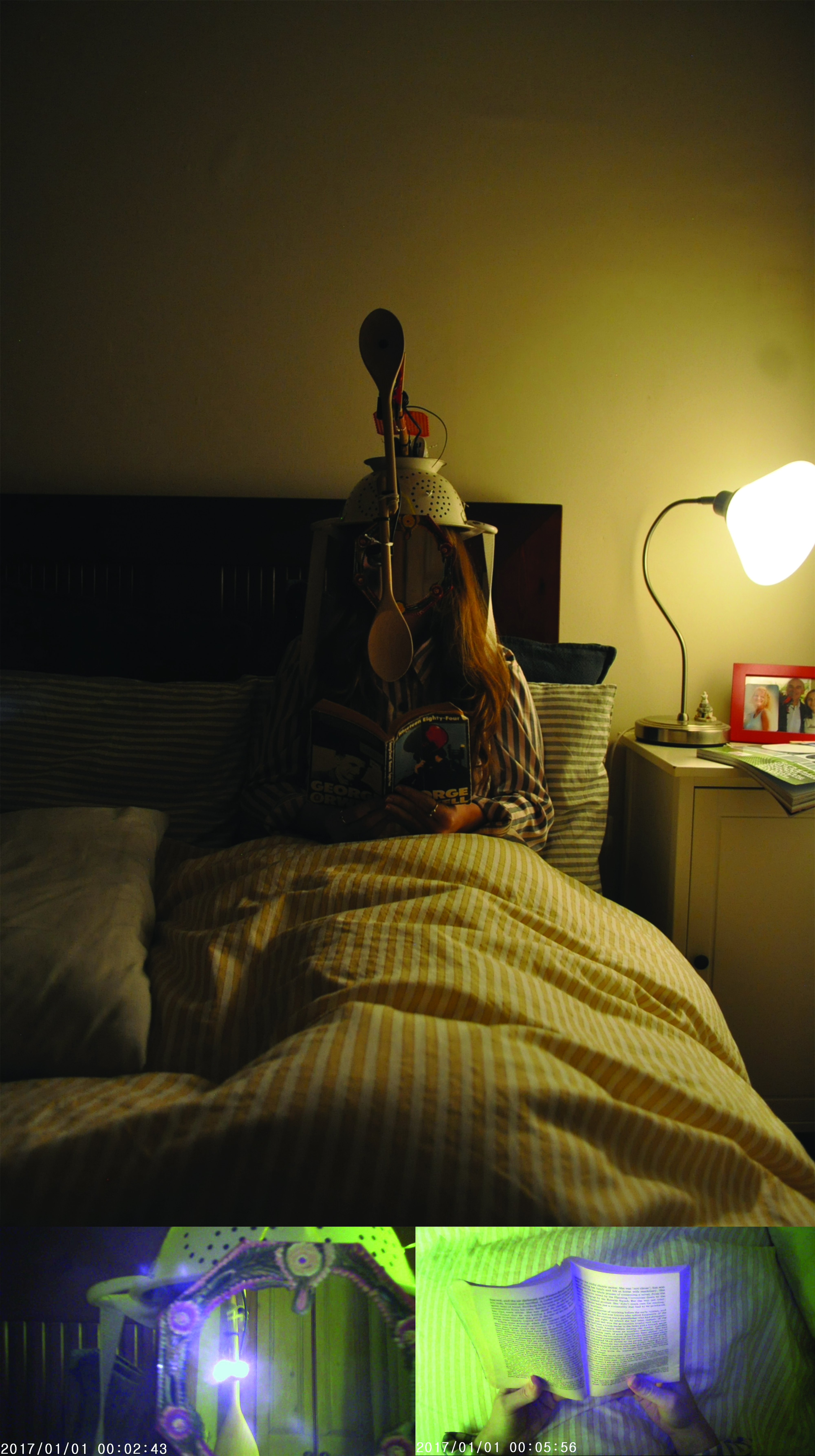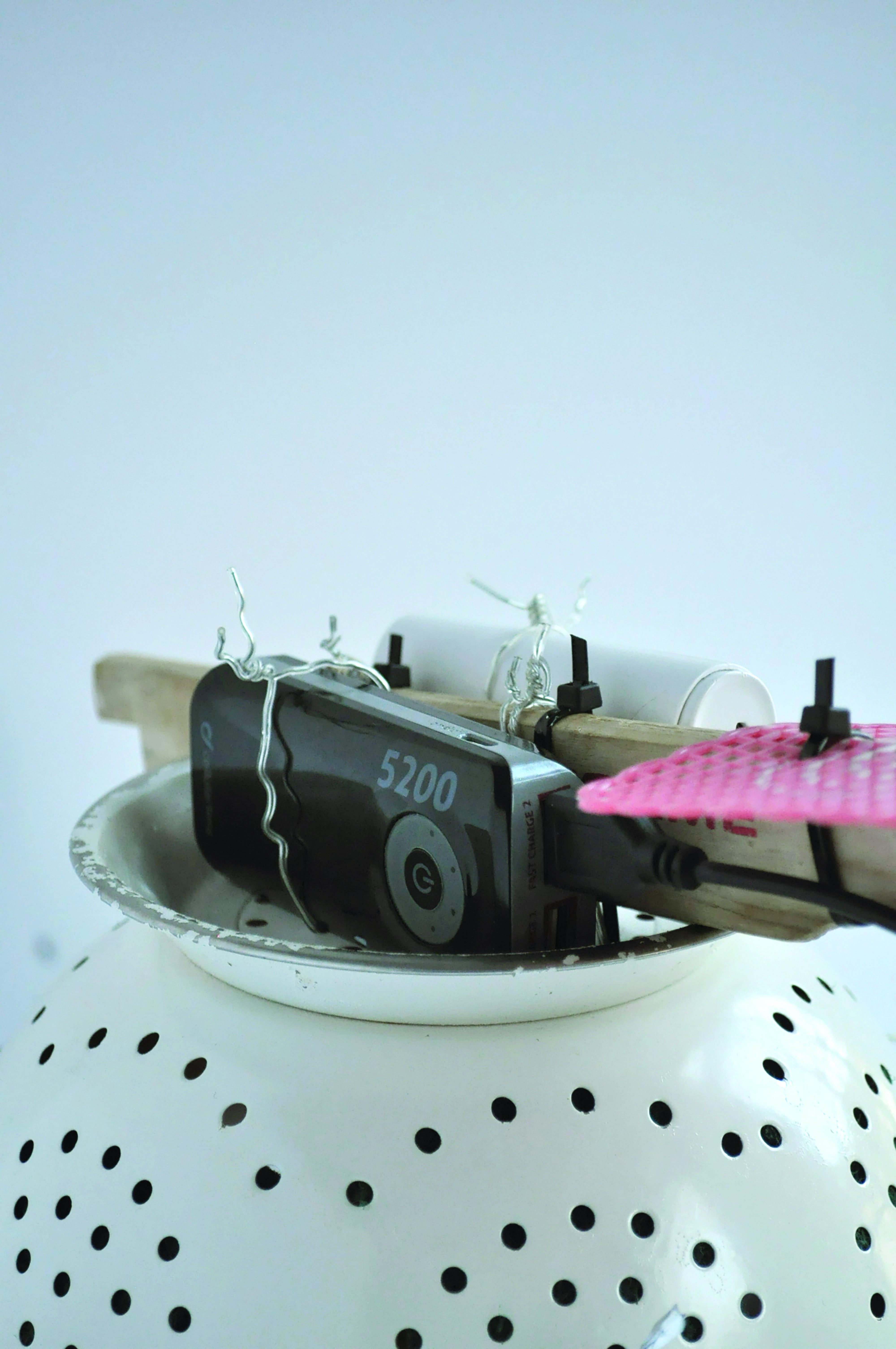 The two views (god’s eye view and front close up) are explored within the domestic realm, through the use of mini surveillance cameras. The filming style then undertakes a transformation: from cinematic to surveilling. The views are mediated through a prosthetic element, purposely built to enable the cameras to capture and observe an individual’s activities and objects encounters within the home. Made using utensils such as a colander, ladles, spoons, a swatter, pegs, sponges and power banks, the prosthetic ultimately becomes the embodiment of the language of domesticity, a representation of one’s domestic environment.