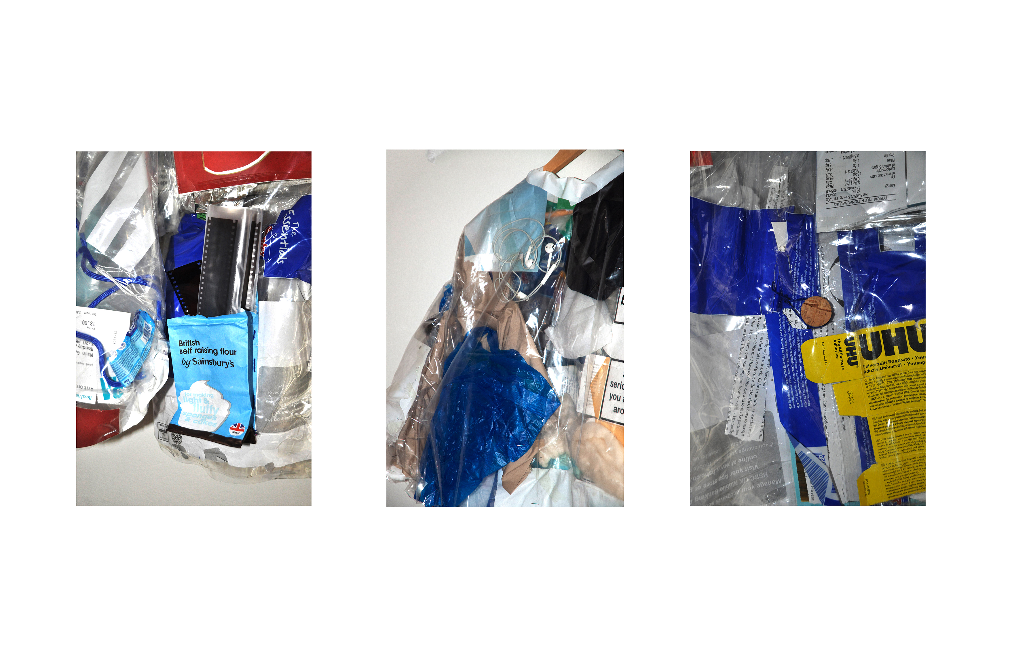 My research started with an archival practice of my own waste materials. The garment is finally consisted of waste collected over four days and covered by recycled transparent plastic hand sewed and stapled together. The overall recycled waste textile uses different types of materials: paper, plastic, fabric and aluminium. Other elements are simply re-used in their shape changing their function. In fact, the Sainsbury’s flour pack becomes a pocket and the cork bottle cap a button. The label is an analytic explanation of the different materials used.