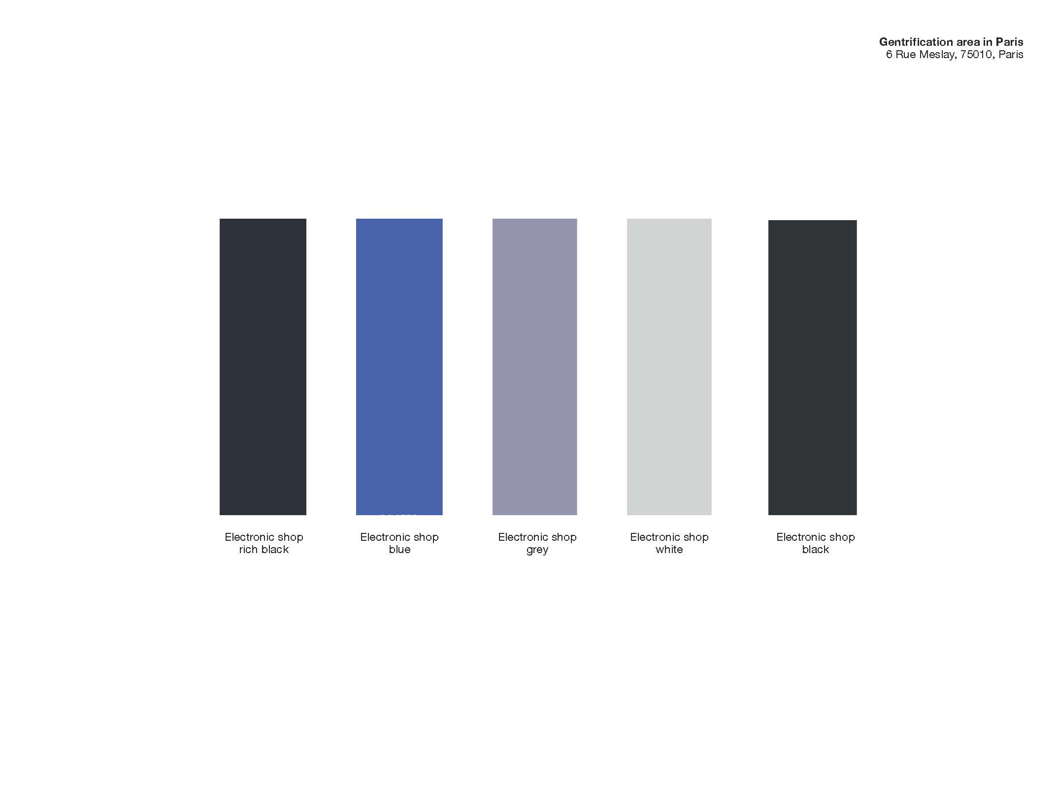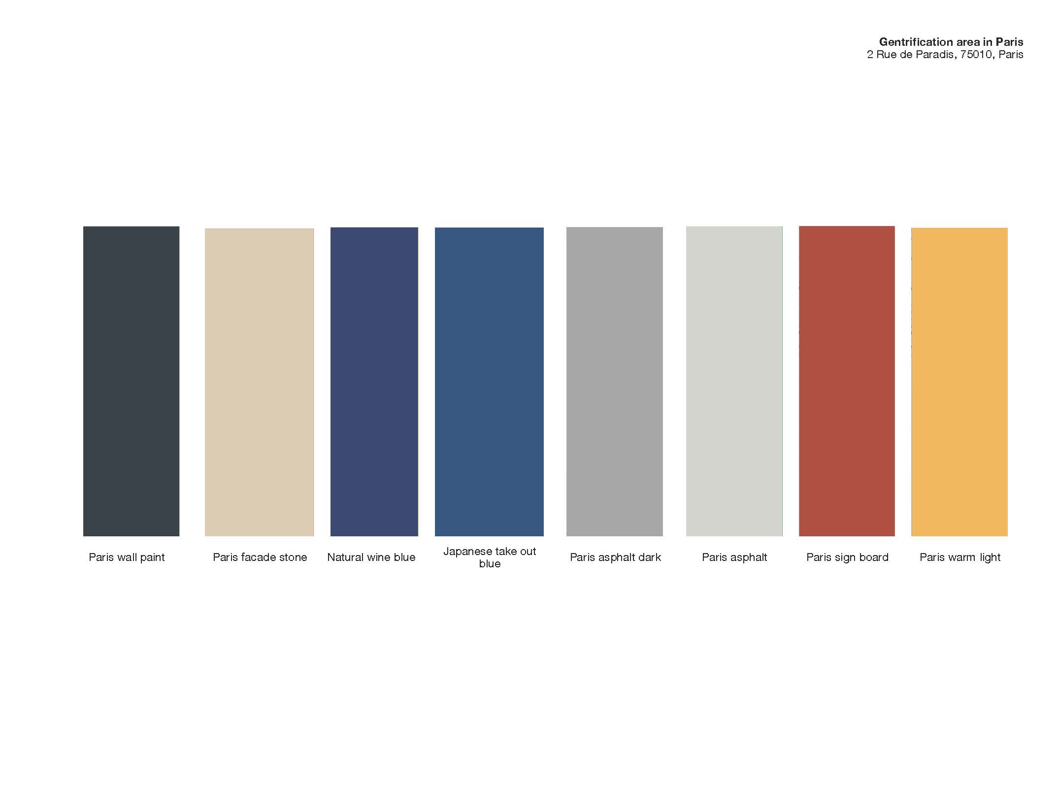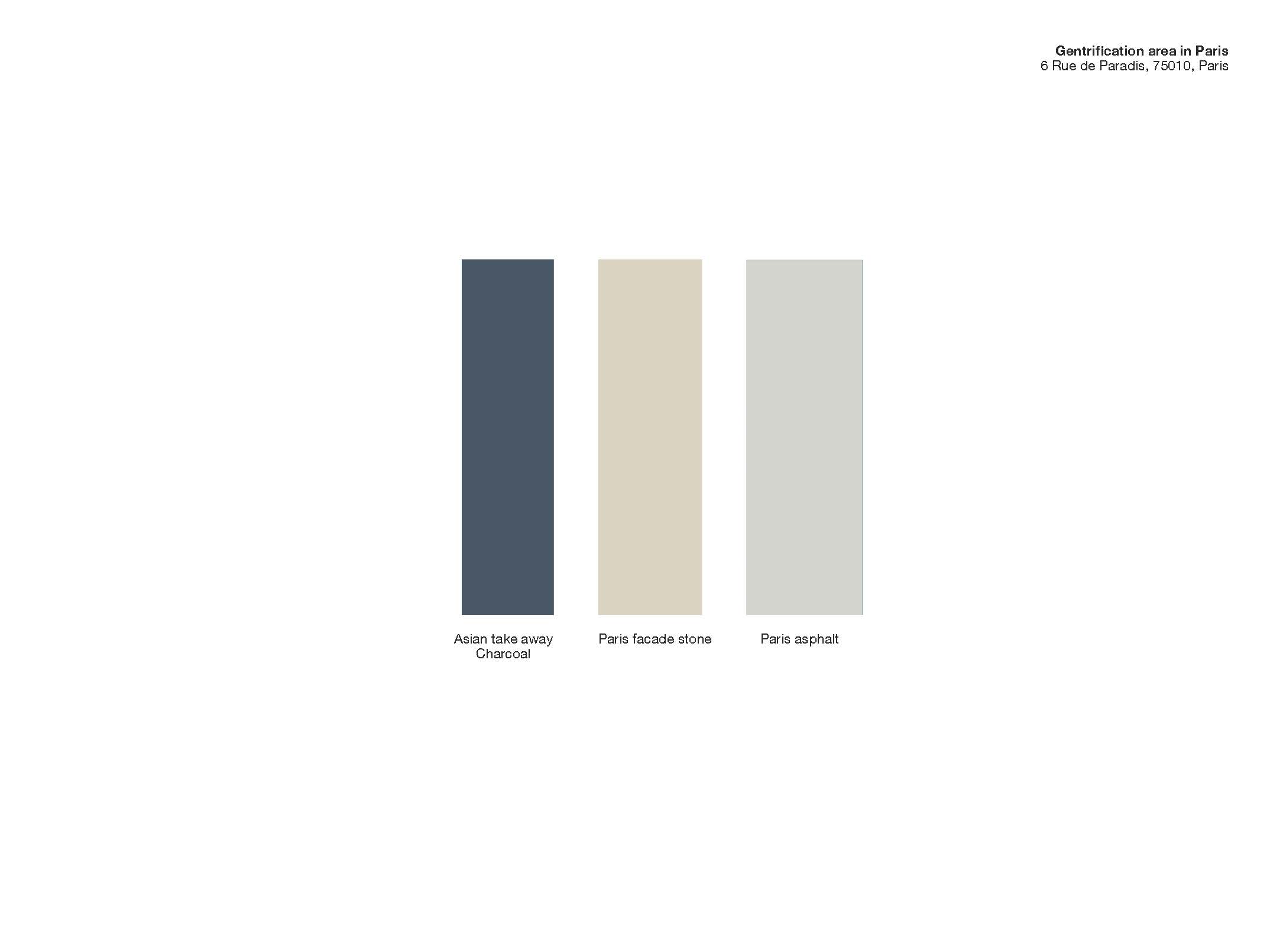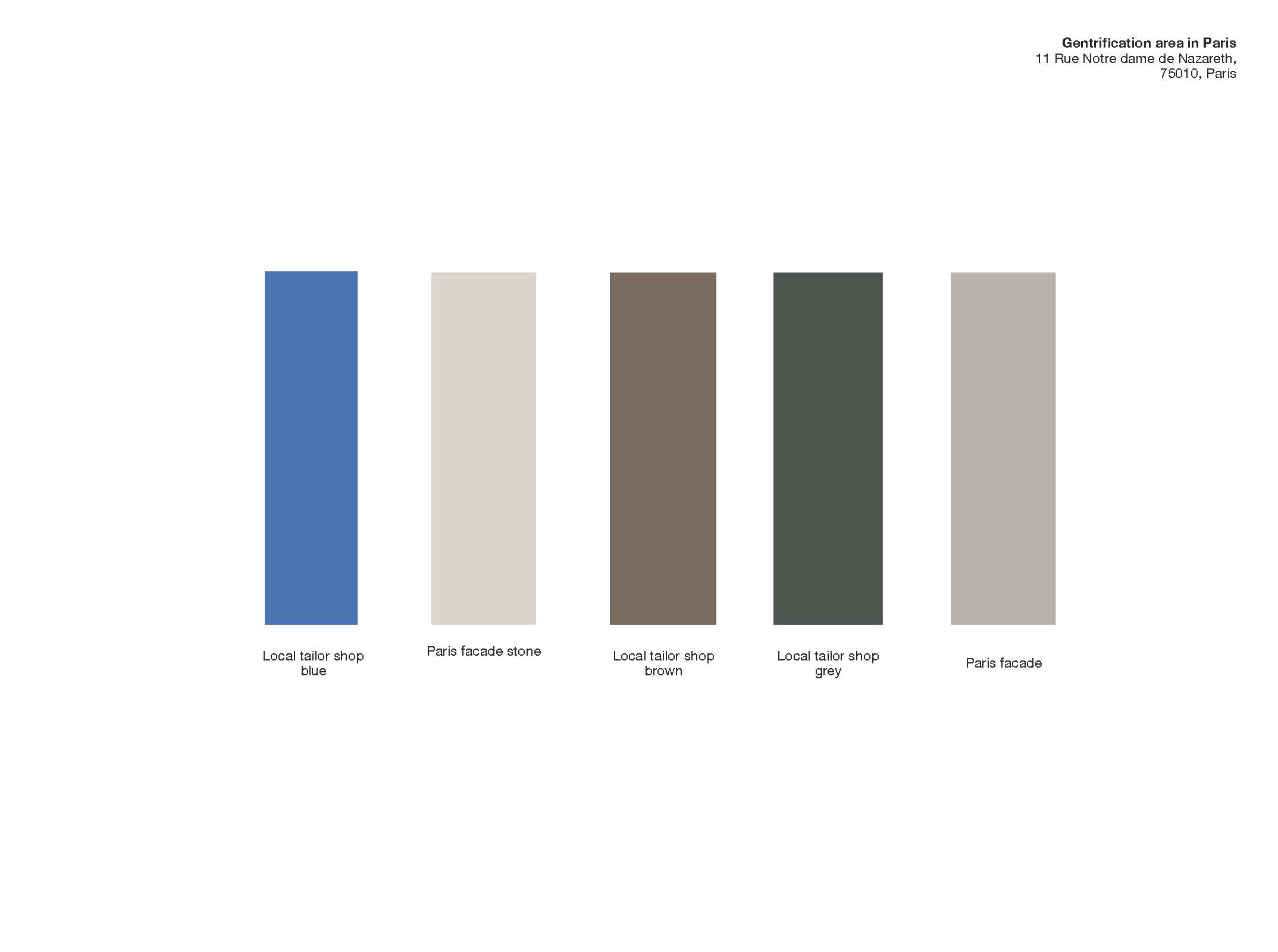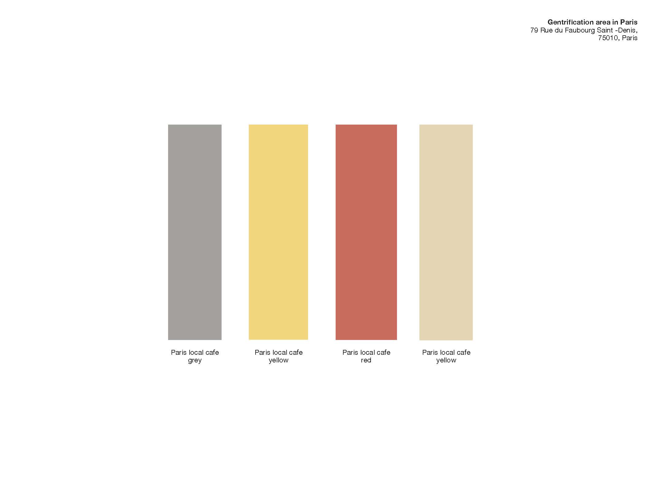 Paris is no exception to the phenomenon of gentrification observed in many capitals 2, which results in the arrival of executives in working-class neighborhoods, thus leading to a demographic change. In Paris as elsewhere, it is the increase in housing prices that is gradually excluding the poorest from central districts. First come the artists, then the cranes. As the kamikaze pilots of urban renewal, wherever the creatives go, developers will follow, rents will rise, the artists will move on, and the pre-existing community will be evicted. The project documents the transformation in Paris 3rd district that is caused by the process of gentrification. By using photography, I document the facades of all the store fronts through compiling their various colors. After classifying the stores, colors are extracted and named in relation to their context of origin. These stores range from shoe stores, accessories, and electronics that are threatened by a new wave of art galleries, art bookstores, artist studios and coffee shops. The final photographic project compiles through extraction the range of colors of gentrification as an urban coded collection.