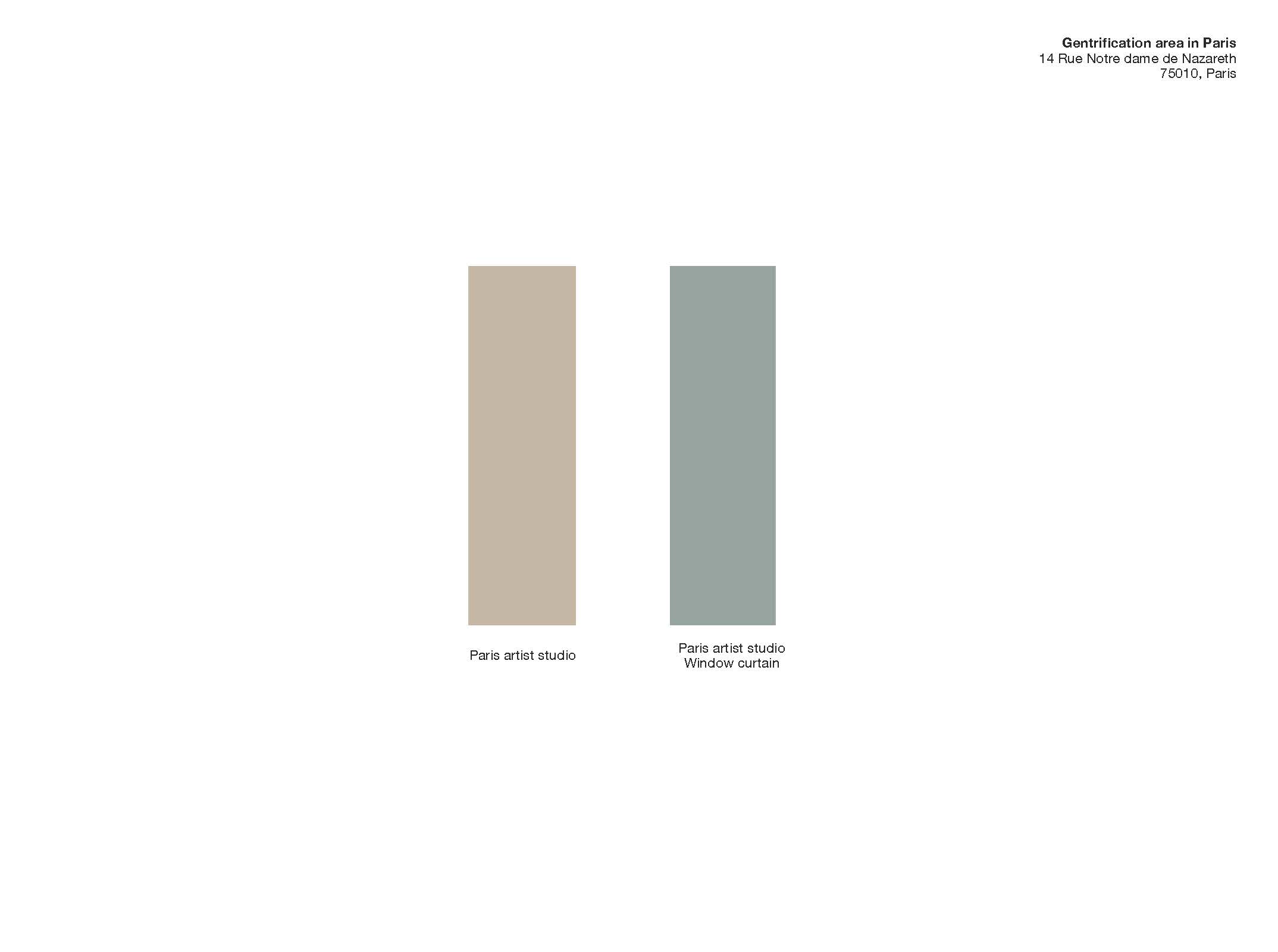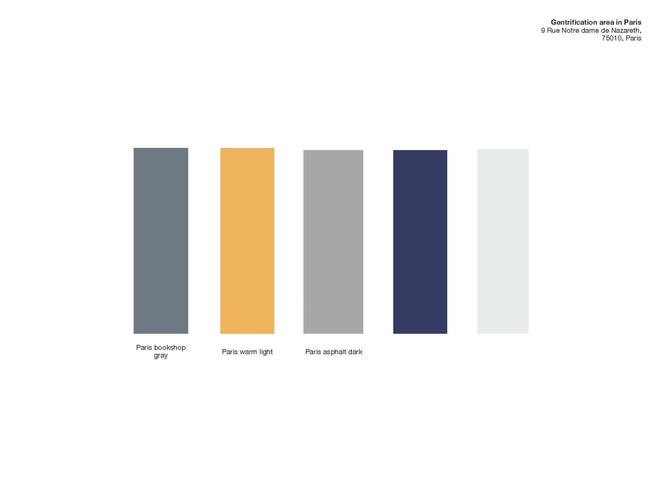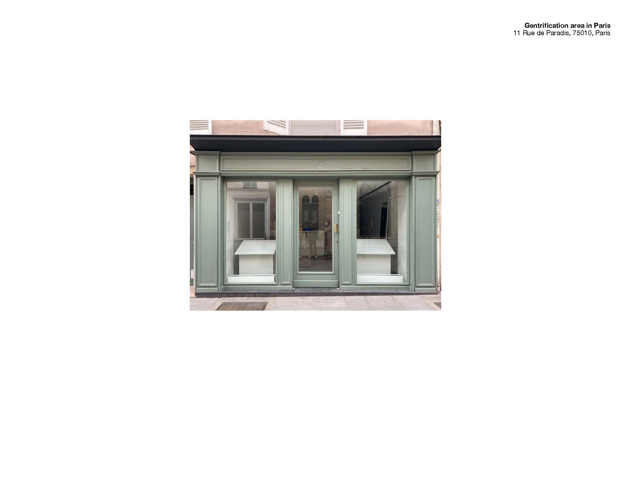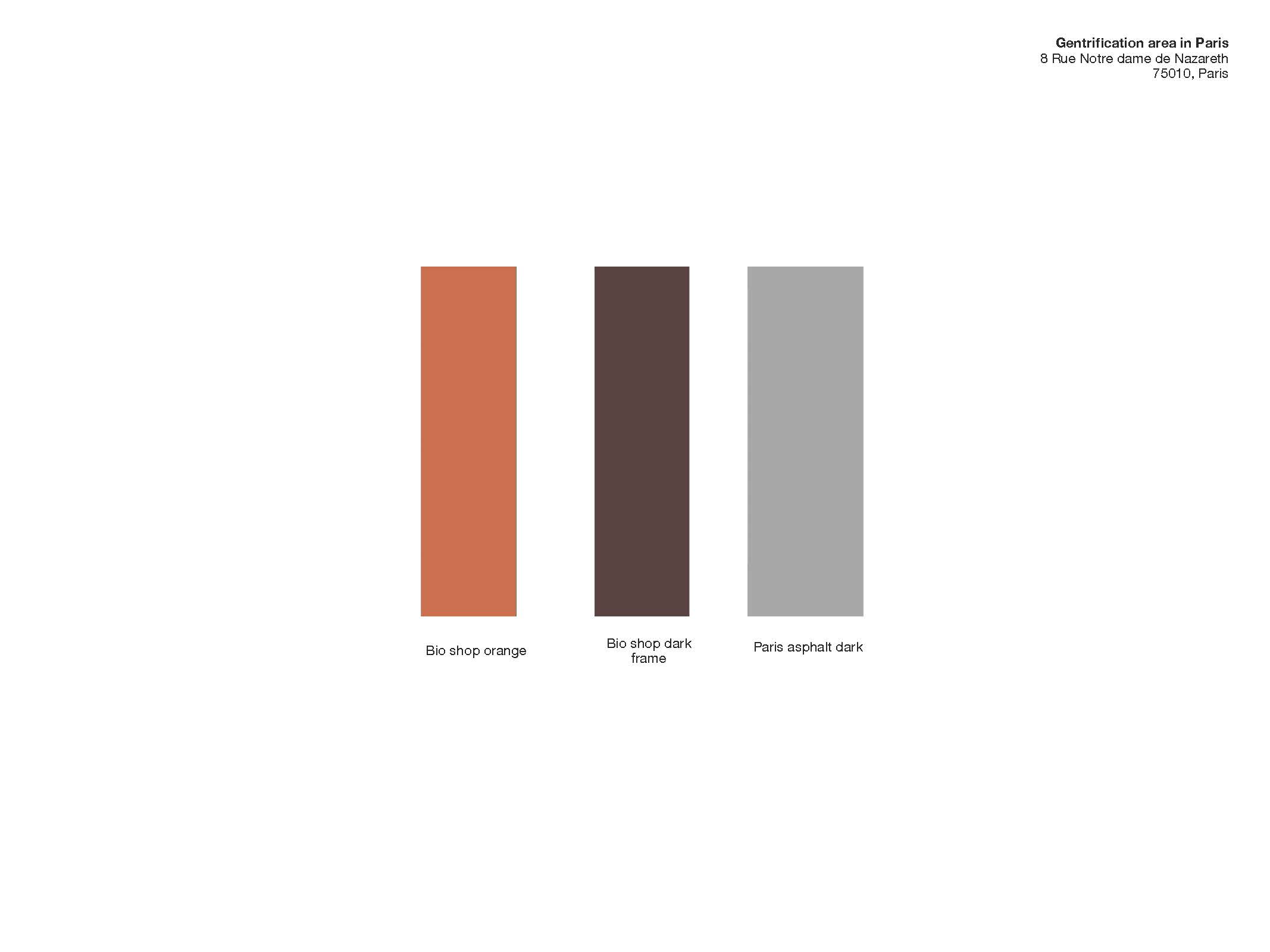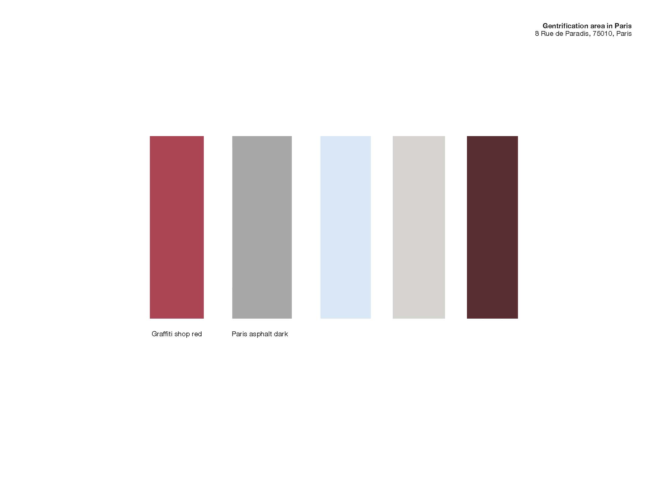 Paris is no exception to the phenomenon of gentrification observed in many capitals 2, which results in the arrival of executives in working-class neighborhoods, thus leading to a demographic change. In Paris as elsewhere, it is the increase in housing prices that is gradually excluding the poorest from central districts. First come the artists, then the cranes. As the kamikaze pilots of urban renewal, wherever the creatives go, developers will follow, rents will rise, the artists will move on, and the pre-existing community will be evicted. The project documents the transformation in Paris 3rd district that is caused by the process of gentrification. By using photography, I document the facades of all the store fronts through compiling their various colors. After classifying the stores, colors are extracted and named in relation to their context of origin. These stores range from shoe stores, accessories, and electronics that are threatened by a new wave of art galleries, art bookstores, artist studios and coffee shops. The final photographic project compiles through extraction the range of colors of gentrification as an urban coded collection.