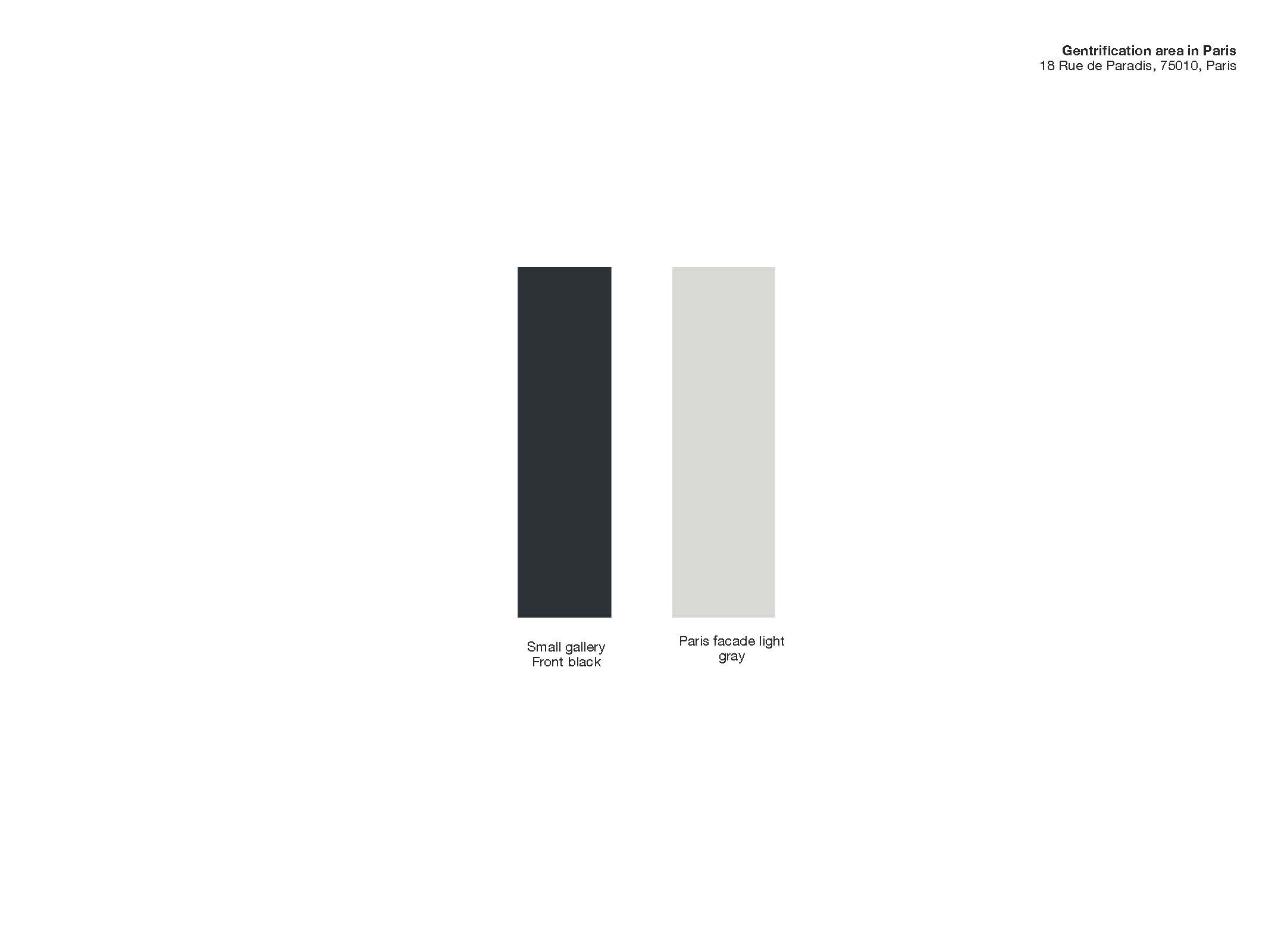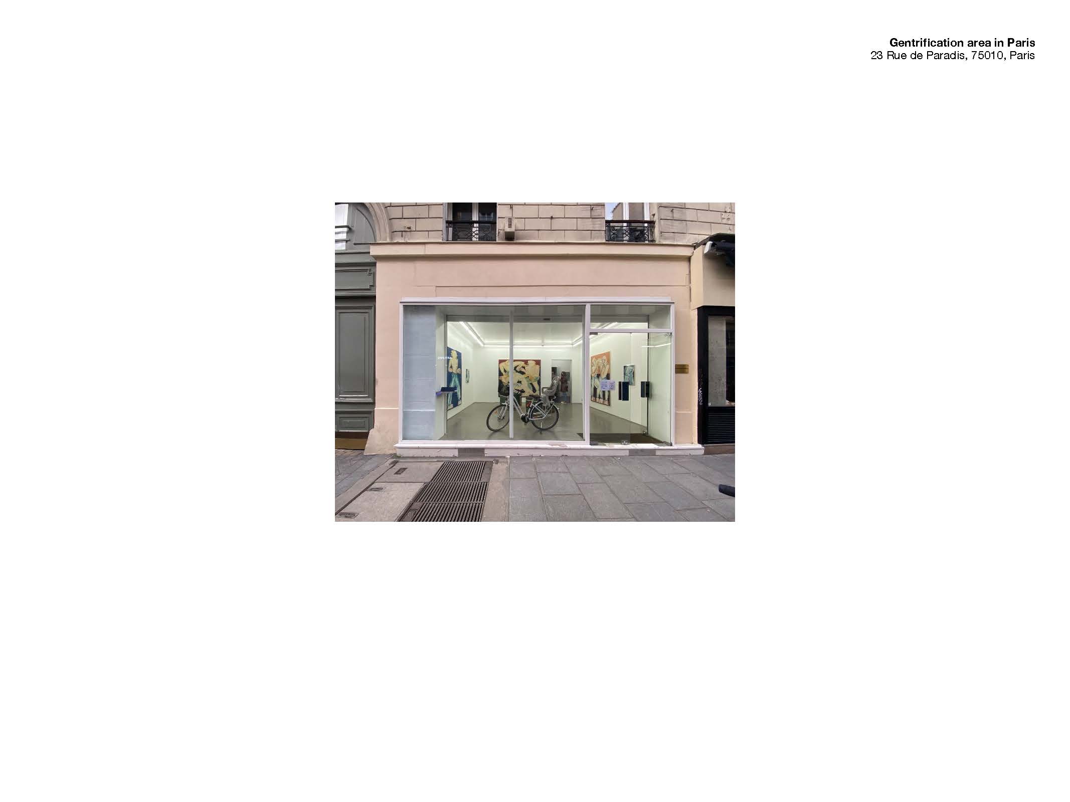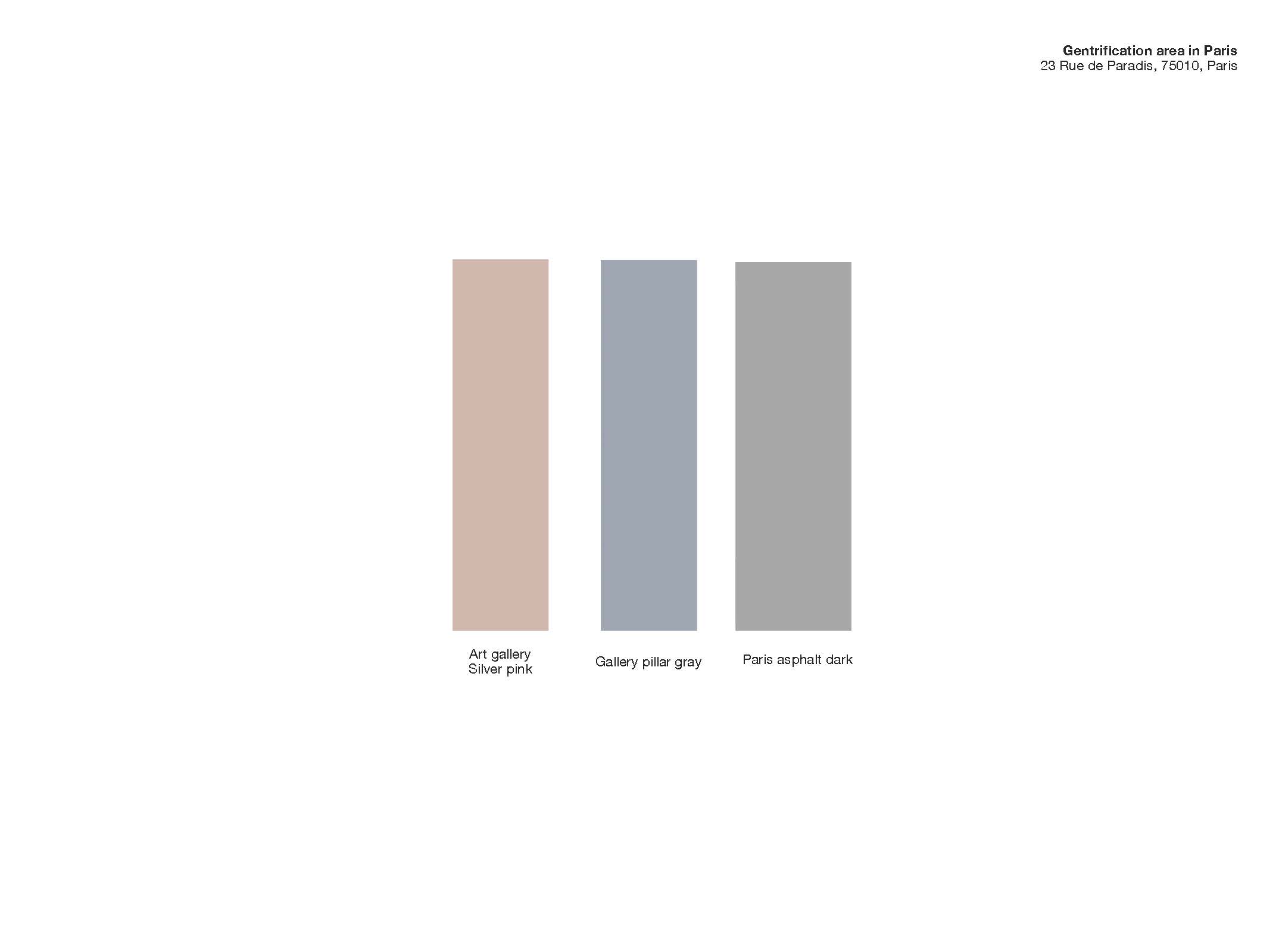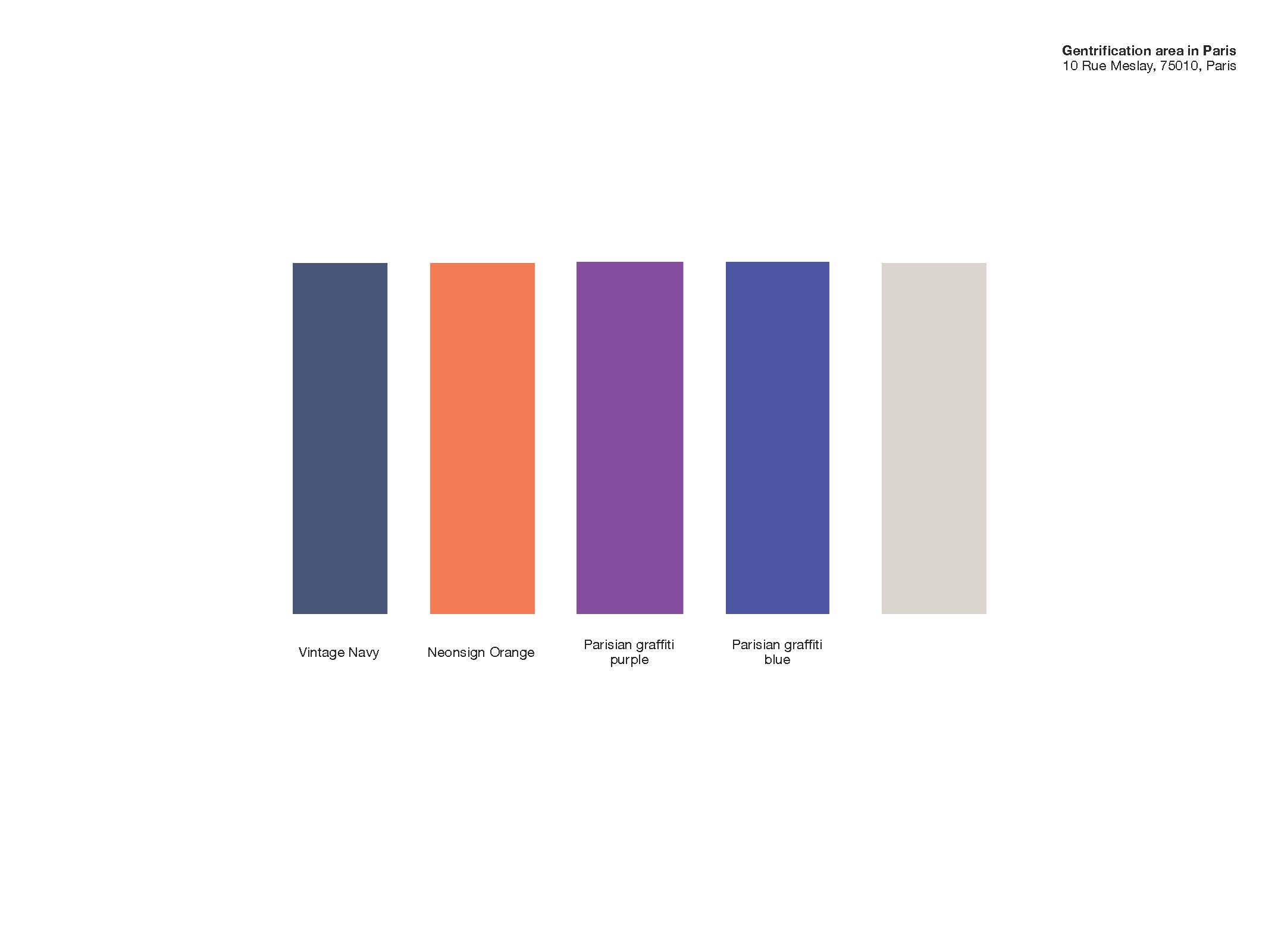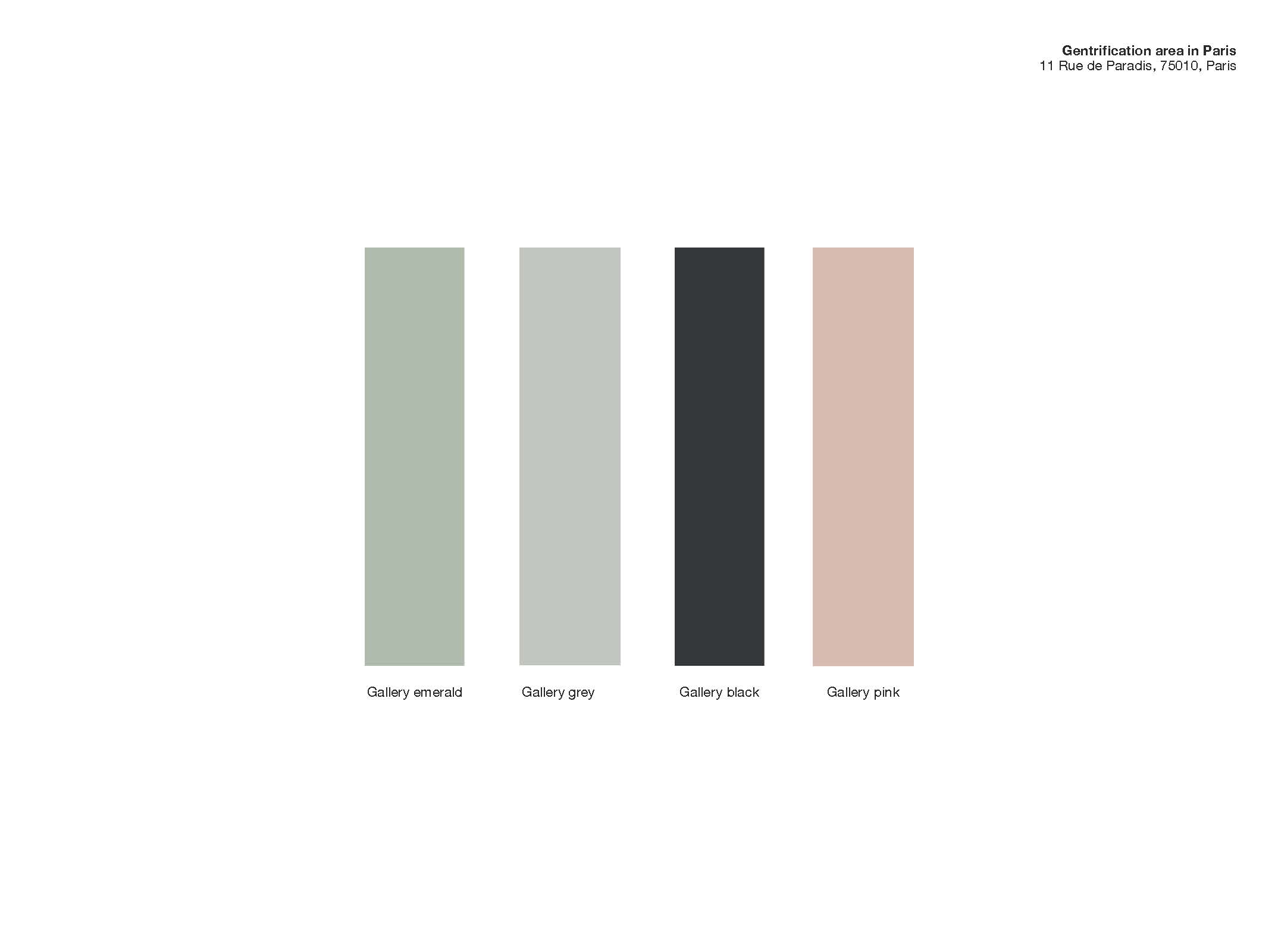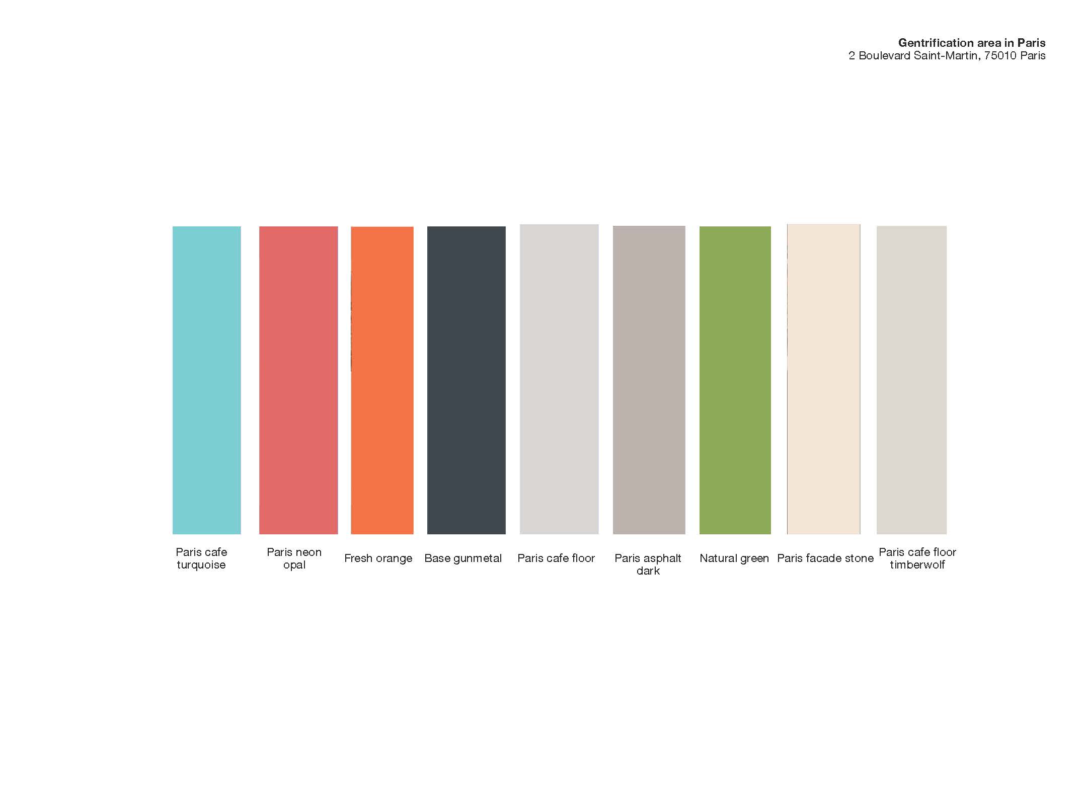 Paris is no exception to the phenomenon of gentrification observed in many capitals 2, which results in the arrival of executives in working-class neighborhoods, thus leading to a demographic change. In Paris as elsewhere, it is the increase in housing prices that is gradually excluding the poorest from central districts. First come the artists, then the cranes. As the kamikaze pilots of urban renewal, wherever the creatives go, developers will follow, rents will rise, the artists will move on, and the pre-existing community will be evicted. The project documents the transformation in Paris 3rd district that is caused by the process of gentrification. By using photography, I document the facades of all the store fronts through compiling their various colors. After classifying the stores, colors are extracted and named in relation to their context of origin. These stores range from shoe stores, accessories, and electronics that are threatened by a new wave of art galleries, art bookstores, artist studios and coffee shops. The final photographic project compiles through extraction the range of colors of gentrification as an urban coded collection.
