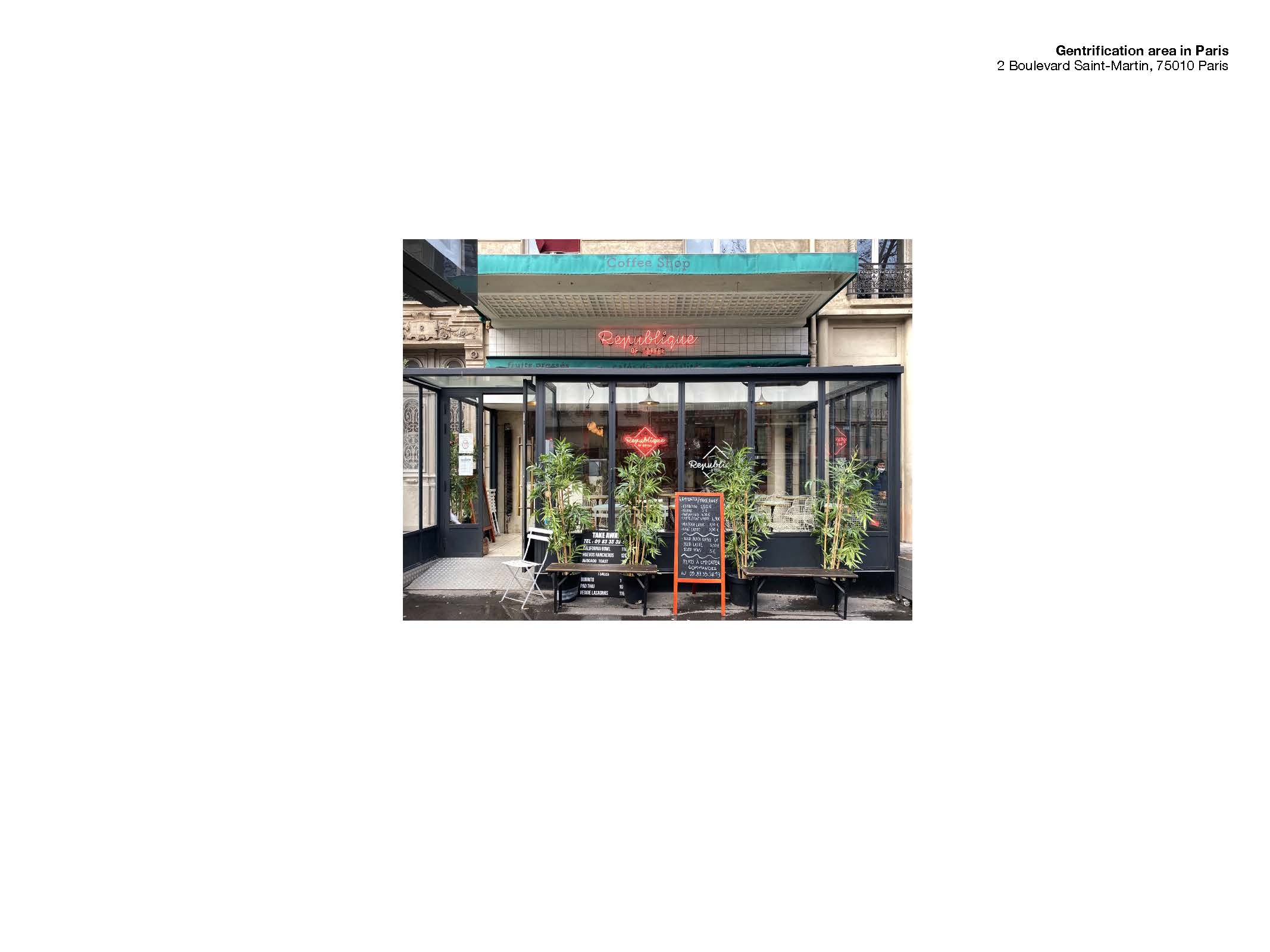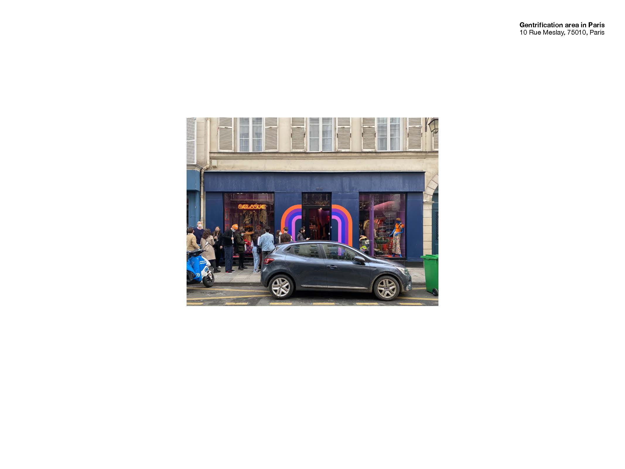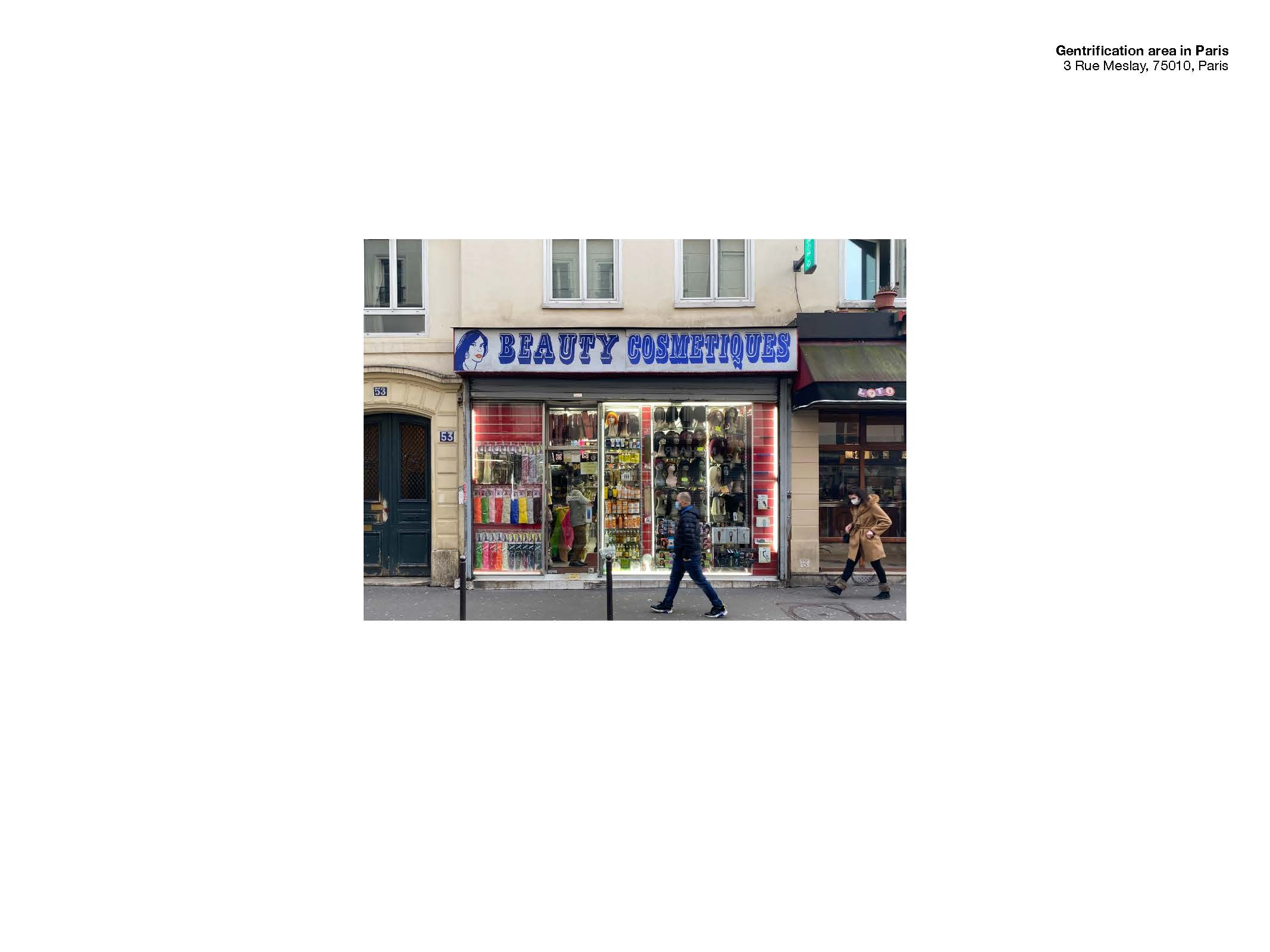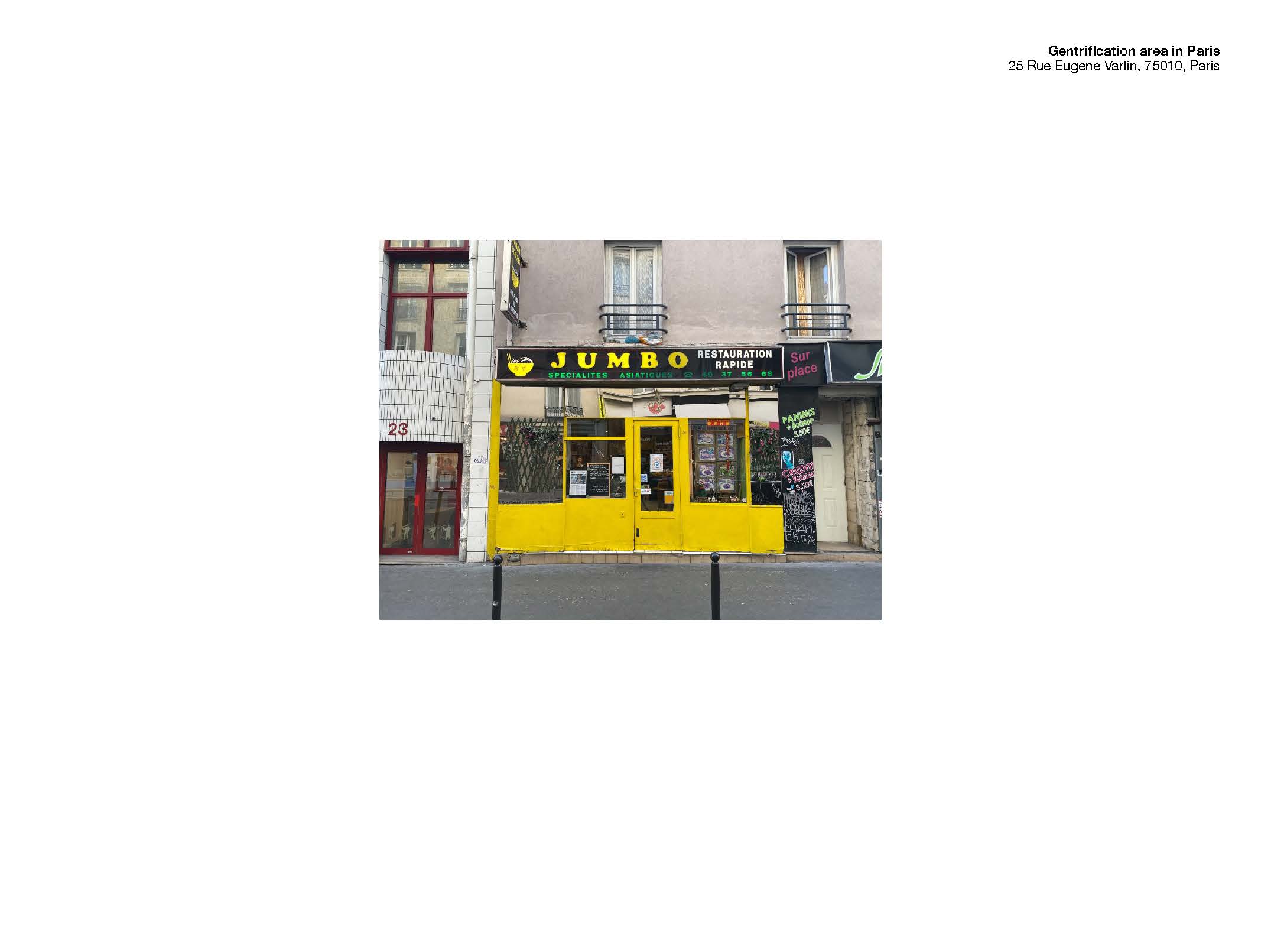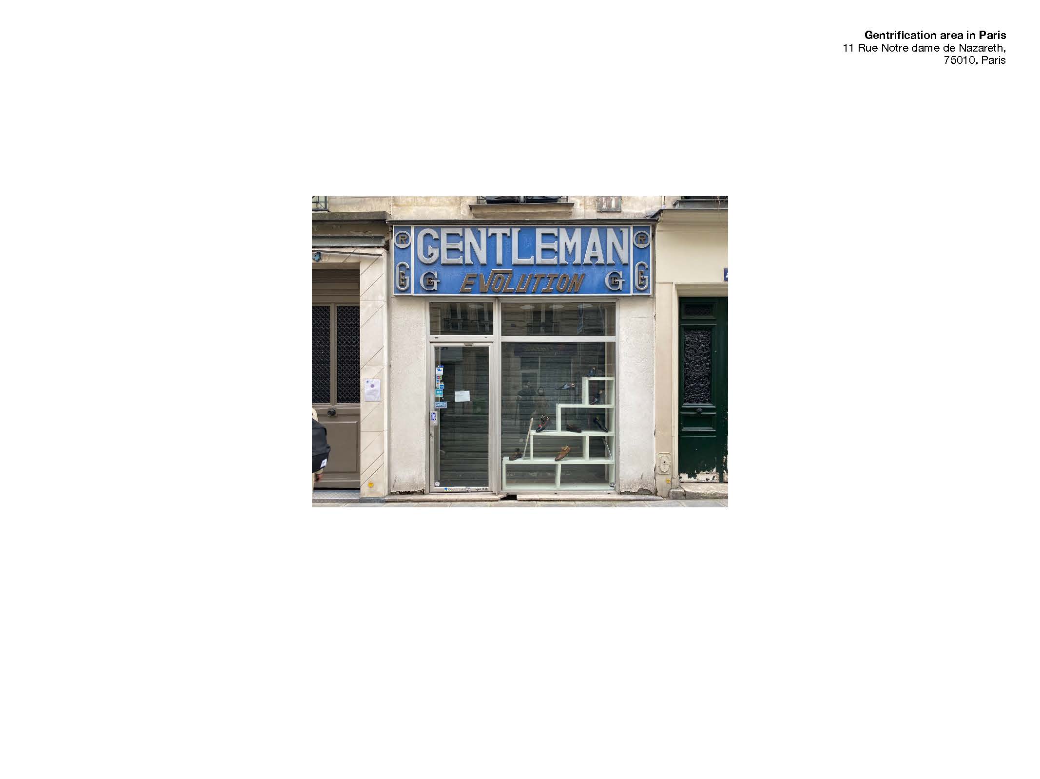 Paris is no exception to the phenomenon of gentrification observed in many capitals 2, which results in the arrival of executives in working-class neighborhoods, thus leading to a demographic change. In Paris as elsewhere, it is the increase in housing prices that is gradually excluding the poorest from central districts. First come the artists, then the cranes. As the kamikaze pilots of urban renewal, wherever the creatives go, developers will follow, rents will rise, the artists will move on, and the pre-existing community will be evicted. The project documents the transformation in Paris 3rd district that is caused by the process of gentrification. By using photography, I document the facades of all the store fronts through compiling their various colors. After classifying the stores, colors are extracted and named in relation to their context of origin. These stores range from shoe stores, accessories, and electronics that are threatened by a new wave of art galleries, art bookstores, artist studios and coffee shops. The final photographic project compiles through extraction the range of colors of gentrification as an urban coded collection.