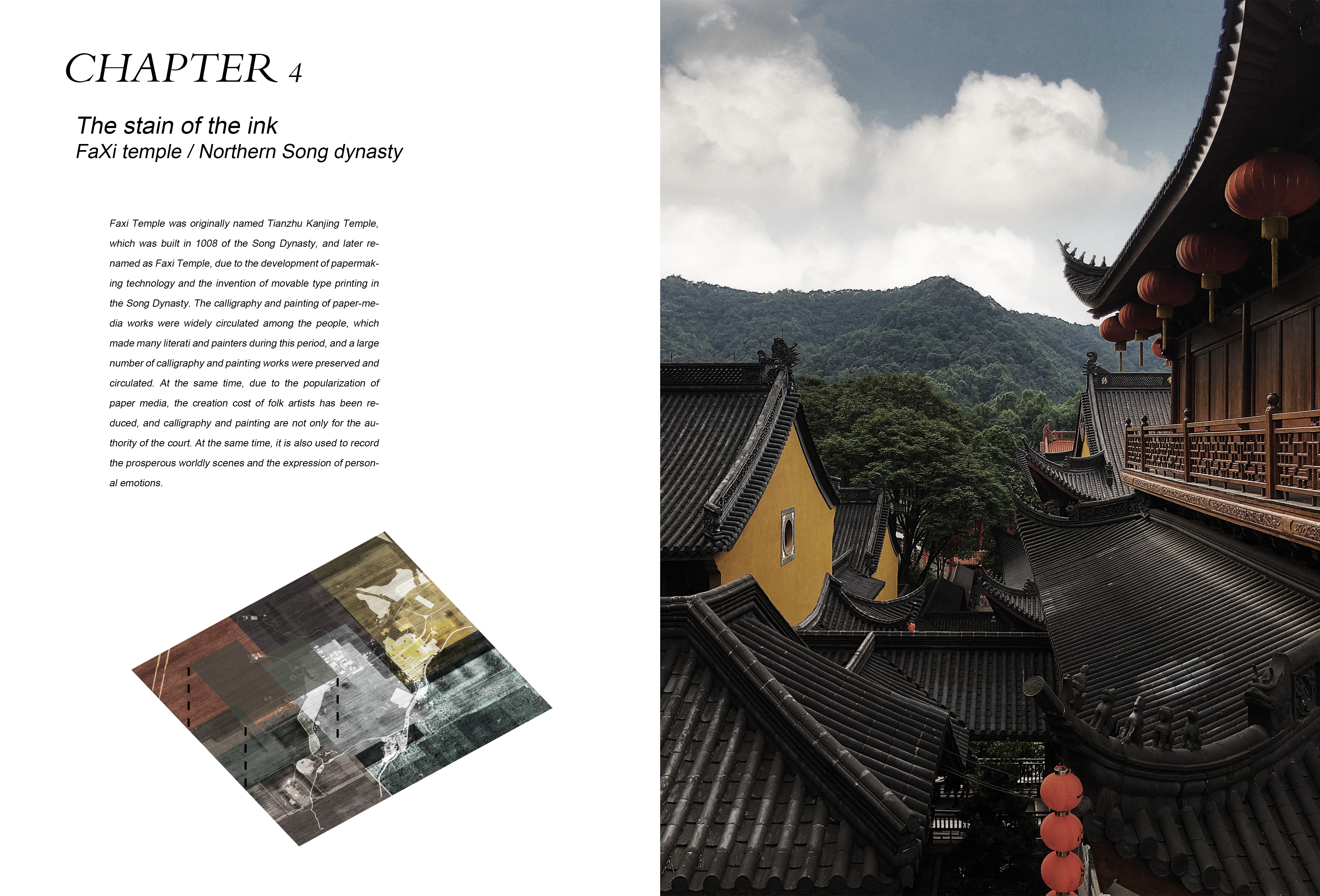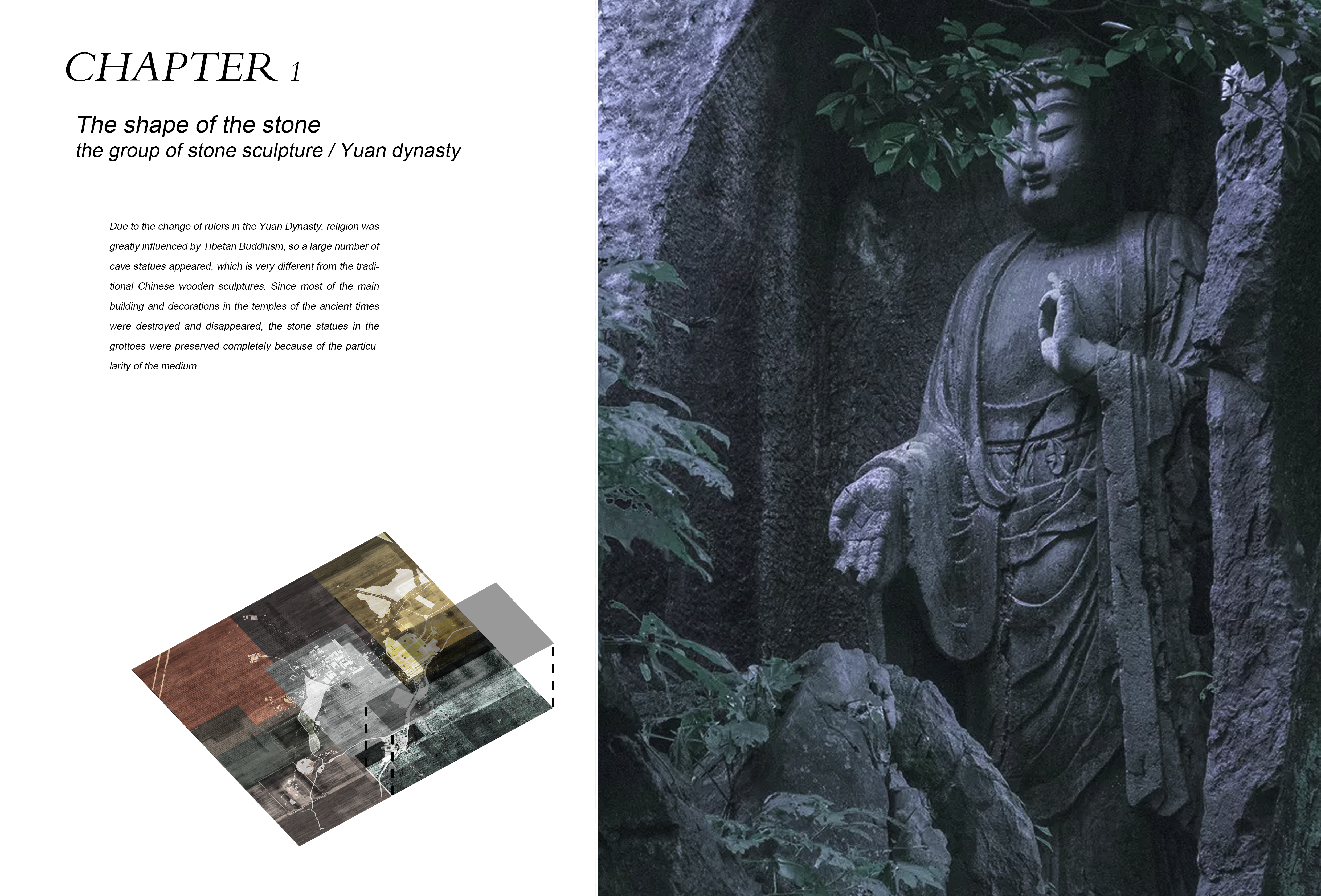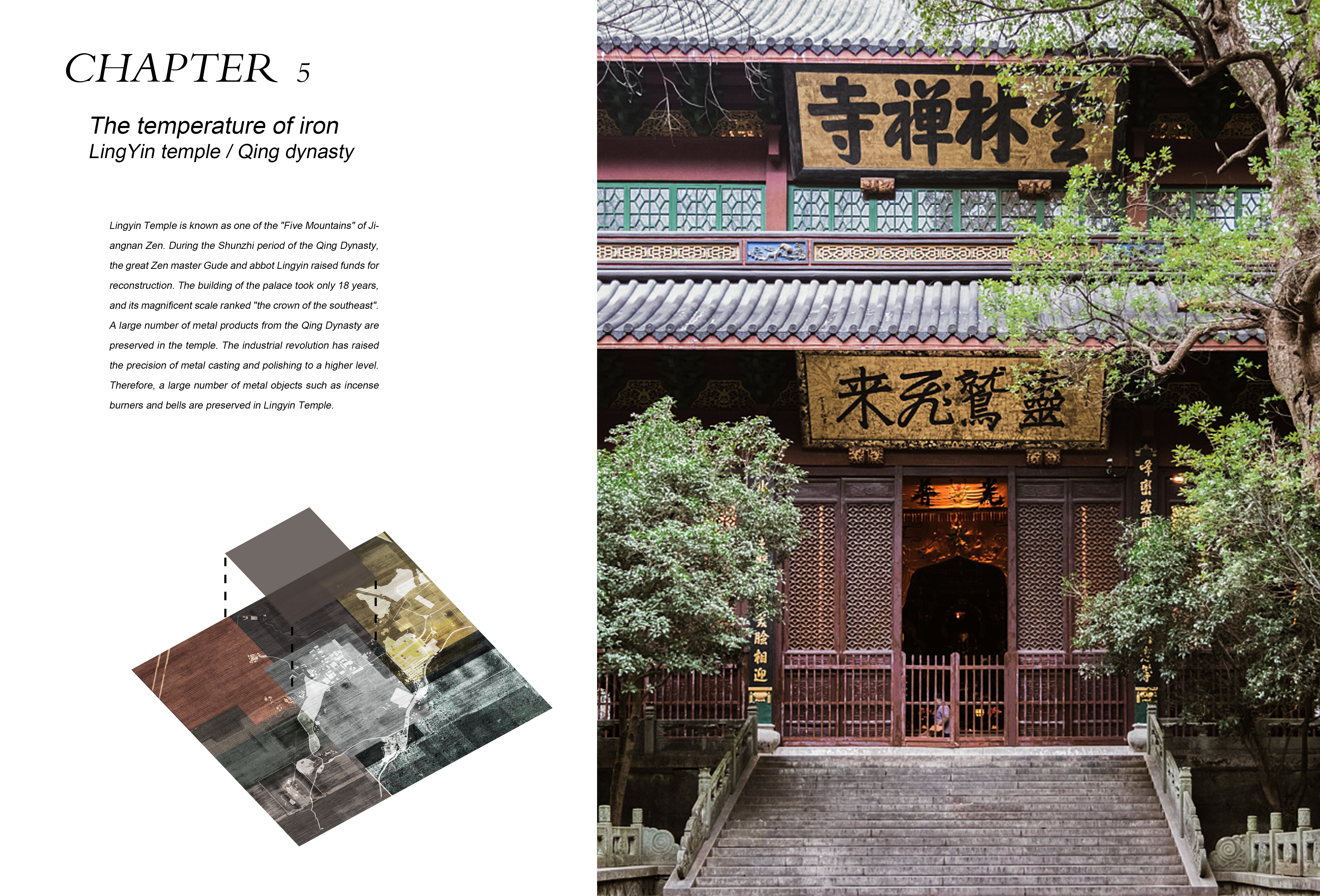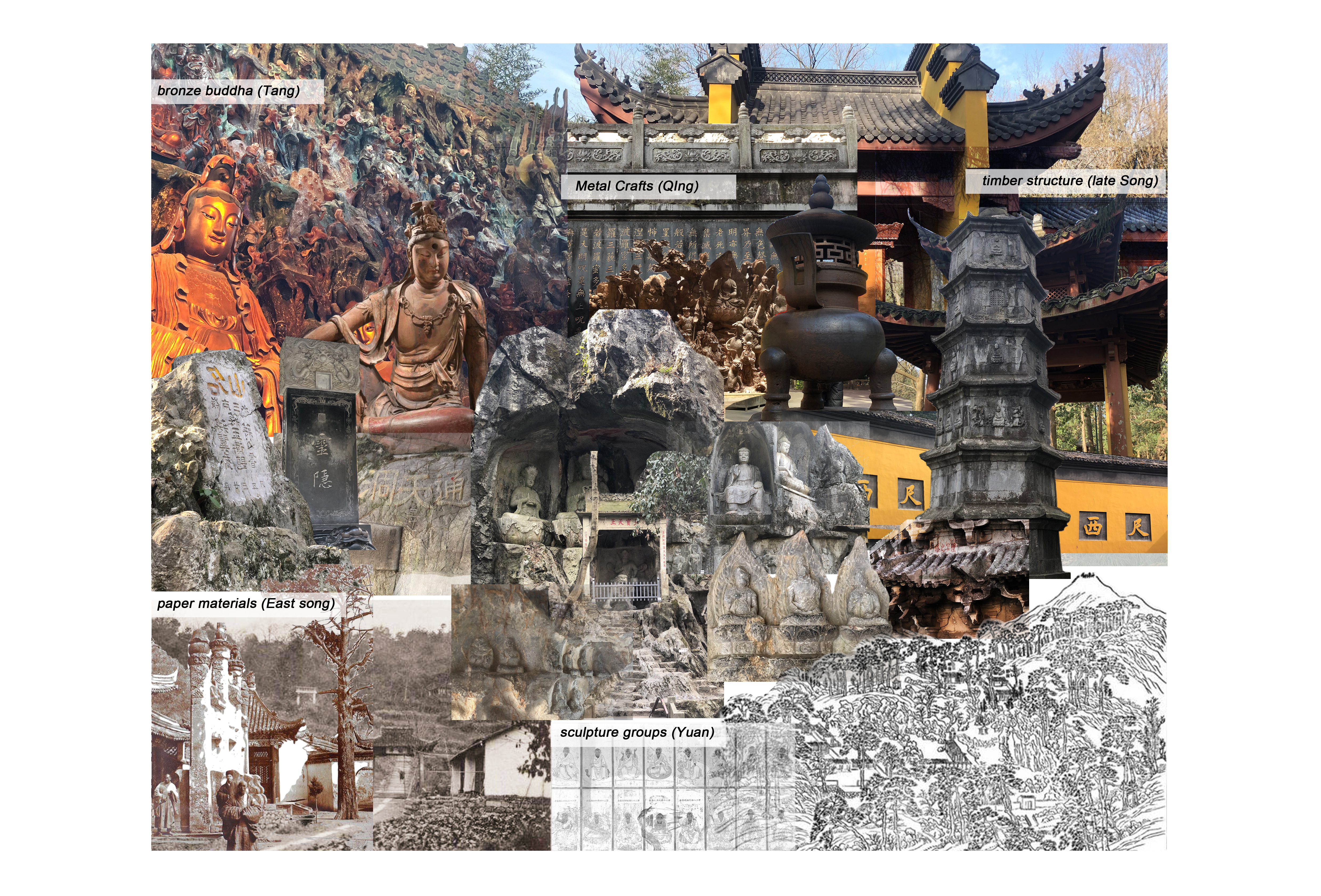 In the past two decades, Chinese cities suffered rapid development with urban areas rapidly changing causing a rupture in culture and urban memory. In the city of Hangzhou, the impact of such developments is very palpable, making it a perfect ground for this experience. However, in a mountain nearby, with ancient temples and statues of different dynasties scattered in its vicinity, there exists a continuous register of history. Every time a new dynasty is created, a new temple is built to show the ruler's authority without the destruction of the previous temples. Even though the temples are going through their own renovations, history is preserved. It is because of the particularity of religious buildings that there are various temples from different periods that exist on this mountain.