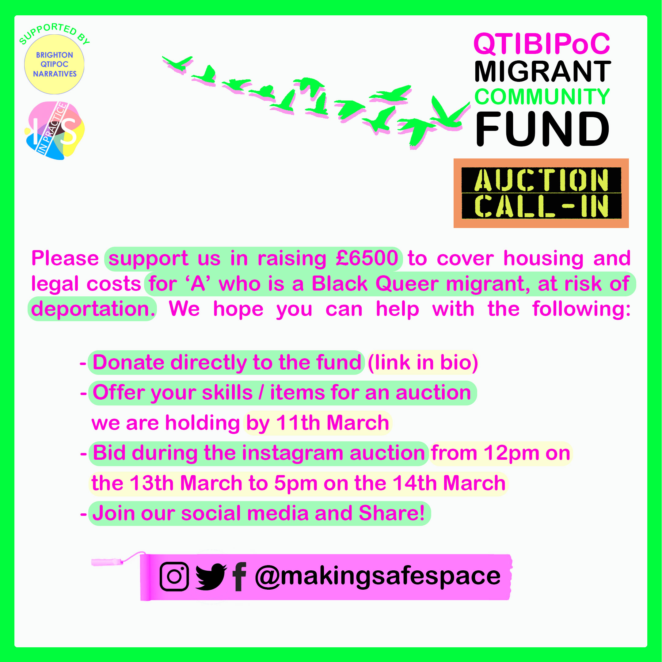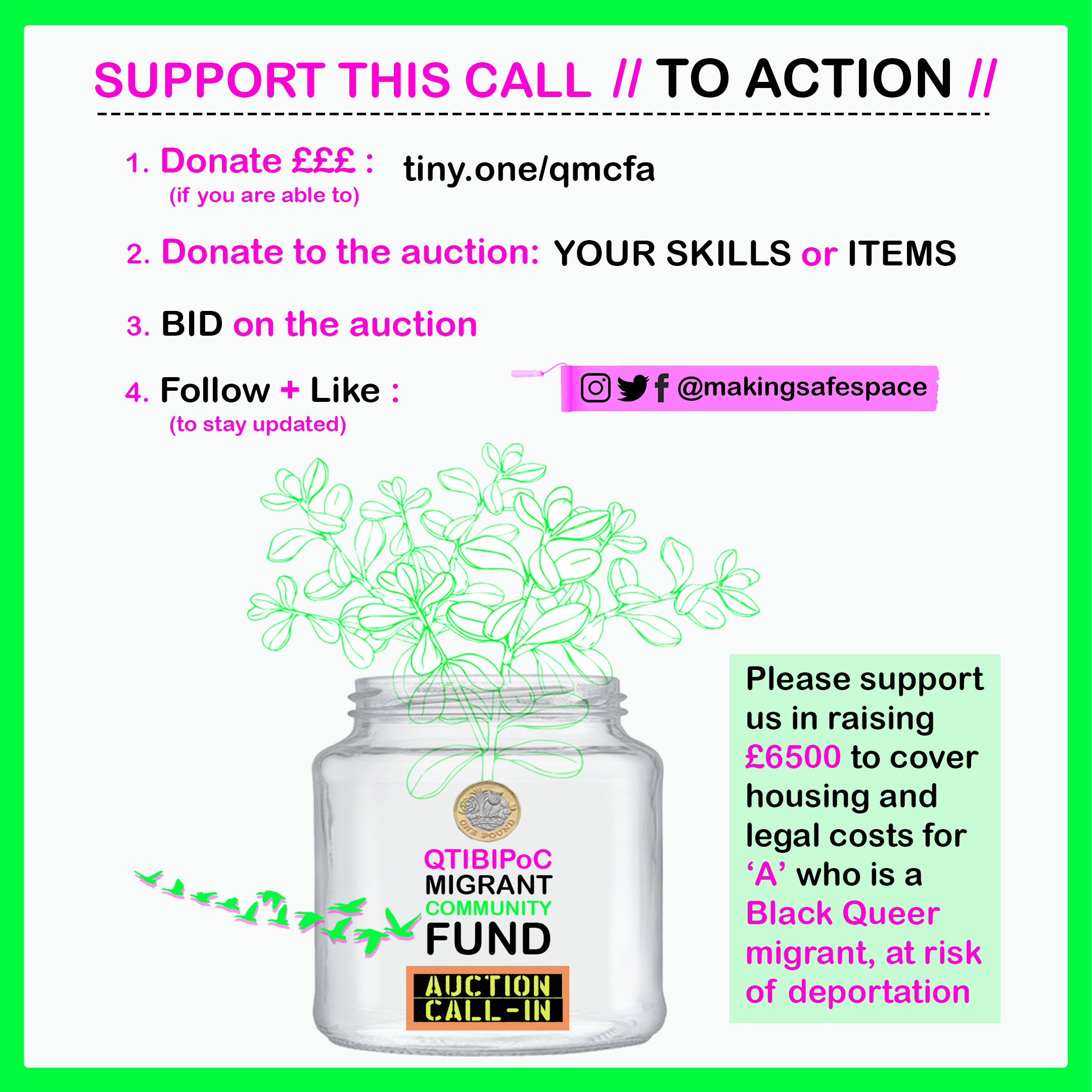 My project documents an alternative to governmental funding bids, inspired by the Susu community saving plans mobilised by the Windrush generation, when banks would not welcome them. I recorded the journey of holding a fundraiser auction with the support of a number of grassroots bottom-up community groups, with the goal of raising funds to support the legal costs of asylum for a black queer migrant. This acts as a community building incubator project, that consciously bypasses the tokenistic idea of charity by utilising interchangeable mutual aid based on a radical queer anarchist structure versus a liberal structure, with the hope of future fundraisers from this video. My strategy for compiling is composed of the recording of the fundraiser auction process as a how-to DIY video, through archiving community engagement to the fundraiser via four online social media platforms (due to COVID-19 – restrictions: Instagram, Twitter, Facebook and email) in response to call-in media posts.