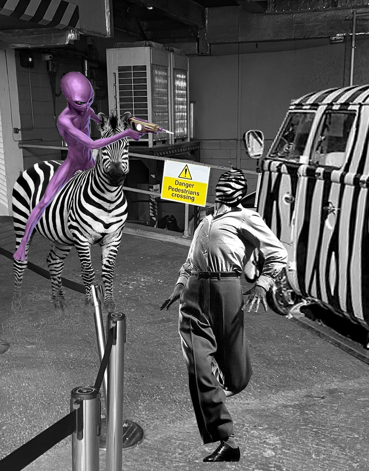 This project uses a similar creative process to the memes system, which involves appropriation, creation, re-editing and ownership, and a narrative based on a completely different context to the original images. I photographed some warning signs on various streets in London, using them as a backdrop for the images and as a venue for the story. I have tried to create more unusual and funny stories based on the text on the signs, including imagining future forms of biological existence and social relations, the satire of certain social phenomena, and some spoofs which just mean to produce waste. All the collage materials, except for the background photos, are taken from the internet.