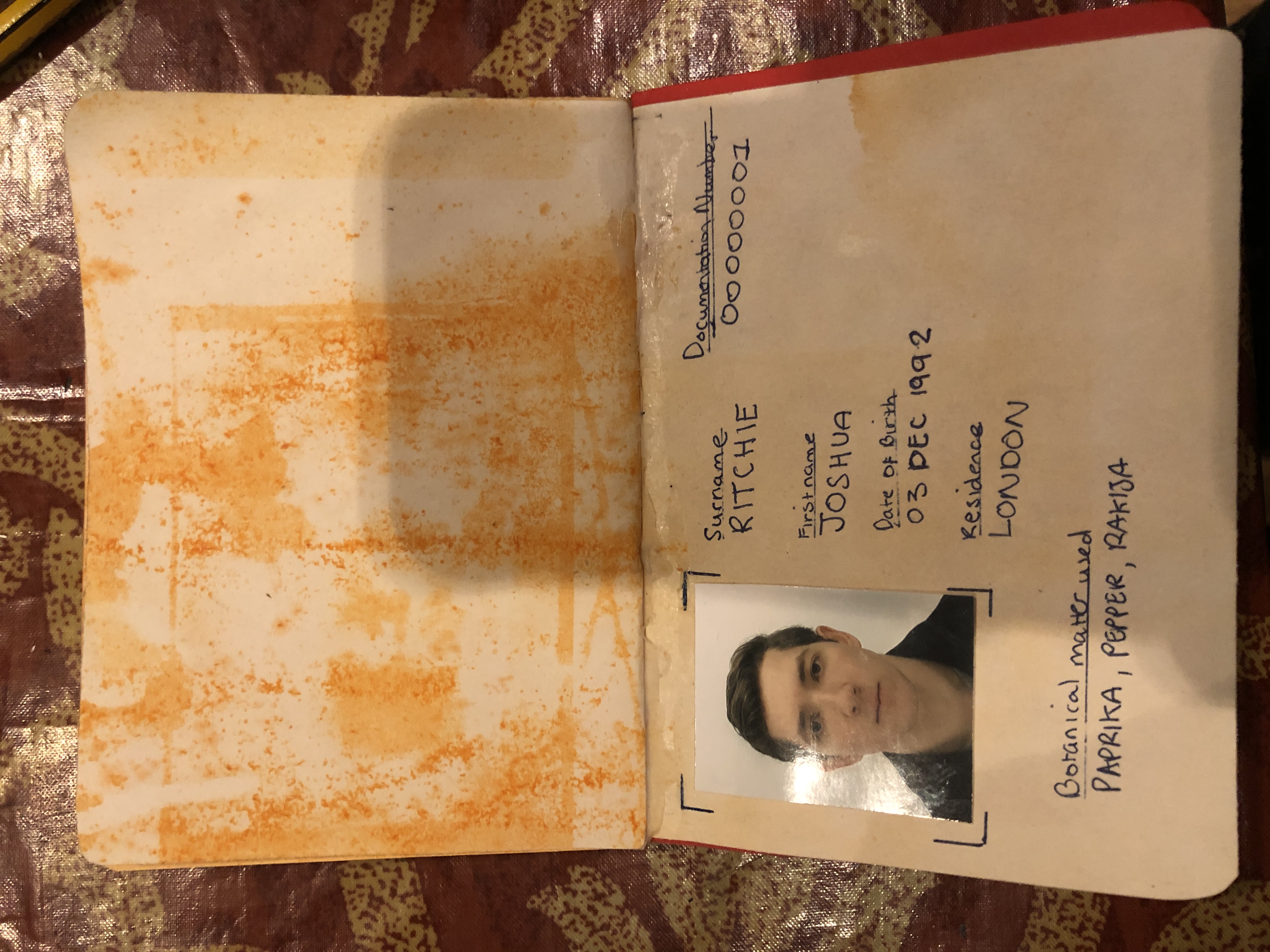 By creating a step-by-step, downloadable āmake your own passport kitā (available via a project website), individuals can use botanical matter associated with their cultural identity to create a living documentation intrinsically connected and intertwined with that living space. The first stage of The Elemental Citizen Project, explores my own mixed heritage to create a āpassportā that explores my Serbian roots and cultural associations. I use an anthotype photographic printing process that combines blended paprika, red pepper and homemade rakija to produce a light-sensitive emulsion. I then expose a passport-like photograph of family members onto the prepared paper. Some of the botanical materials used to make the light-sensitive solution were from my motherās garden, thus linking points of identity for me with my London home. The project forms a living documentation as a performative act of self-identification and determinism.