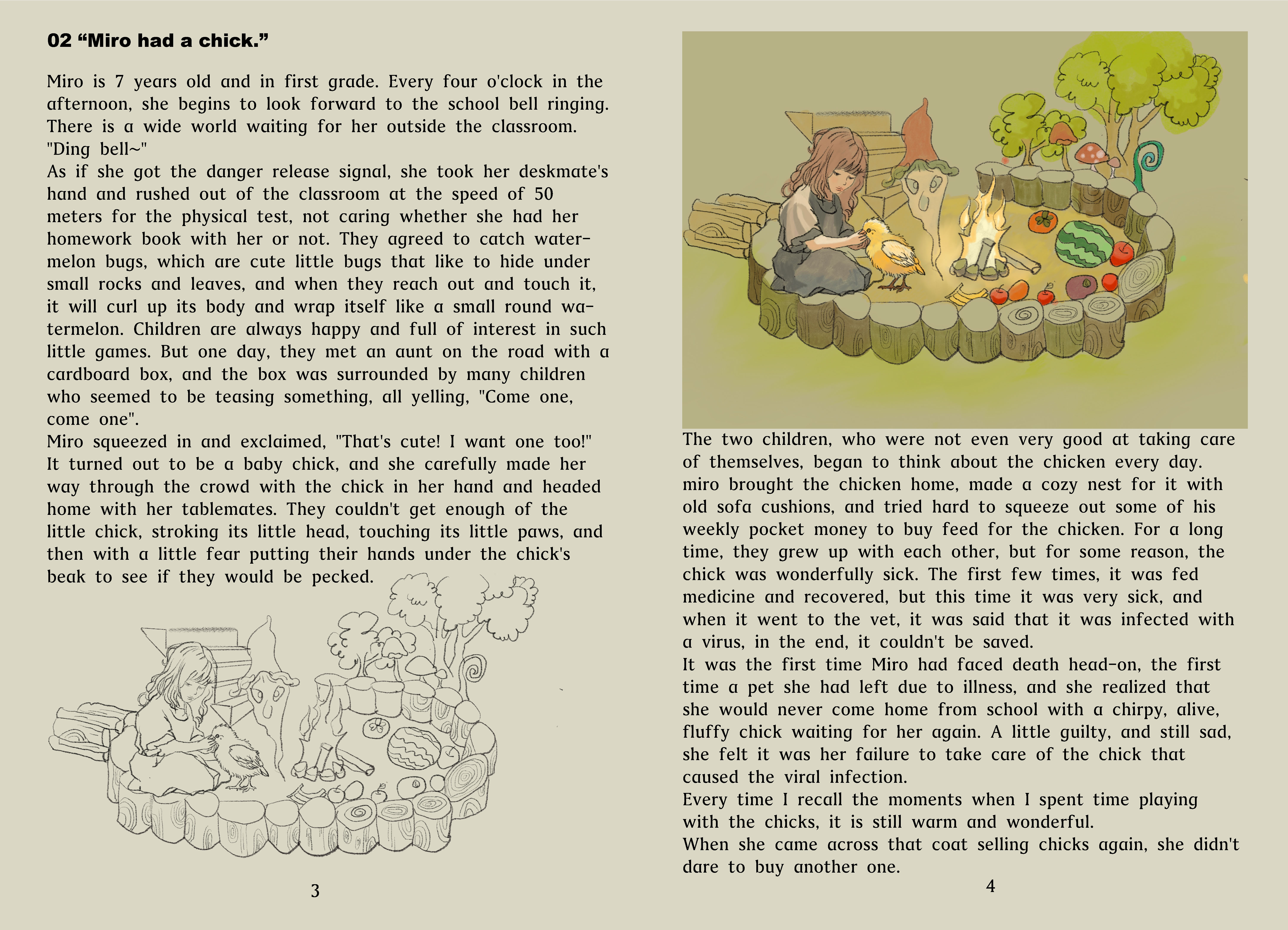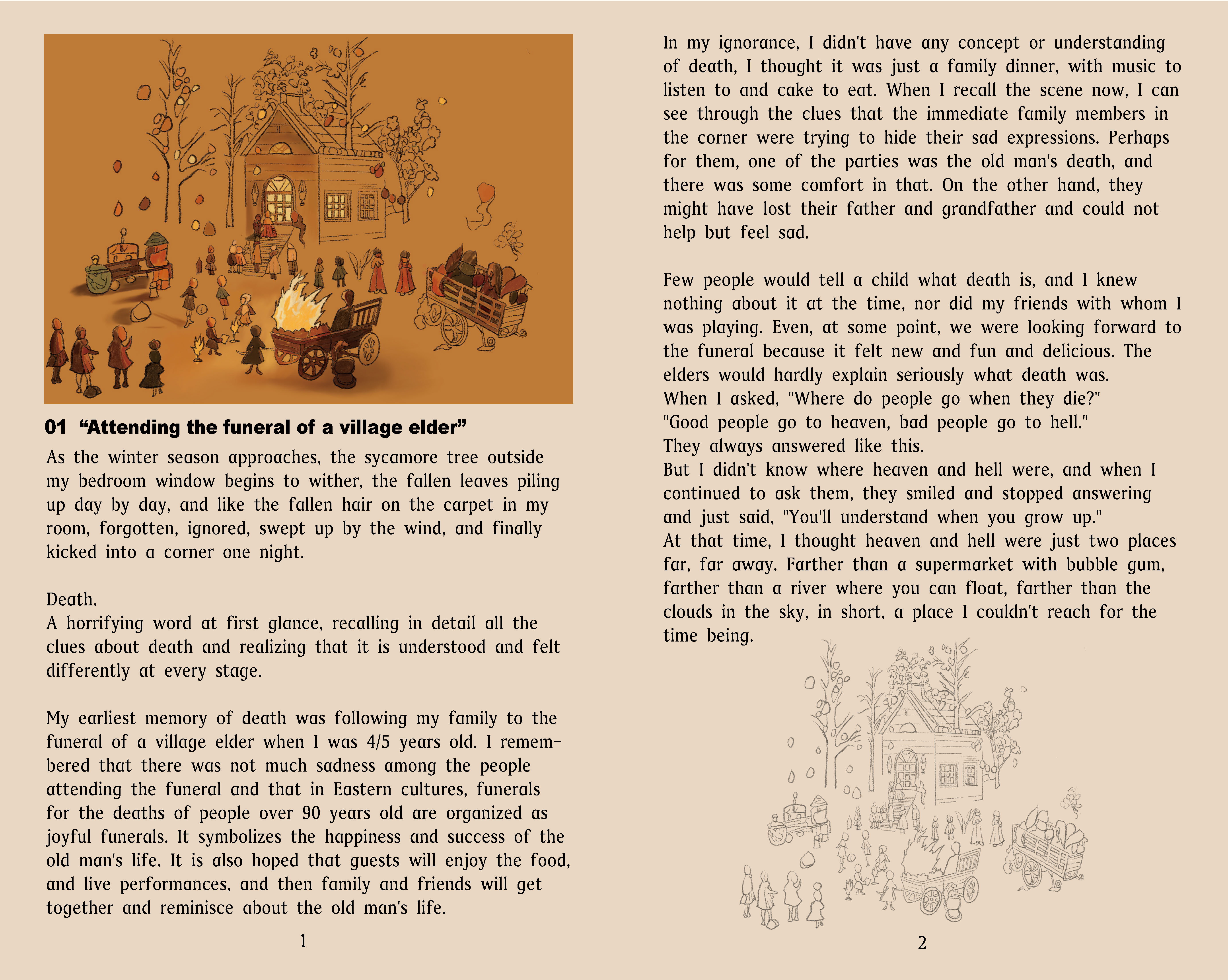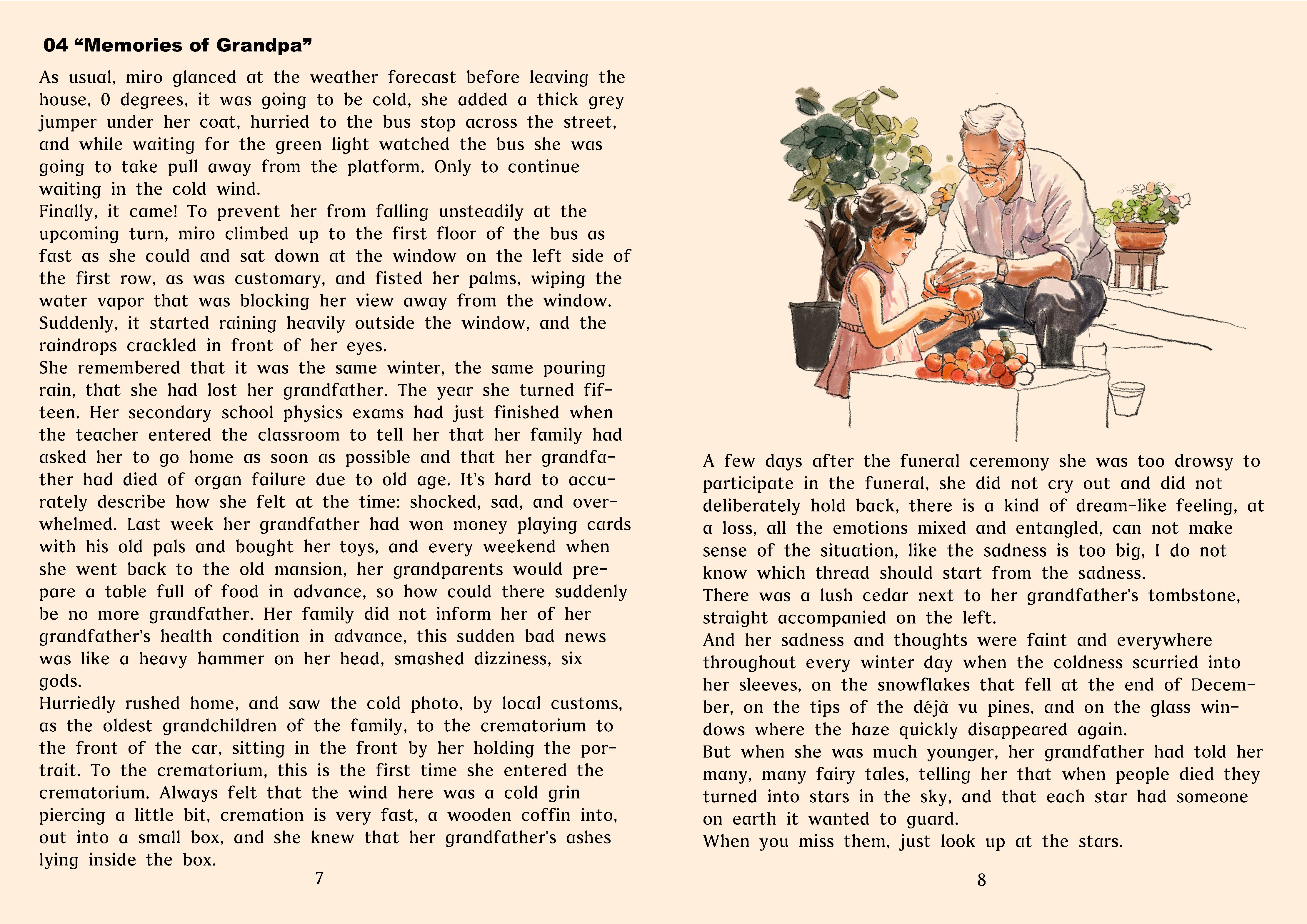 Using my hand-drawn illustrations to complement the emotional depth of the text, capturing the sadness and beauty of memories. Using subdued colours in poignant moments to symbolise the strength and guidance memories bring in vibrant tones.