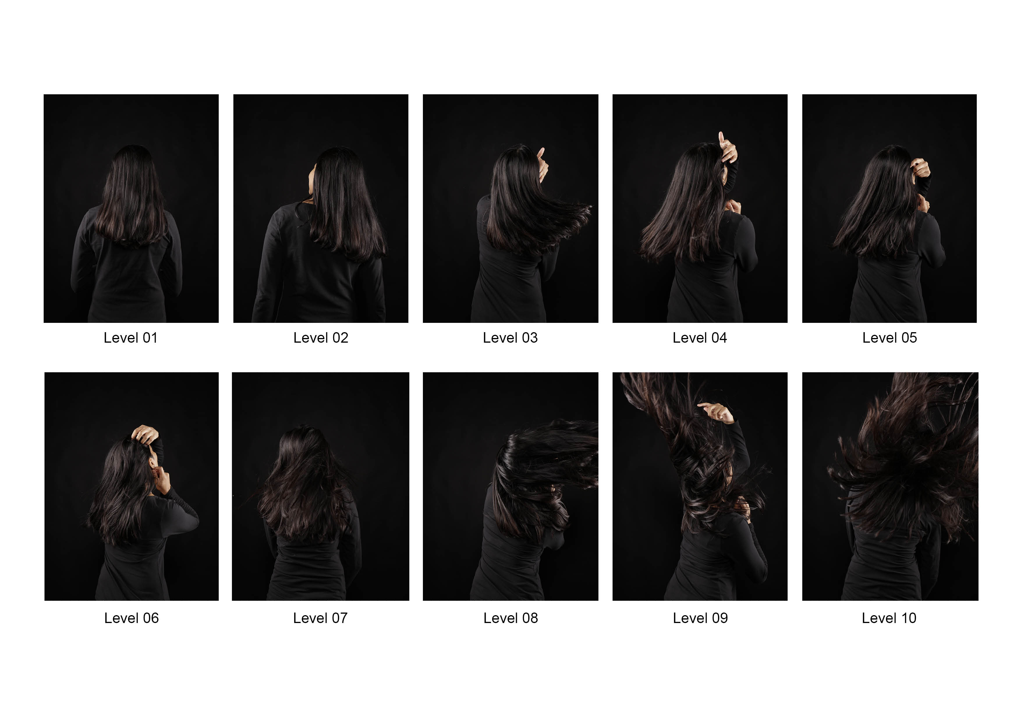 The approach centres on visual communication, emphasising the power of visual language while challenging stereotypes about Deafness and highlighting the capabilities of the Deaf community. The movement of the ritual object, a cochlear implant, is represented through breakdown words like glide - slash, wrench - twist and flip - swift, taken from movement theory, capturing these at an intensity range from 0 to 10. These movements, documented through high-quality photography experiments, contribute to a conceptual framework inspired by Eadweard Muybridge's work and intend to reshape perceptions.