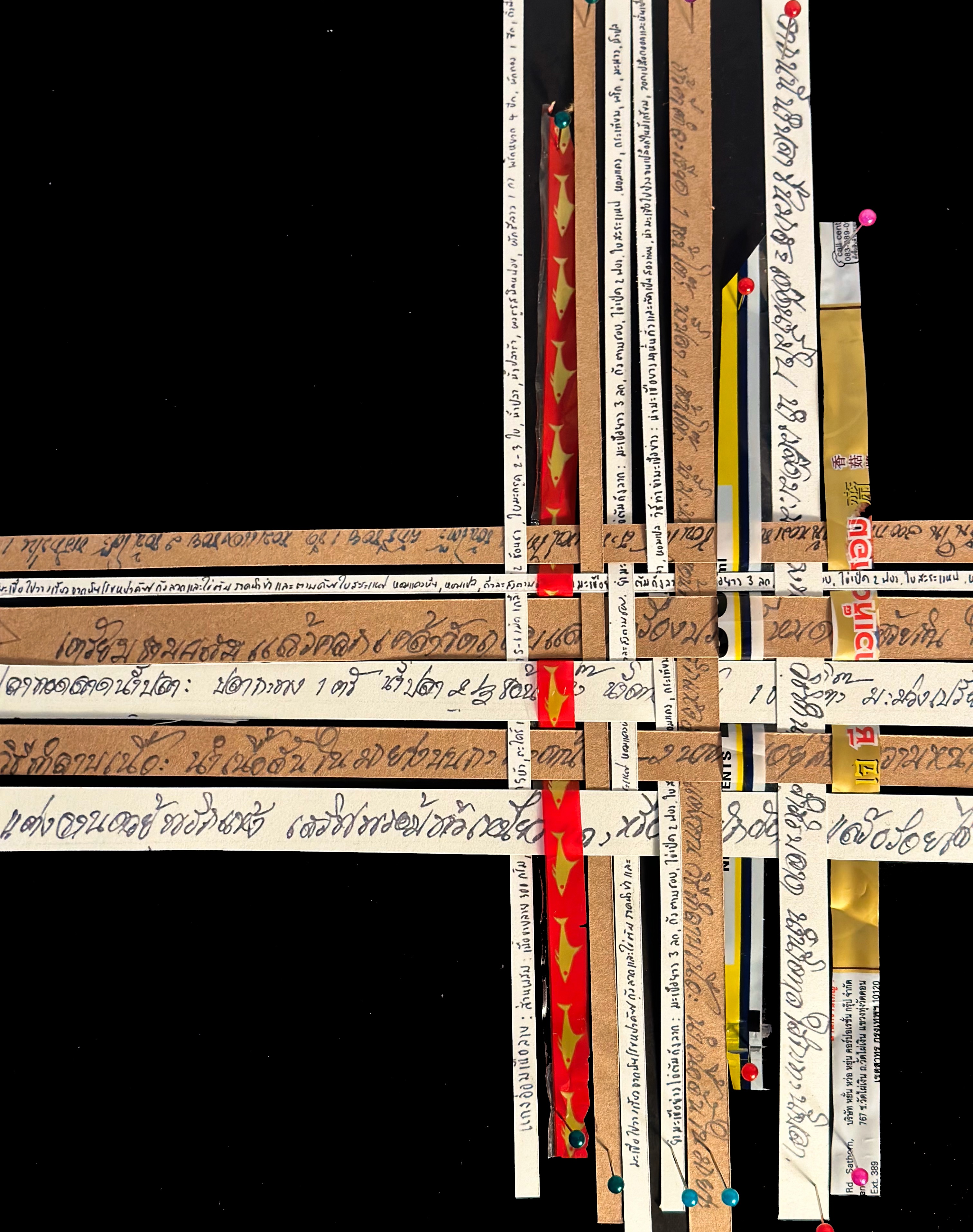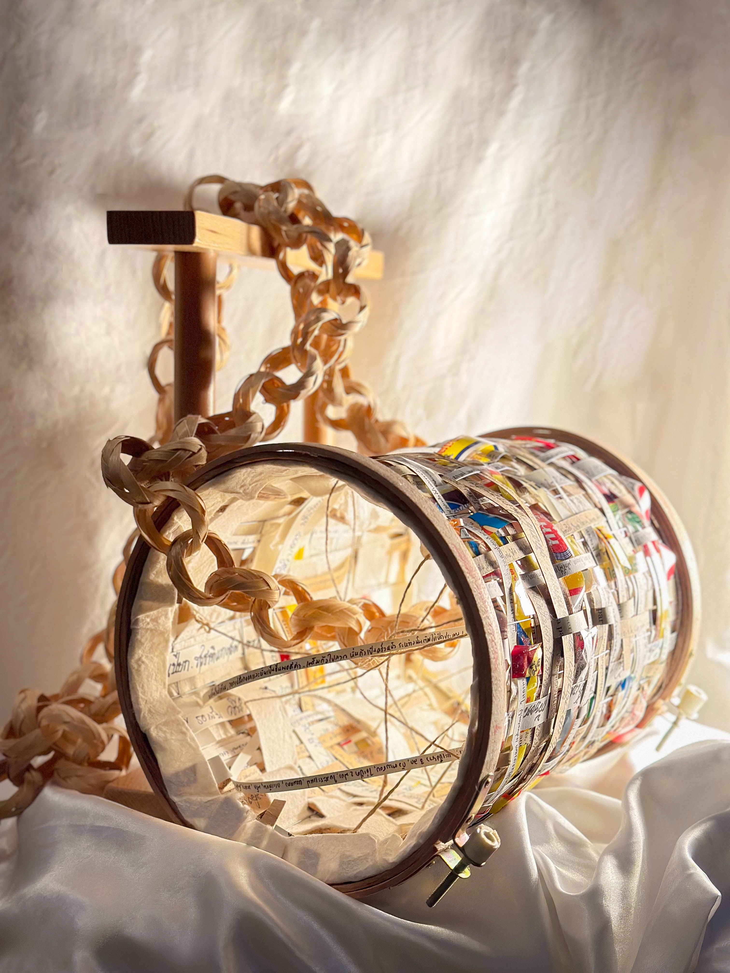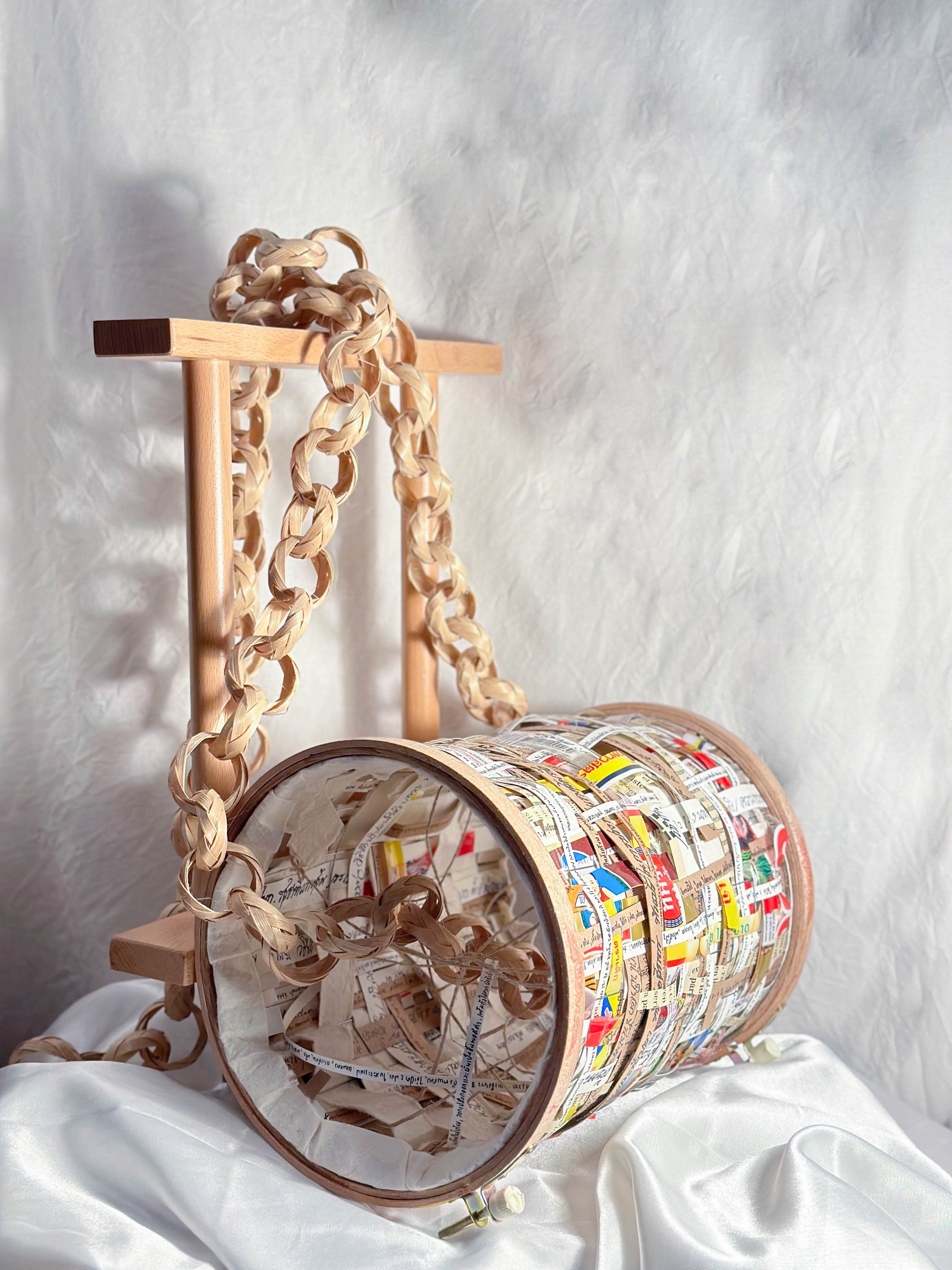 A bag that encapsulates not just physical objects but a symphony of memories. This object Woven from paper containing my mother's recipes and familiar ingredients, becomes a tangible bridge to nostalgia - meaning I can carry a piece of home with me wherever I go, wrapped in the threads of cherished flavours and shared moments. This project uses the technique of weaving to recreate home as an object. It encapsulates and brings together things that are hard to explain such as food - the language of love in tastes and smells, connecting families and communities. The things we cook, the recipes passed down, and the special flavours that make our homes unique—all come together to shape who I am. The act of weaving itself is a beautiful metaphor for bringing disparate the woven texture of the bag mirroring the intricate layers of my experiences with food. The act of weaving itself is an element together, just like a bag unites various aspects of my culinary identity. It's a tactile and visual representation of the rich tapestry that represents my relationship with food and home. Each random pattern tightens with time and memory, making it a sensory journey that transports me straight back to the warmth, comfort, and belonging of home.