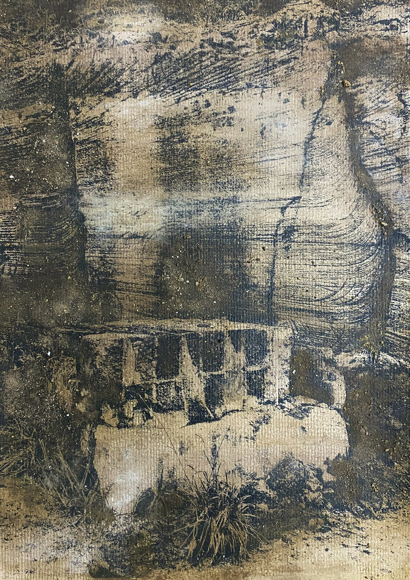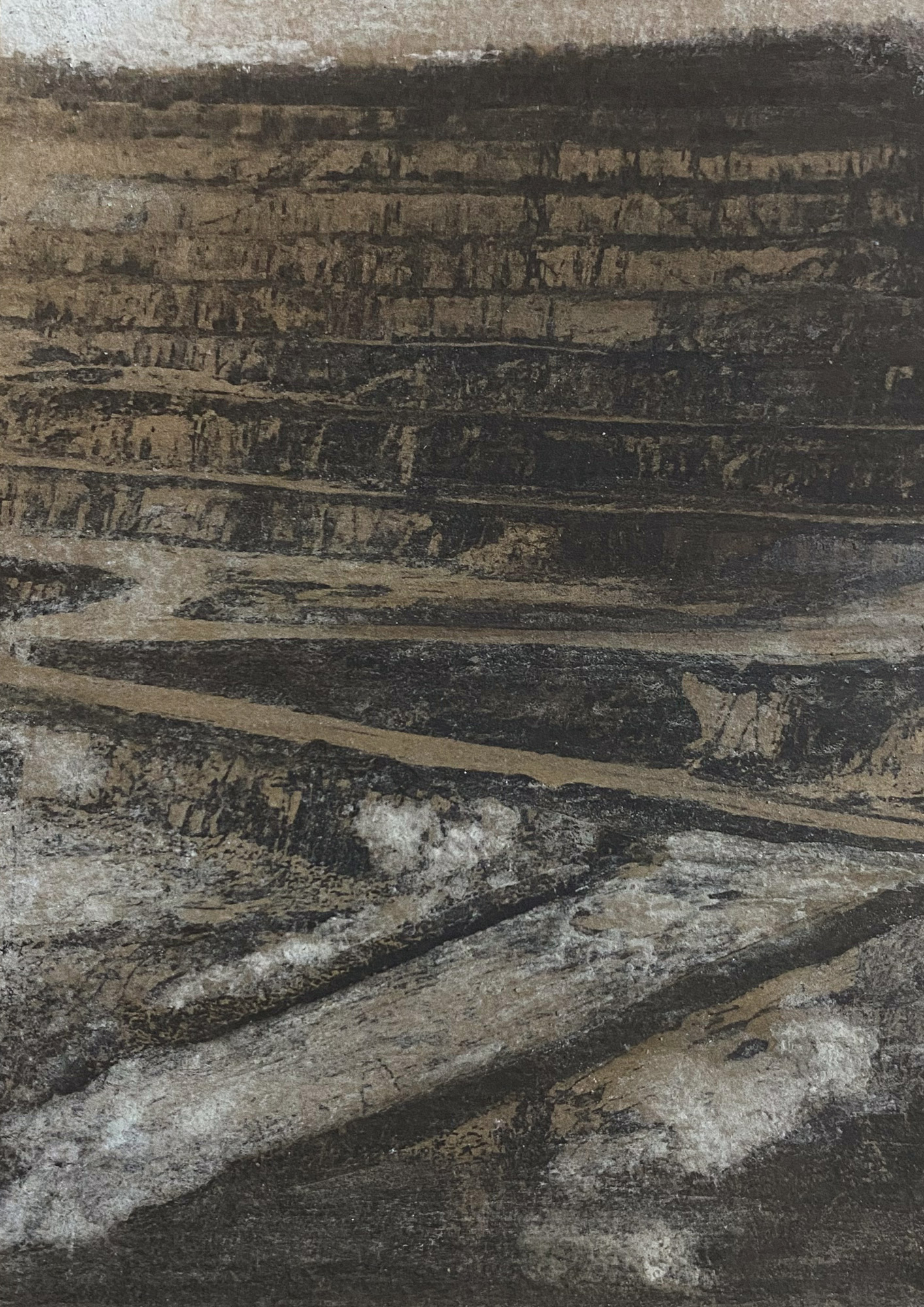 By employing photography as a dynamic, time-based medium, the project investigated limestone quarrying in the Mendip Hills area, using the site as a living laboratory for my study. Layers of stone serve as a record of past events, containing clues about the environmental conditions, climate variations, and even industrial activities that occurred during different periods. The stone dust and sludge collected from my field visit have been used as a pigment in an alternative process to the traditional gum-bichromate printing method for photographic printmaking. The photo series produced exhibits the various marks embedded on the surface of the stone beds from the extraction processes. These images emerge as a vehicle to imagine the traces of the anthropogenic in the deep geological time.