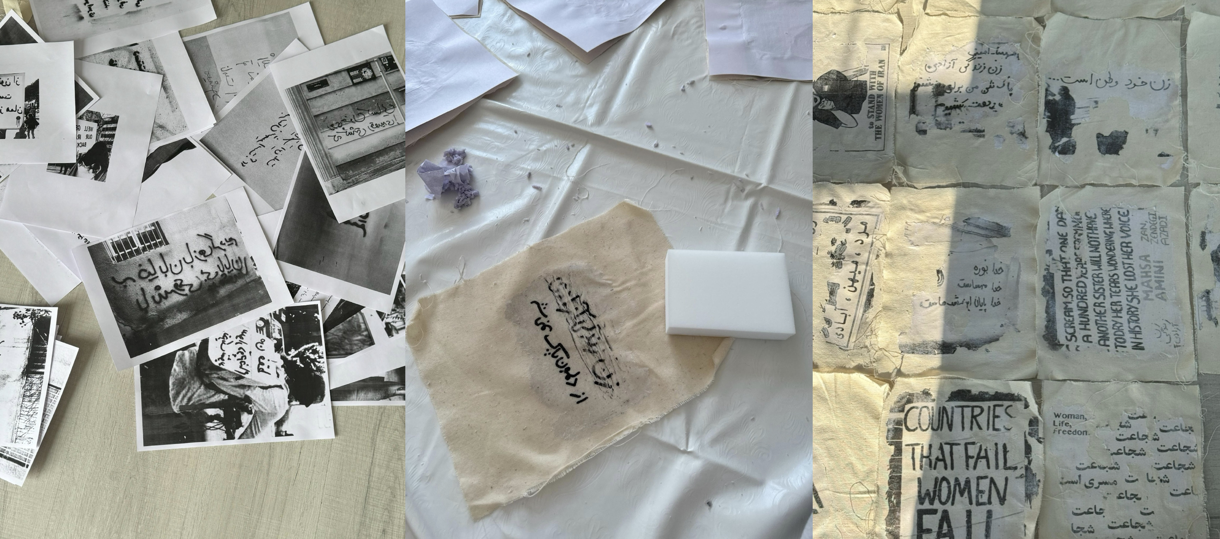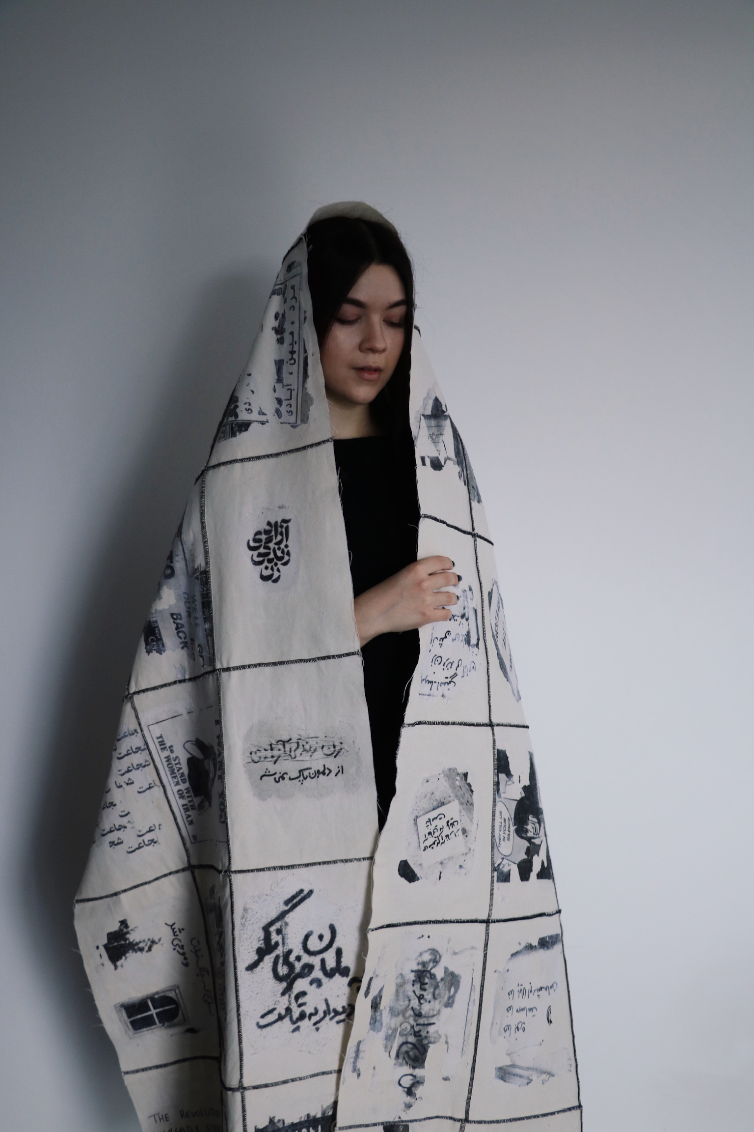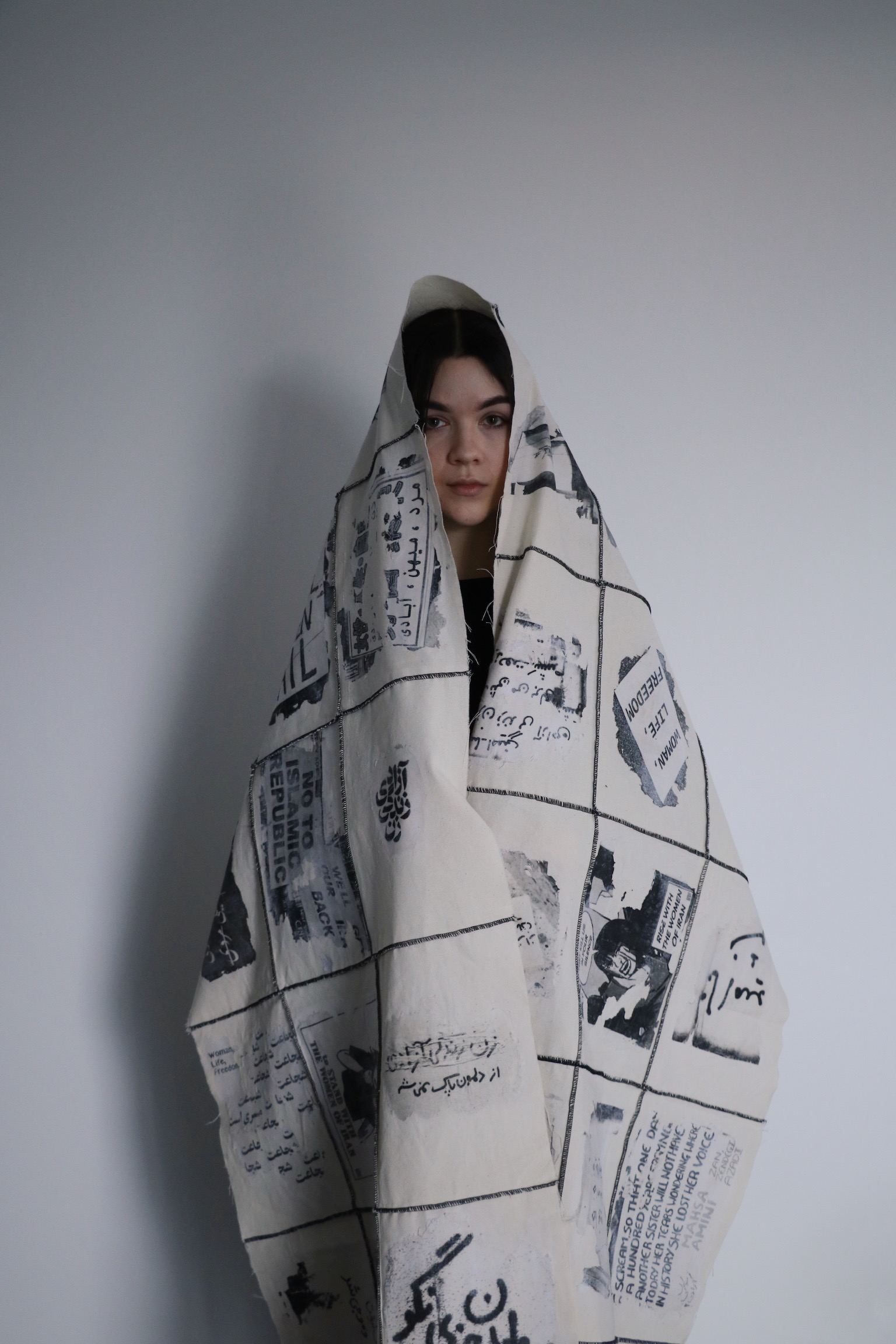 The work âIranian Shaalâ sources images from banners and phrases displayed on walls and streets during the protests in Iran in order to form a âShaal' that instigates a discussion regarding the ongoing struggles of Iranian people. The decision to capture images in London, rather than in Iran, speaks to the risks involved and the essence of my work. If these images were seen in Iran, it could lead to arrest. This careful choice highlights how sensitive the project is and the difficulties in freely expressing disagreement or criticism. It also points to the challenges in dealing with the important issues that this project is focused on. The collated images underwent a meticulous process involving printing onto paper and subsequent transfer onto A4 calico fabric through the application of the gel medium image transfer technique. Subsequently, employing machine stitching, 33 distinct fabric pieces were intricately affixed to one another, culminating in the formation of a Shaal, or scarf. These images are stitched together and have multilingual captions in both Farsi and English.