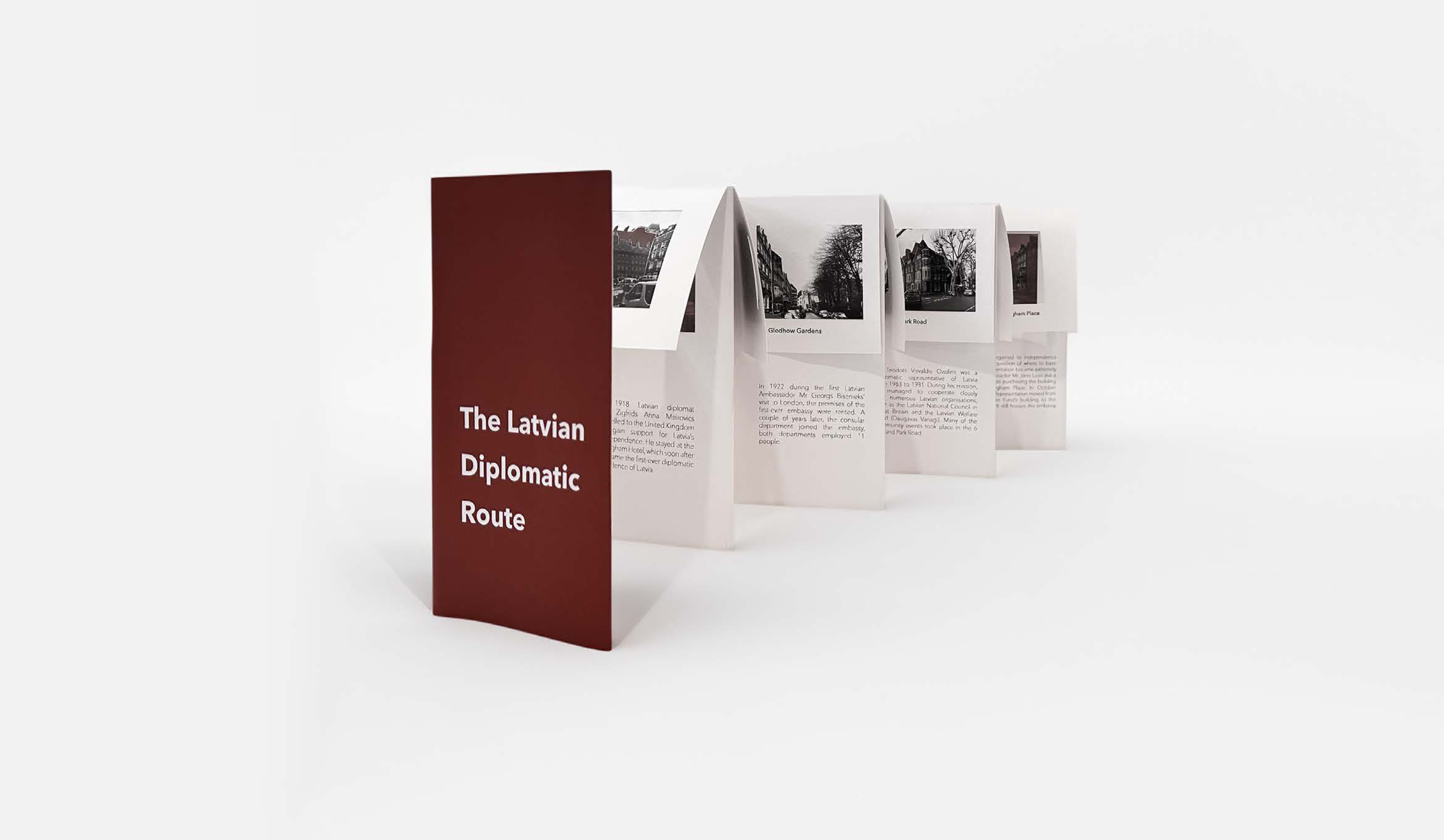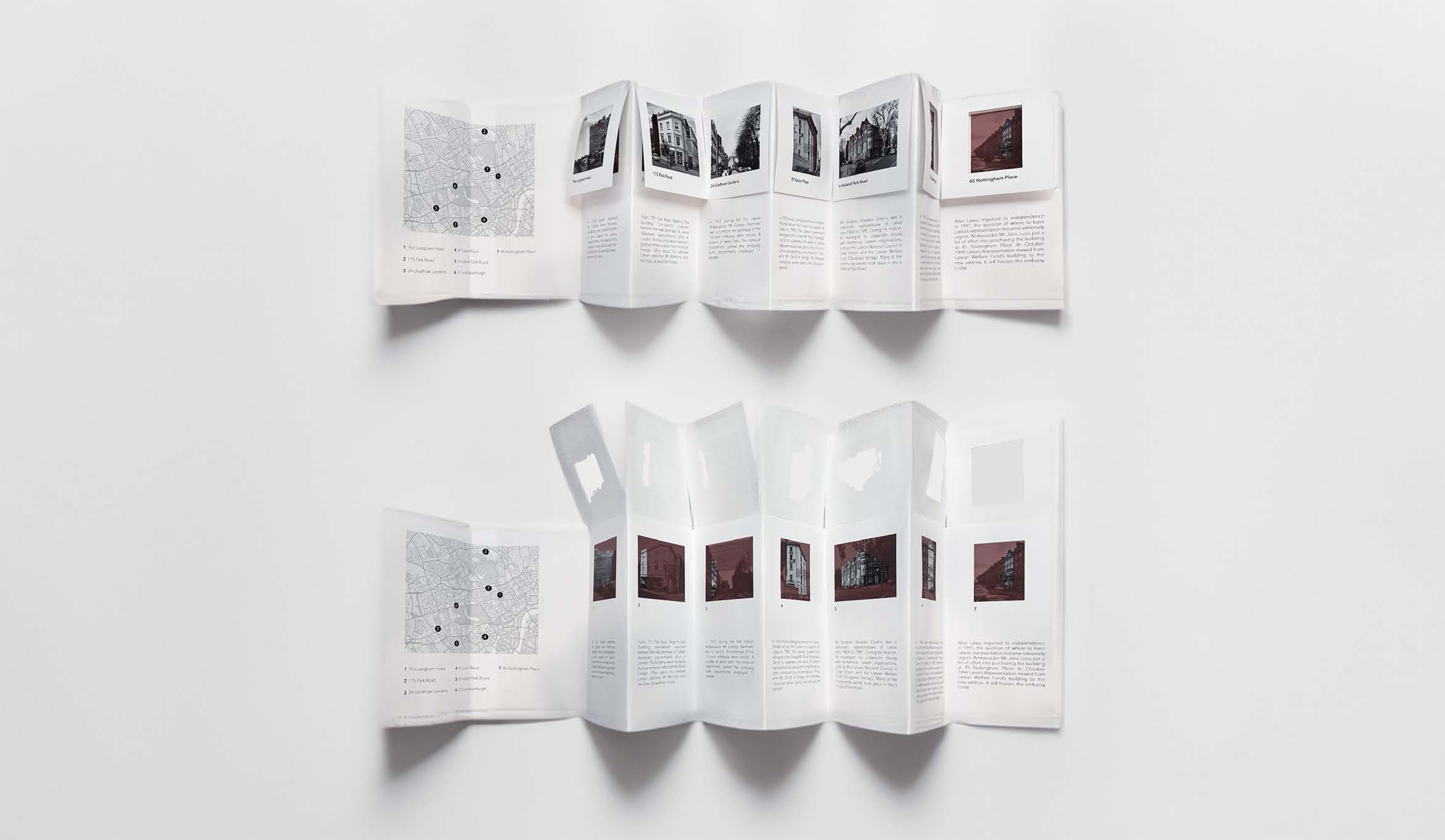This project aims to explore the significance of various addresses around London that have played a role in the making and preservation of the independent state of Latvia, tracing back to 1918 and the first ever diplomatic residence abroad all the way to the building that housed an embassy of Latvia during the 46-year-long occupation of the USSR. To execute the project, archival images of the significant addresses have been used. To activate the importance of each address, images have been re-photographed and traced over, thus acknowledging elements in the urban fabric of London that embody a history of great importance to Latvia but are generally unknown by a daily passerby. Sets of images have been placed in a chronologically curated catalogue with an additional map and a route locating the addresses, encouraging the reader to take a physical walk through the route of independence.