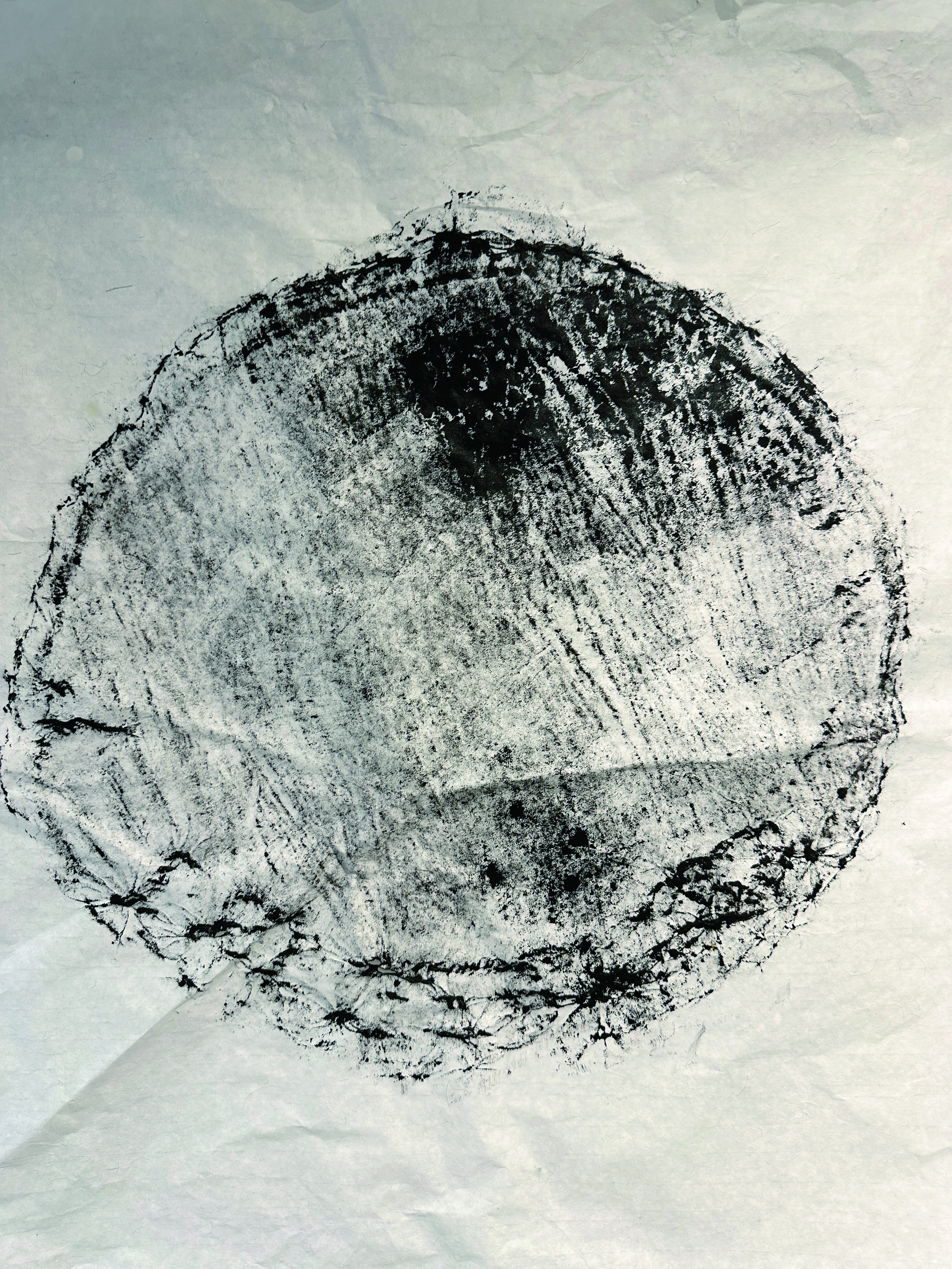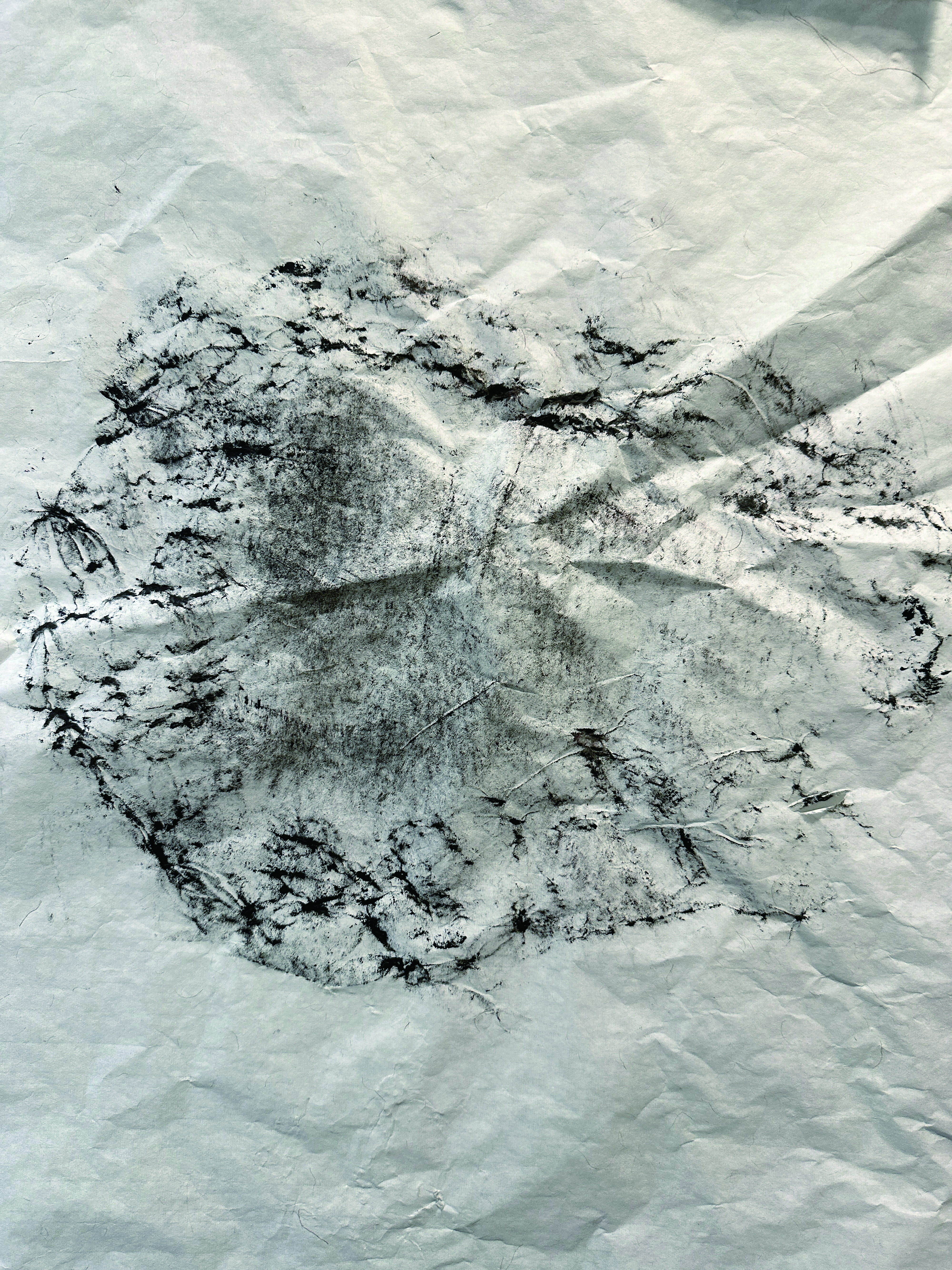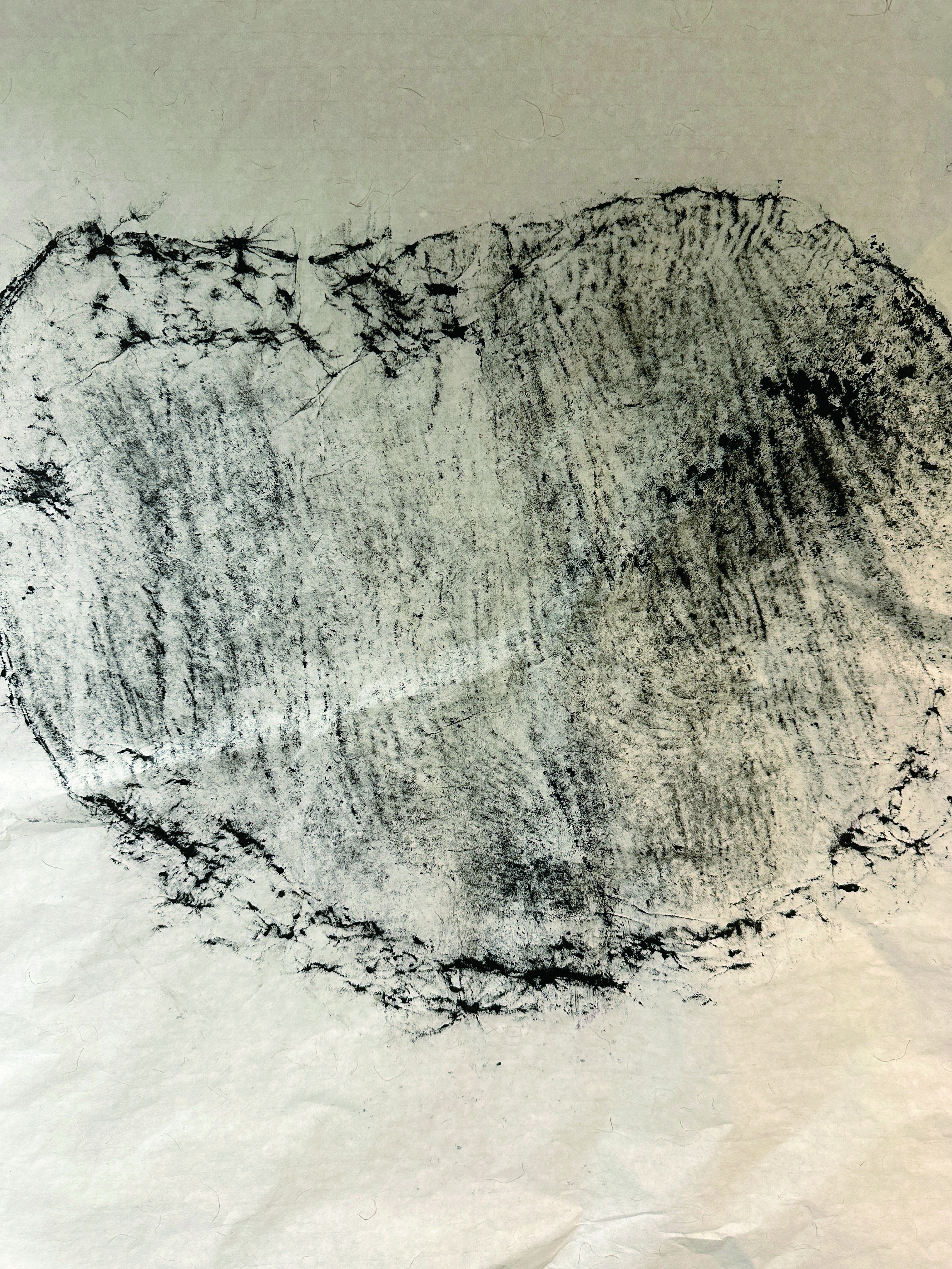 By documenting the texture and rings of the trees, the environmental information held within each tee ring was encoded within the print. Each ring, like a data track, carries the story of years past. The tree ring rubbings are also disturbed by the harsh texture of the electric saw cuts, that are traditionally used to cut trees down. This demonstrates the loss of environmental knowledge and history through the continued removal of trees from this ancient forest. The prints form a more-than-human archive of collective memory: between root, lichen, fungi, chainsaw, pollutants, bacteria and forest. In this way, Silent Trees records and responds to the silent, yet critical, dialogue between humanity and nature, highlighting the urgency of environmental stewardship. The prints, with their detailed portrayal of tree rings, are designed to draw the viewer into a deeper contemplation of time, growth, and loss.