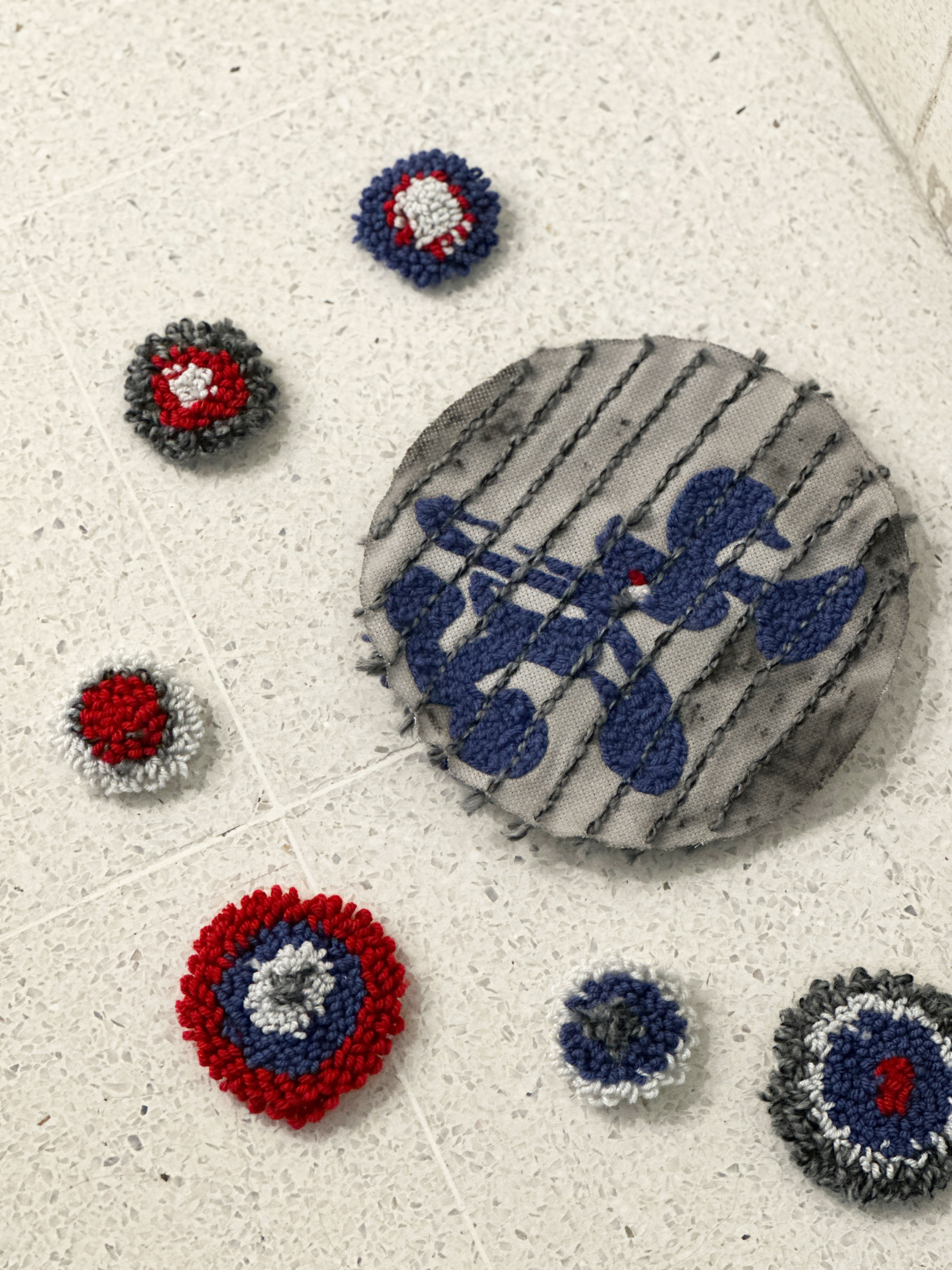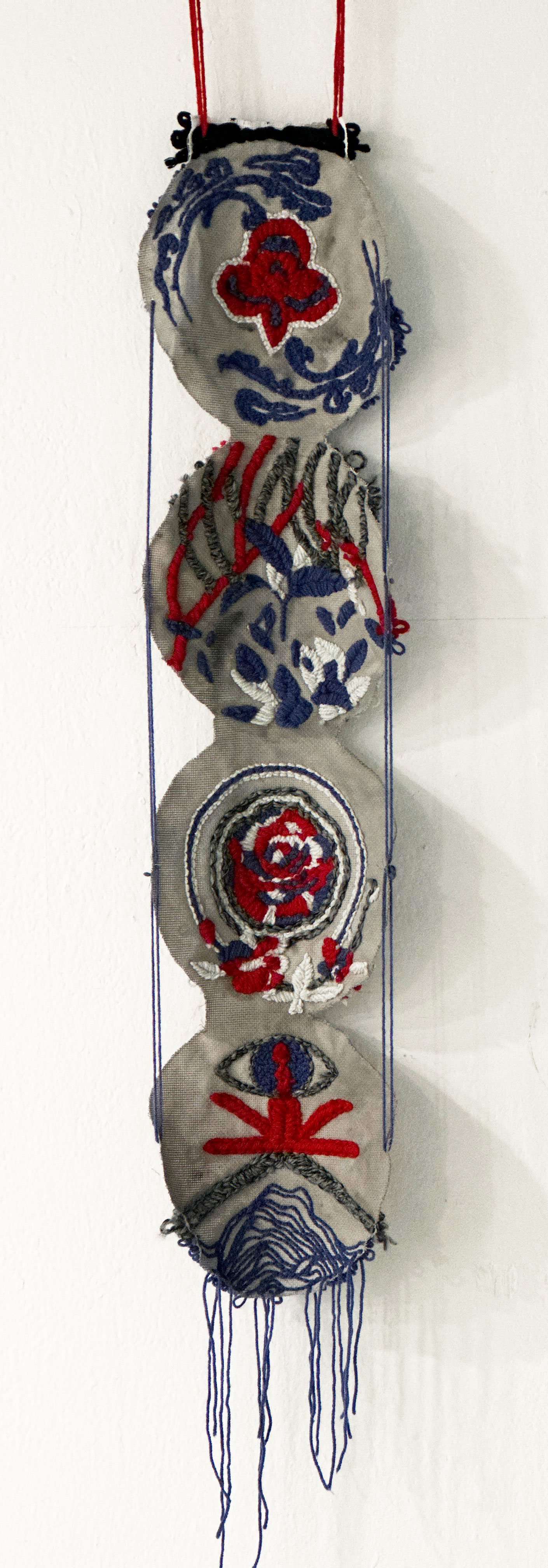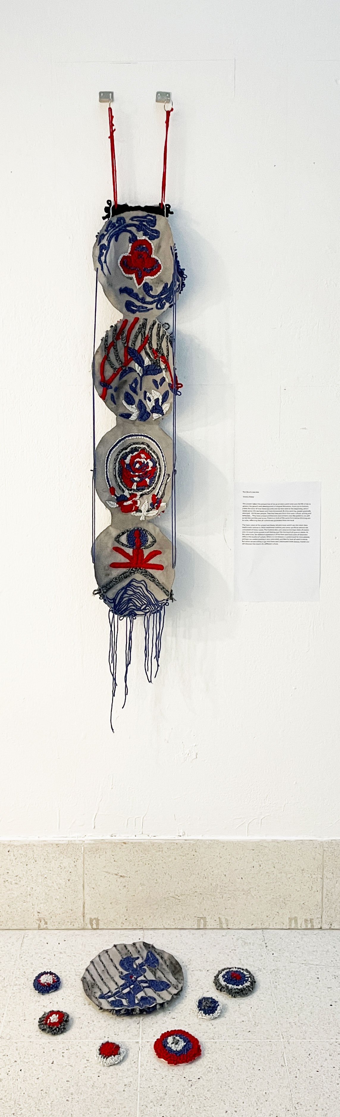 The Life of a Tea Tree explores the the cultural heritage of Jingmai Mountain from the perspective of the local tea tree. The installation reads from top to bottom and tells the story of a seed growing into a tree. As time passed and trees grew, the Blang community gradually emerged. The community inhabits Jingmai Mountain and champion their own culture and dialect. The embroidered artwork references eye-like patterns and symbols found in Blang tradition, as well as spirituality and rituals orientating around the scared tea tree. The circular forms placed on the ground allude to the fact that culture is generated from stories of the land.