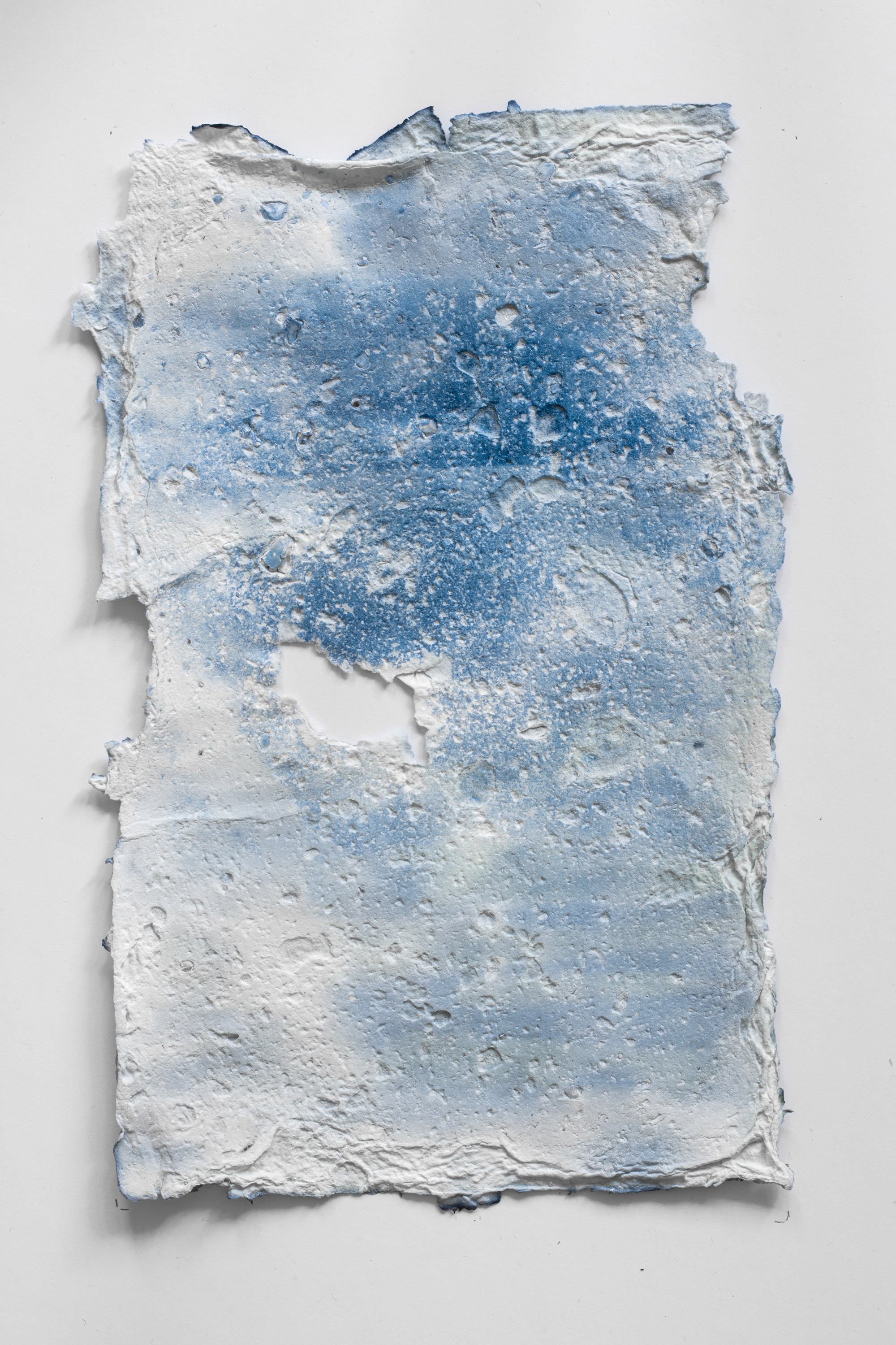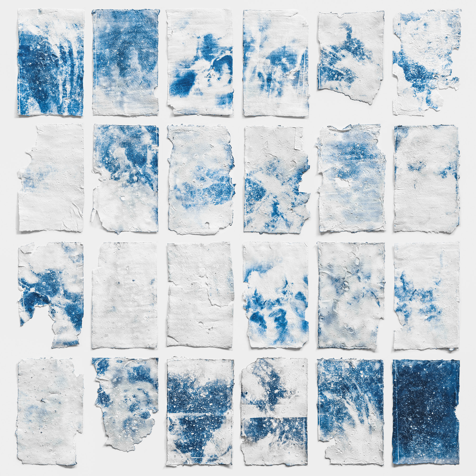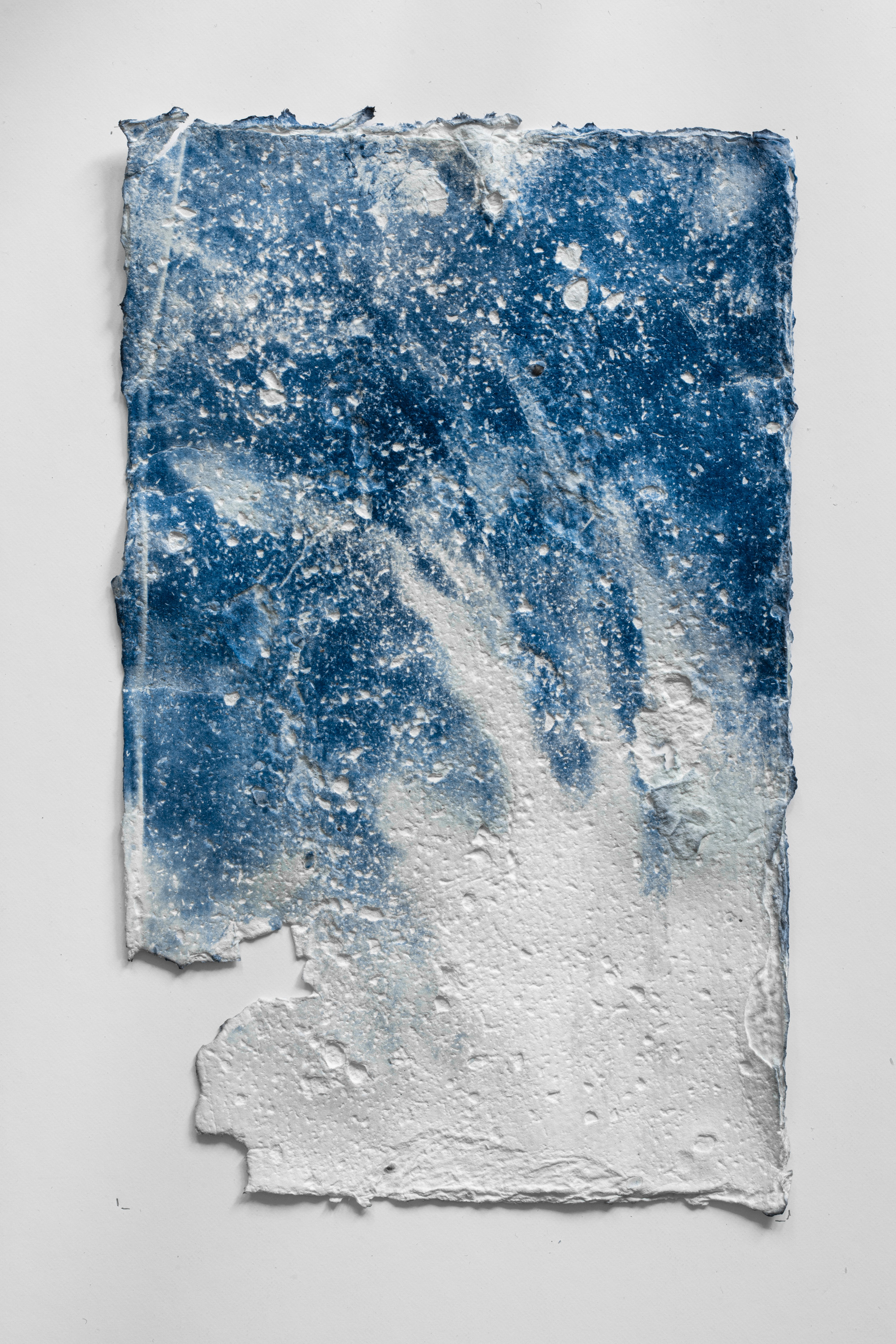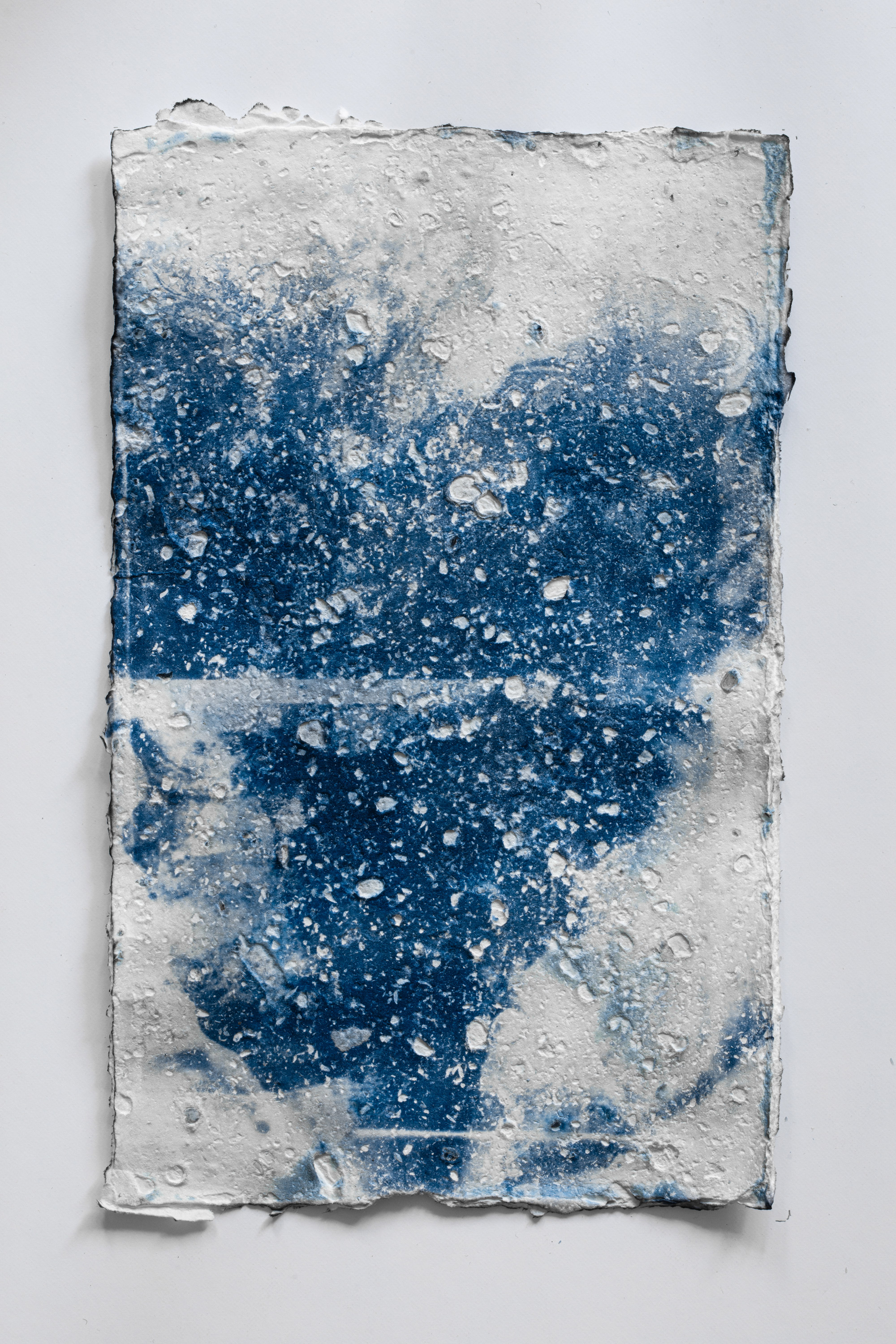 Oysters absorb and extract the pollutants found in their habitat, encasing these minerals in their shells. In this way, oysters record the quality of the water and any environmental events that have occurred. I have developed a series of unique cyanotype prints exposing oysters from the Carrick Roads onto sheets of handmade paper. I produced the prints by suspending the ground-down oyster shells in the pulp; in this way, the minerals extracted from the polluted waters are reintroduced before being brushed with the extracted iron solution required to make the cyanotype solution.