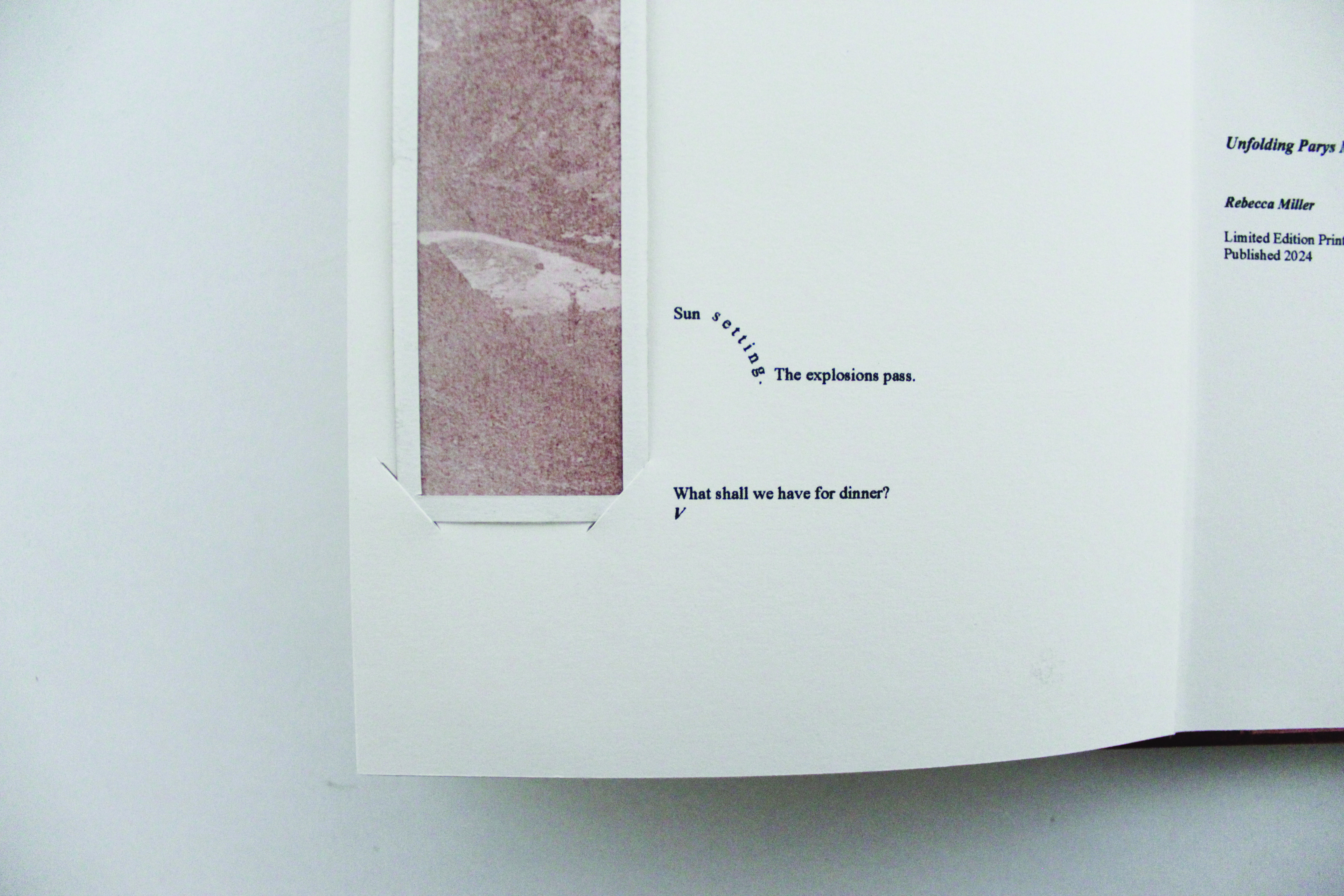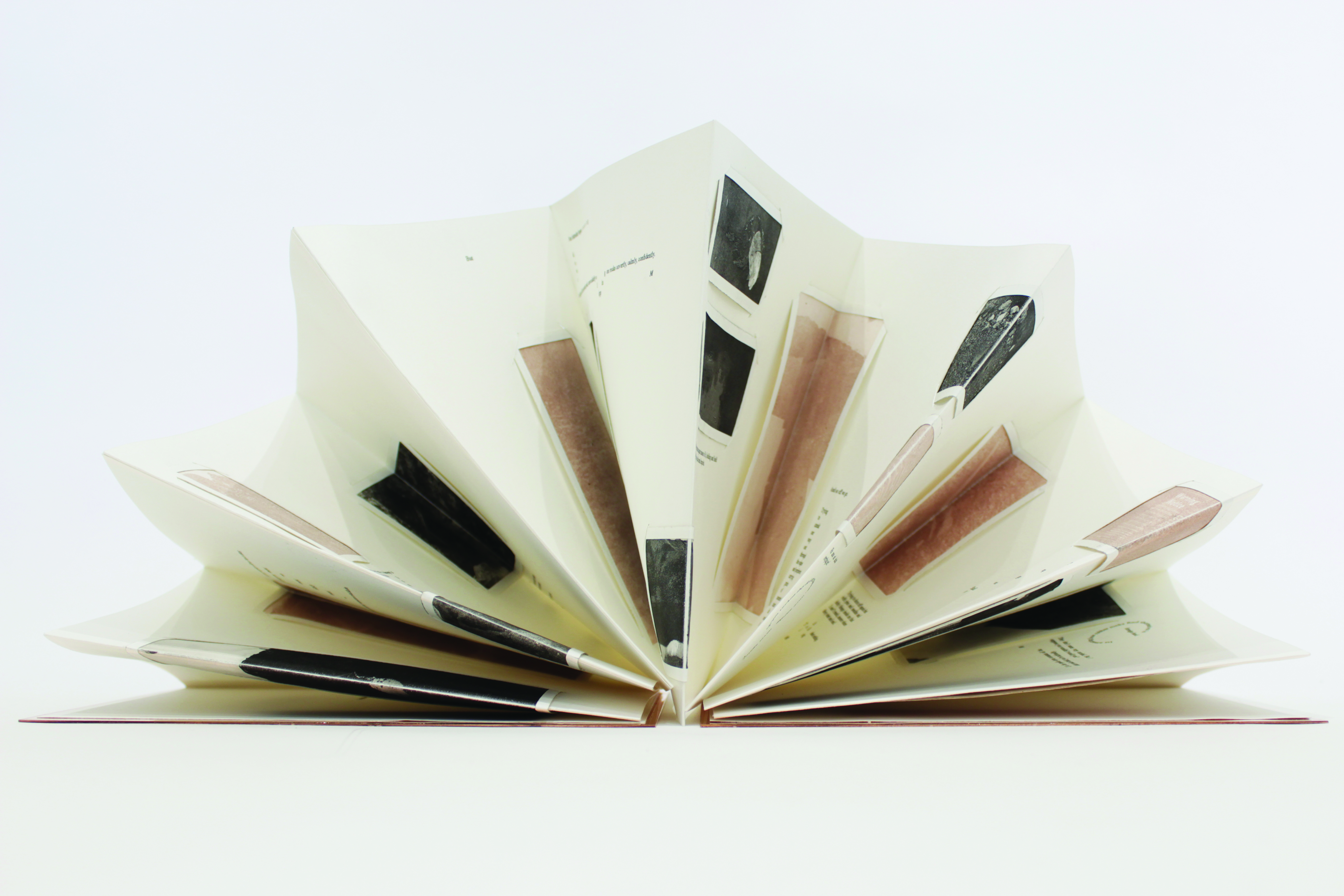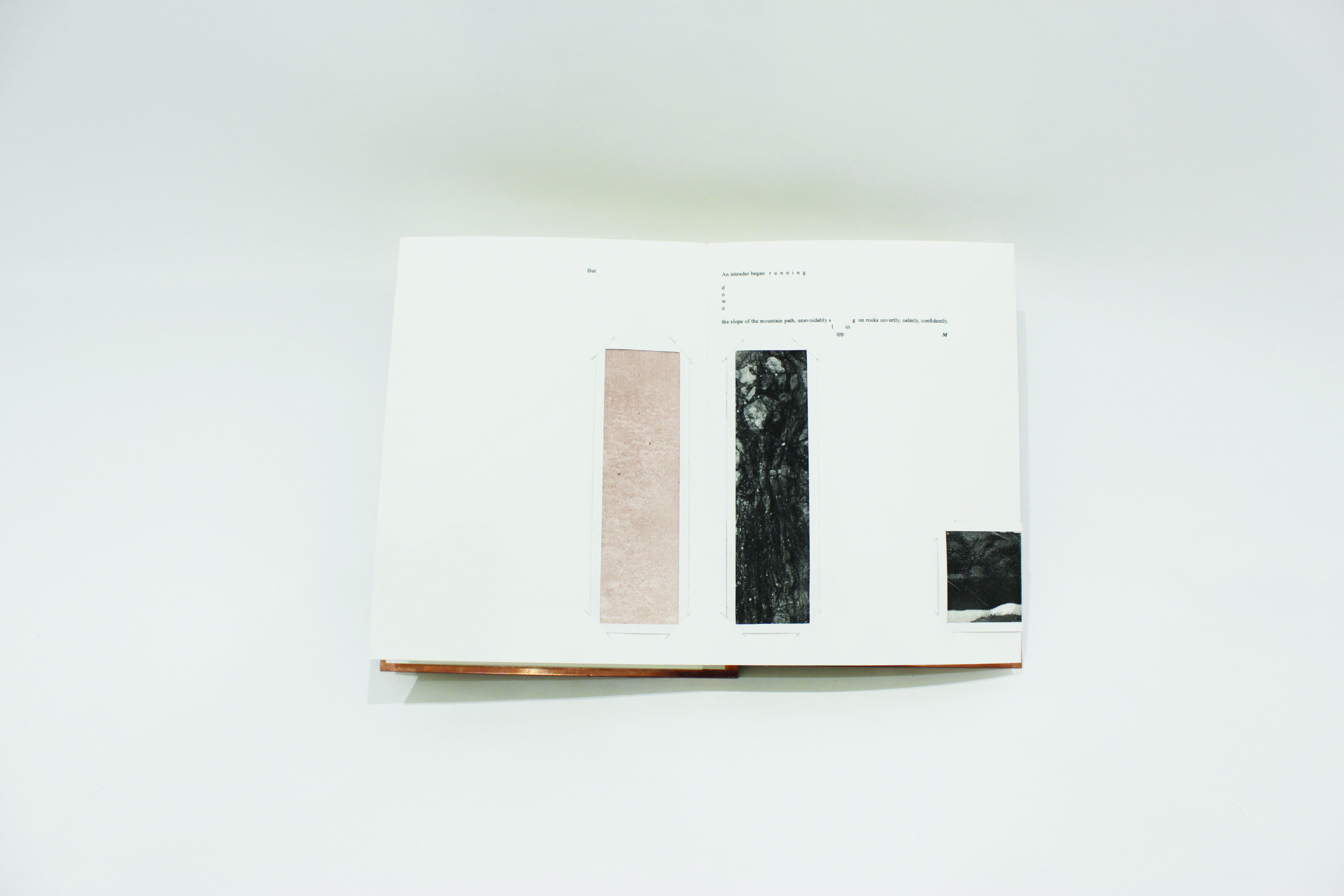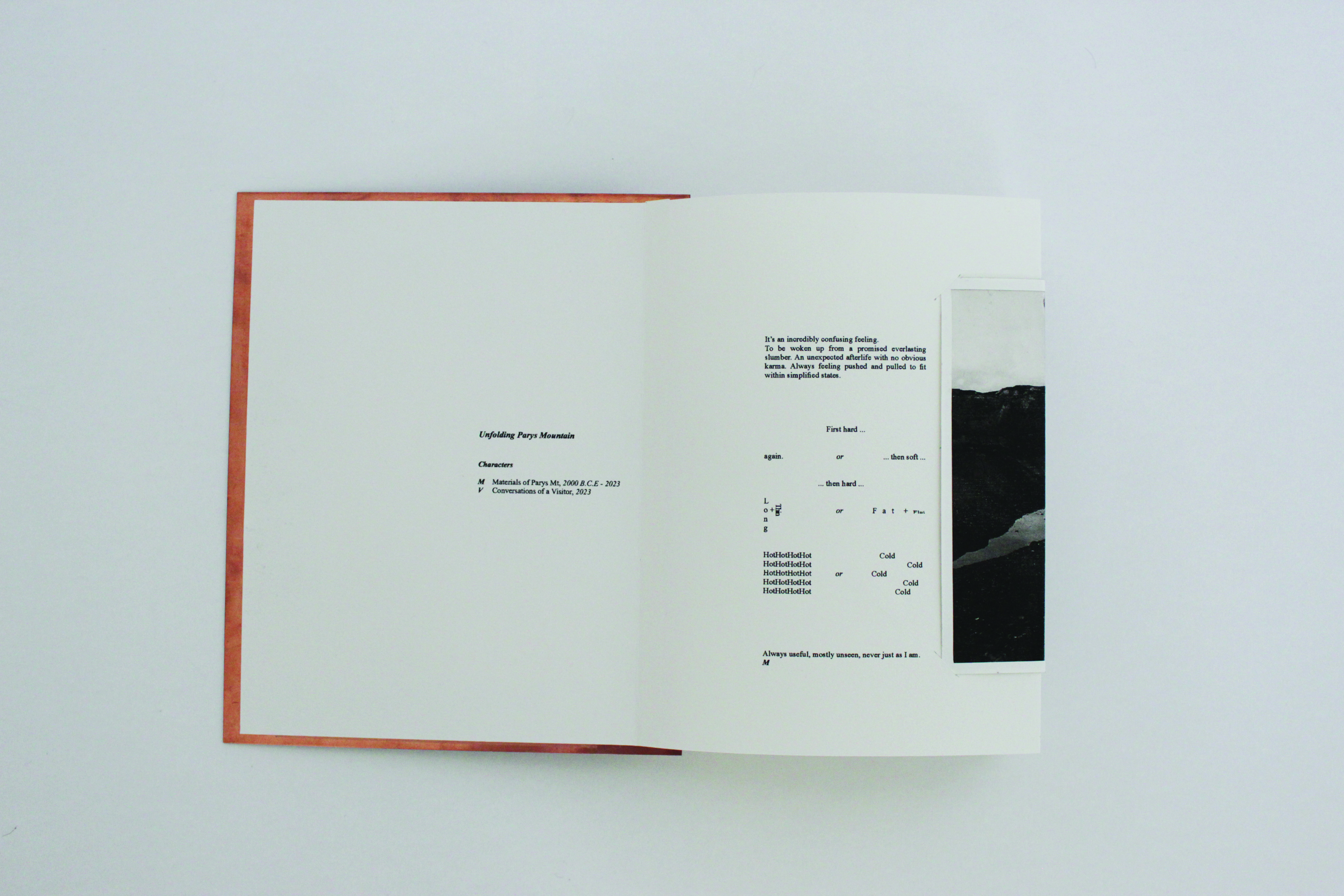 I use photography, printmaking and publishing to explore the contradictions of copper extraction in Parys Mountain. A concertina book holding multiple limited edition intaglio prints depicts the paradoxical moments of this landscape. The prints use ink I fabricated from copper pigment collected at Parys Mountain and linseed oil. The images are of the landscape and made from the landscape. Traditional F66 prints clarify the tales of the copper ink prints. The prints exist in tandem with an experimental writing piece, written from the dual perspectives of a Visitor and the Materials of Parys Mountain, challenging copperâs historical role in the linearity of storytelling and in the history of mass-produced printmaking. The page fold is both the site of the image and that which interrupts the image, highlighting the unfolding of a landscape that consists of combatant processes. Recycled and reusable copper plates bind the book.