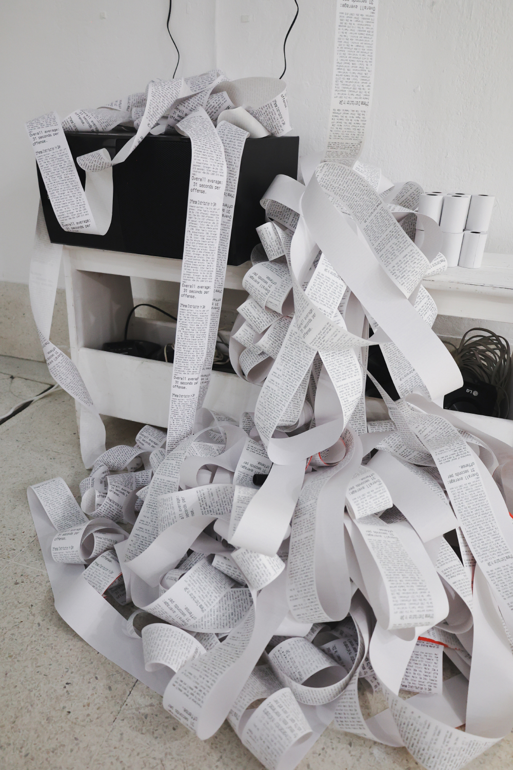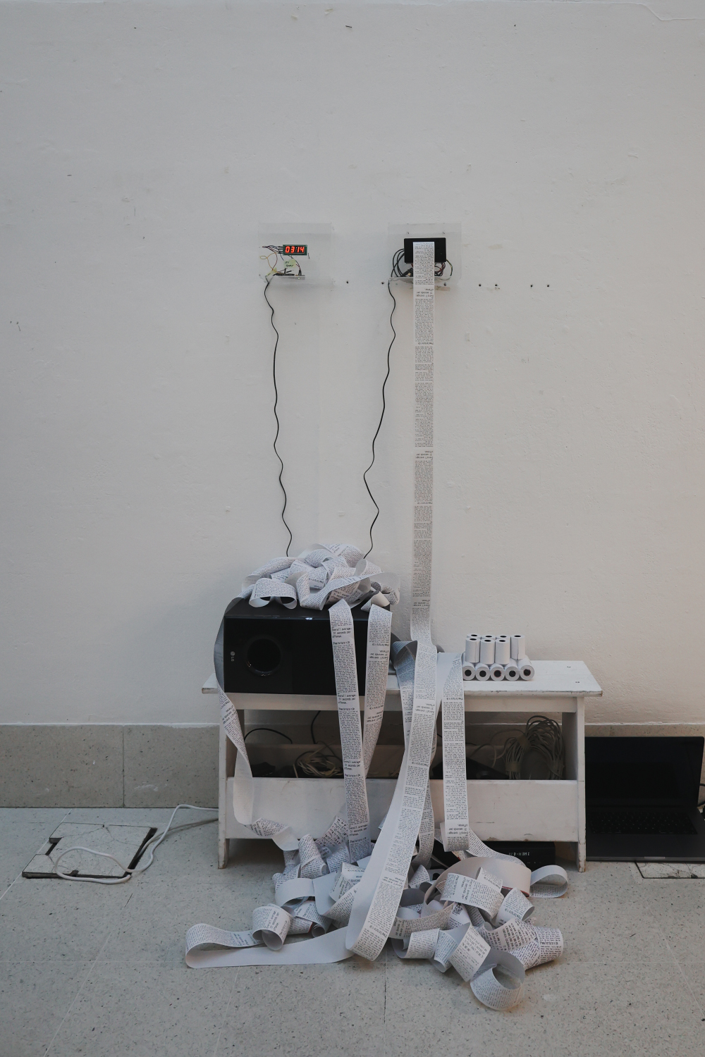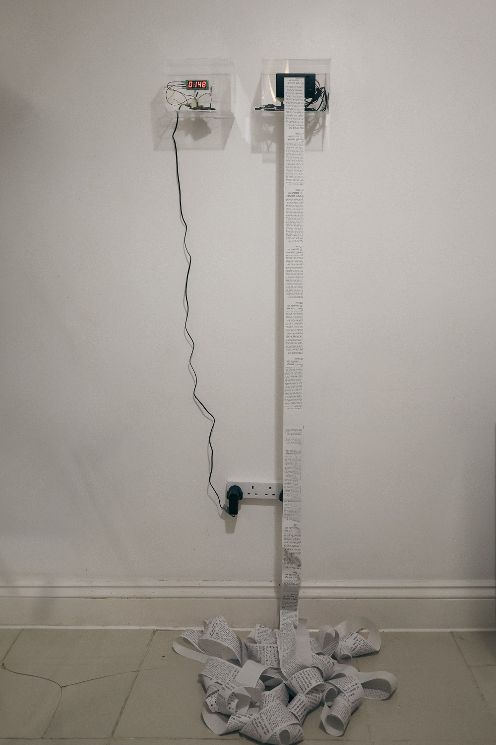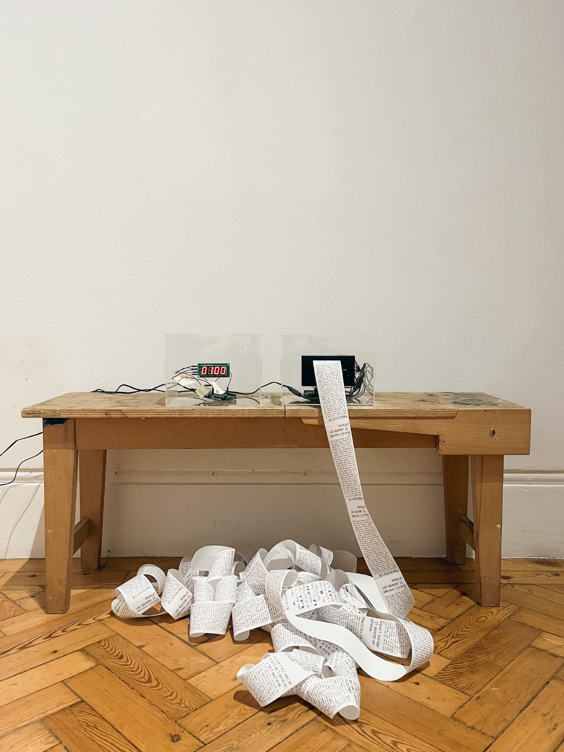 The piece is centred around the pressing issue of sexual assault in our contemporary society. By actively confronting the audience with the disturbing realities of sexual violence, it seeks to highlight its omnipresence in our lives. Influenced by artists and articles addressing sexual violence, the project is based on a report from the UK government detailing the prevalence and characteristics of sexual offences in England and Wales for the year ending March 2022. The project features a sound installation and a digital tally that increments every 31 seconds and represents the frequency of sexual assaults in England and Wales. A thermal printer outputs the statistics on victim-perpetrator relationships and the distribution of the violence, formatted in minutes and seconds. The continuous sound loop symbolises the ongoing nature of the problem. The installation is designed to run indefinitely, signifying the never-ending cycle of sexual violence in our society. This approach encourages viewers to confront the uncomfortable realities of sexual violence and aims at breaking the silence surrounding these issues, encouraging open conversations.