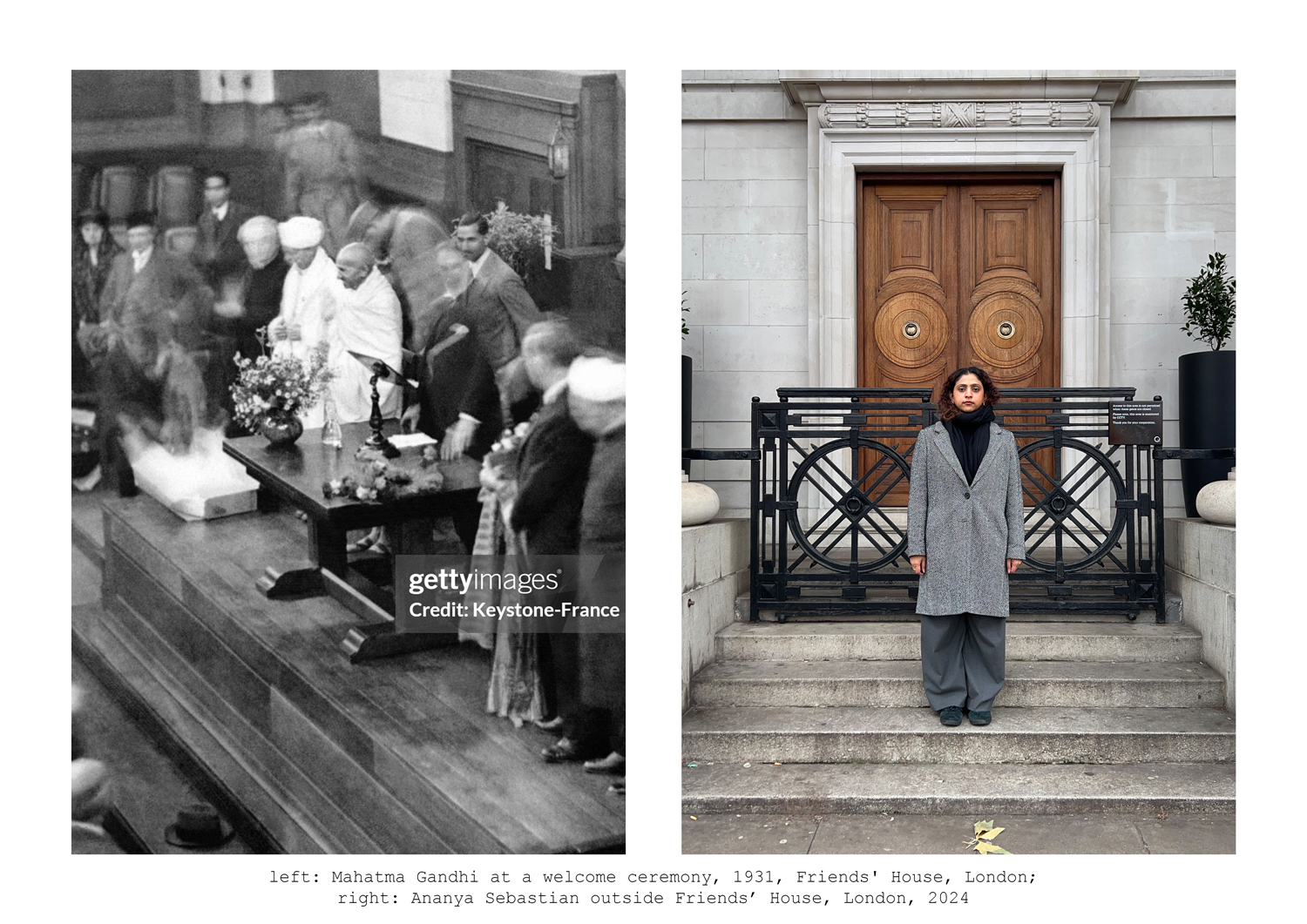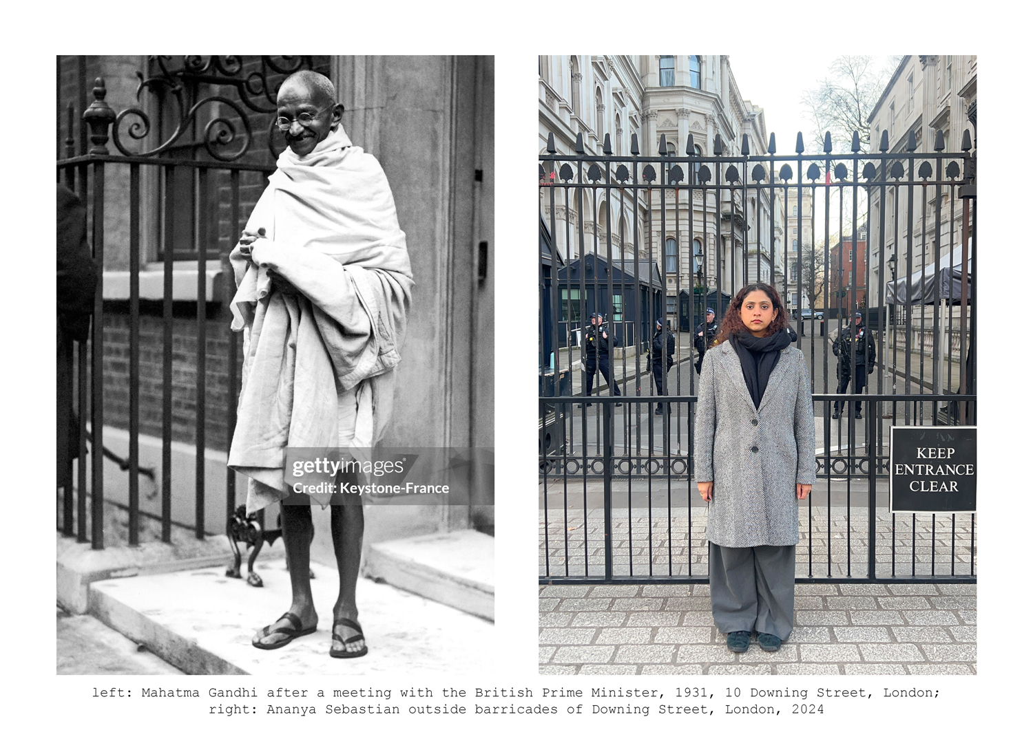 Drawing from Ariella AĂŻsha Azoulay's concept of errata in retro-prospect, my work re-examines imperial violence and challenges the notion that history is fixed. Gandhi's rejection of power, embodied in his humble image, demonstrates that authority can still be wielded through simplicity. Through this project, I aim to reclaim archival imagery, creating a dialogue between past and present, and questioning who is allowed to occupy spaces of power today.