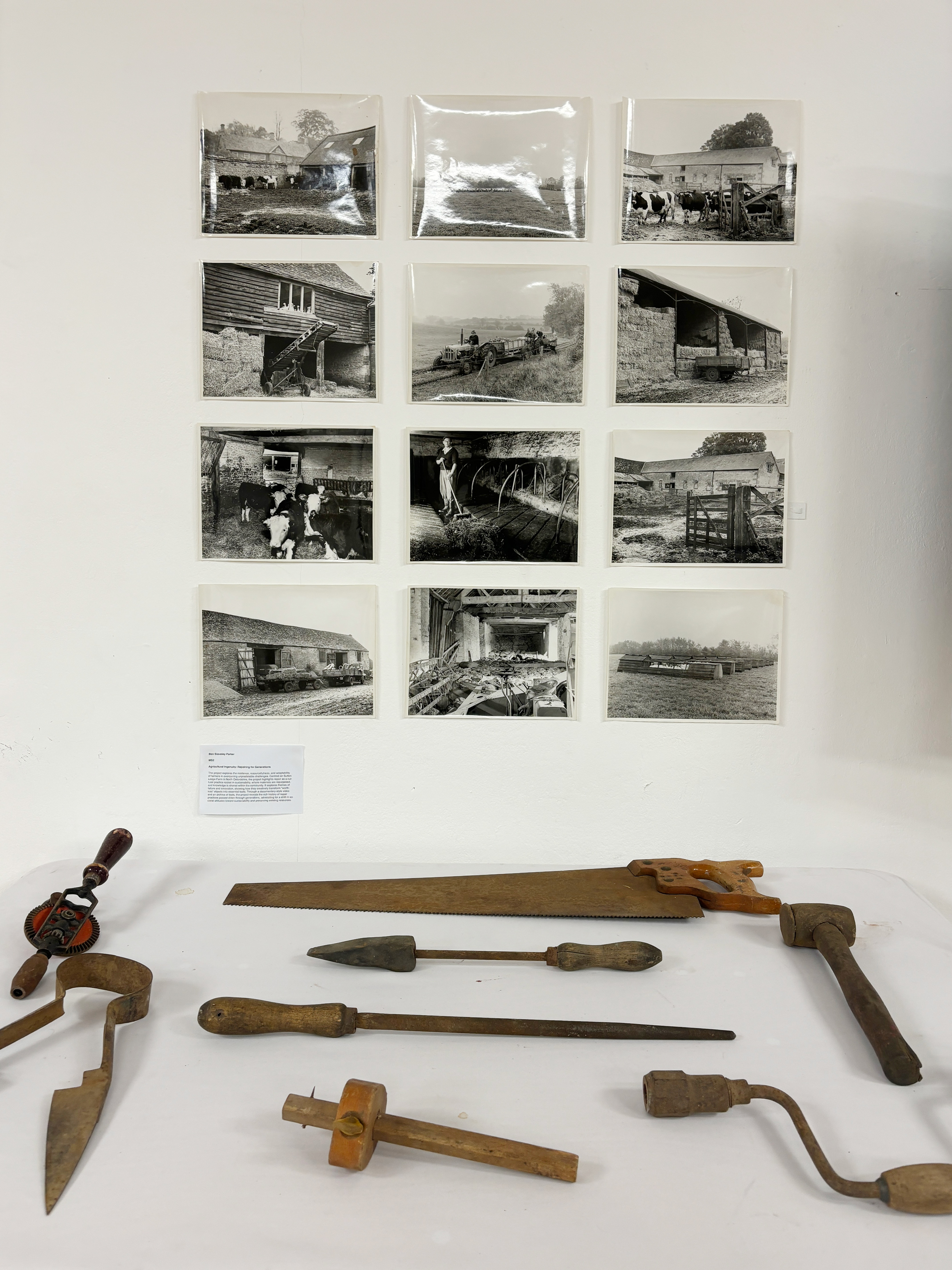 The project references a particular case study being Sutton Lodge farm in North Oxfordshire. From this case study I have analysed the various repairs that have happened on the farm, the techniques of these repairs, the location, situation and history behind the repair. The project seeks to inspire a shift in how people perceive broken and repair by visually showcasing the innovative repair practices of farmers. I began by photographing the farm’s repairs, repair sites, and materials, and exploring a photographic archive of my family’s past farms. I then started experimenting with plaster casts of repair joints found on the farm. Initially, I considered welding a sculpture using metal pieces collected from the farm. However, I ultimately decided against this approach, as it conflicted with the core idea I aimed to convey -repurposing and preserving materials for future repairs rather than removing them from their intended practical use. I concluded the final project will consist of a documentary style video displaying an insight into a farmer’s perception of repair, the techniques and tools used, and examples of previous repairs. Accompanying the video will be an archive of tools used on the farm, highlighting both those still in use and others that have become obsolete over time.