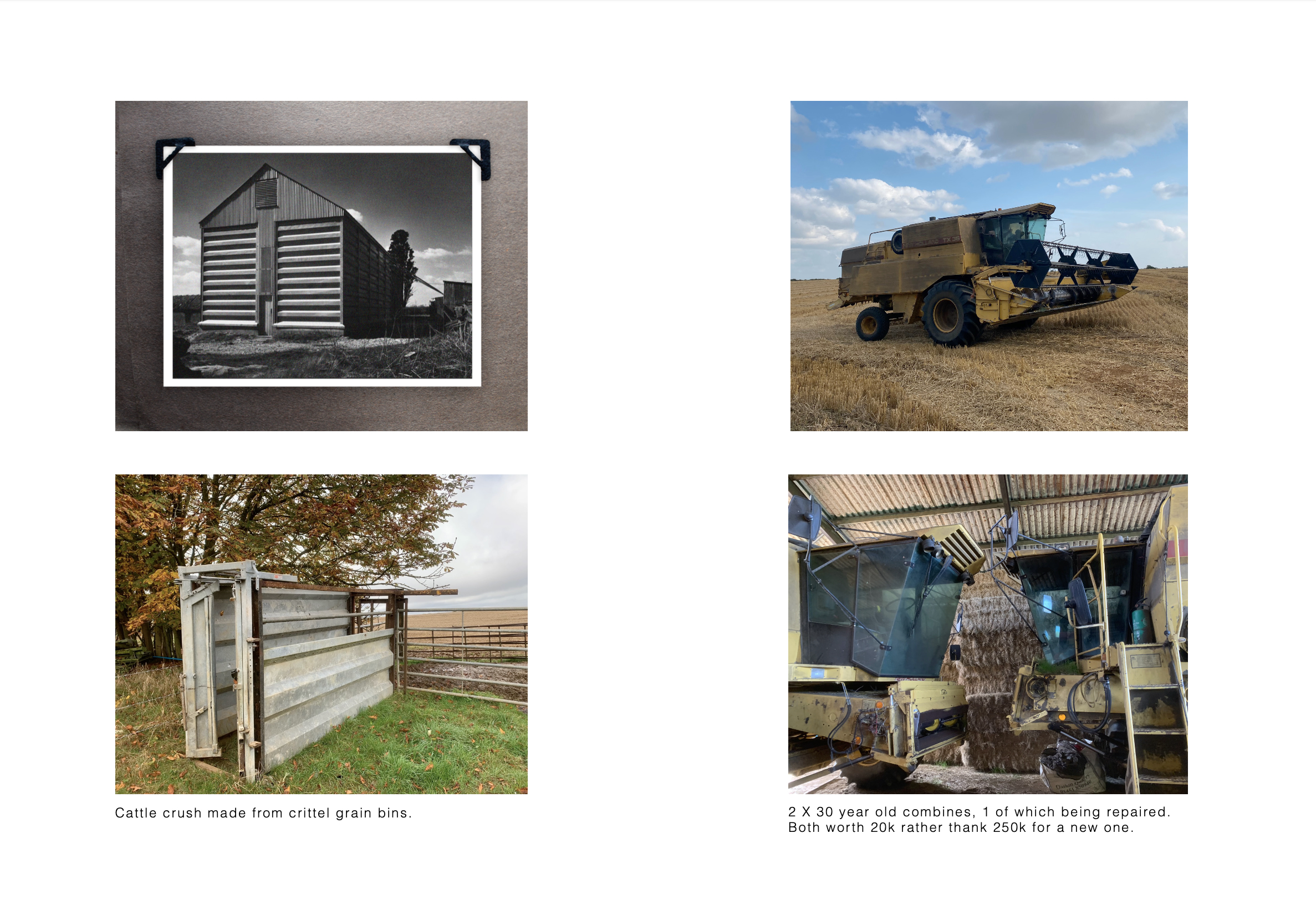 The techniques and tools of repair can evoke a sense of place on a farm but are not tied to that specific location. This became clear to me from seeing my family move from farm to farm. Most people when moving house would aim to clear out items of disregard yet farmers move every part of the farm without throwing anything away. I have been documenting these items looking into the farms’ workshops which contain all sorts of different sized pieces of scrap metal, nuts and bolts, and machinery parts. This stems from the unpredictability of external factors such as weather (fixing a combine during periods of limited sunshine) and breakdowns which means that it is common for farmers to keep objects that most consider of no value. They recognise that these objects could one day prove invaluable for making quick, effective repairs, ensuring that essential work can continue without interruption. For farmers, repair is not just a one-off action done to appear environmentally conscious, it is engrained in their culture.