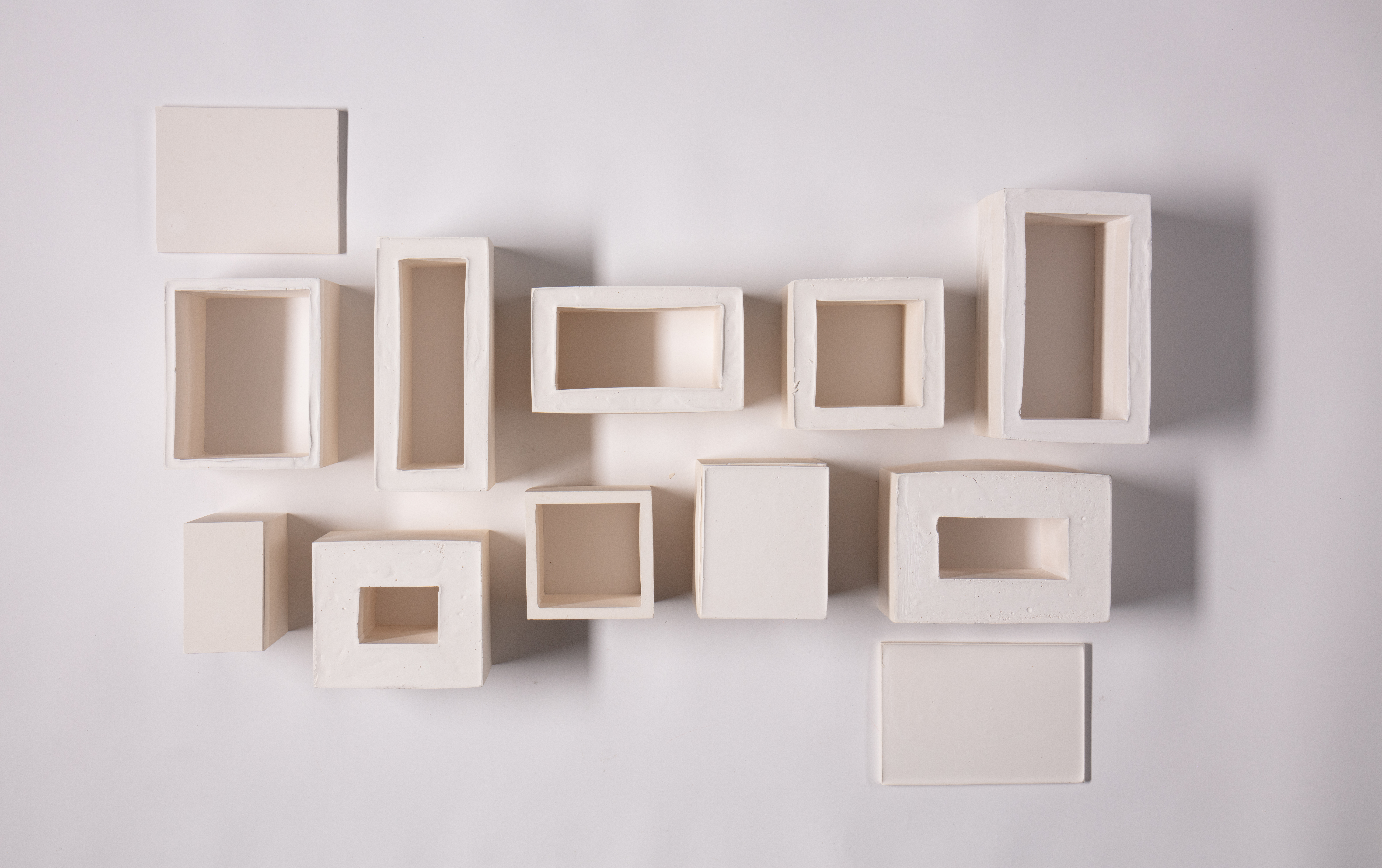 In this piece, I present ten boxes of varying sizes. Some are heavy, while others are light; some have thick walls while others are delicately thin. Certain boxes are closed while others remain open. All are cast in a fine plaster, a material that appears sturdy at first glance, yet carries an inherent fragility, reflecting the delicate nature of knowledge and memory. These arks are imperfect. They are neither pure white nor perfectly formed, standing in stark contrast to the pristine craftsmanship described in the Torah.